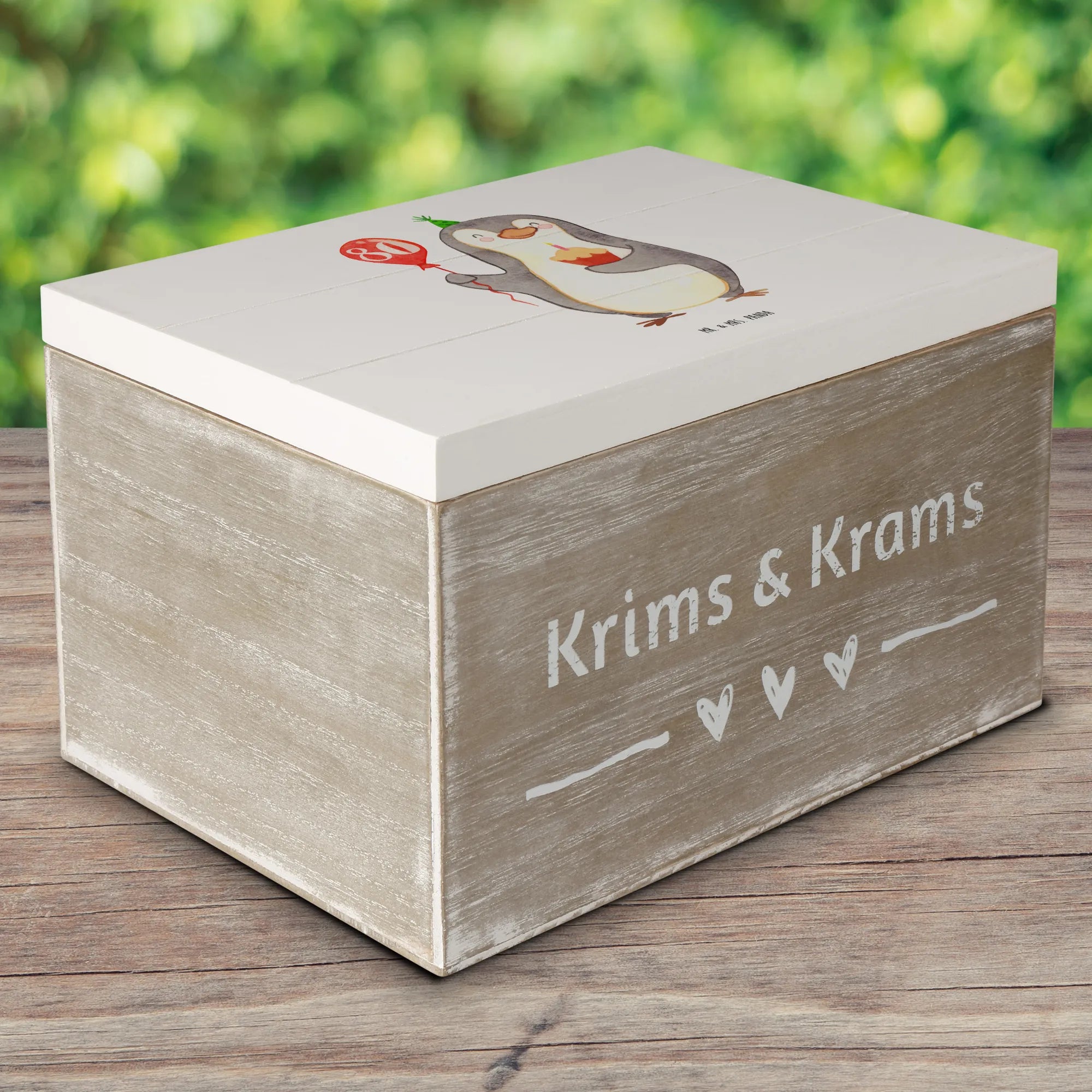 Wooden chest 80th birthday Penguin Balloon - 22 x 15 cm - with saying