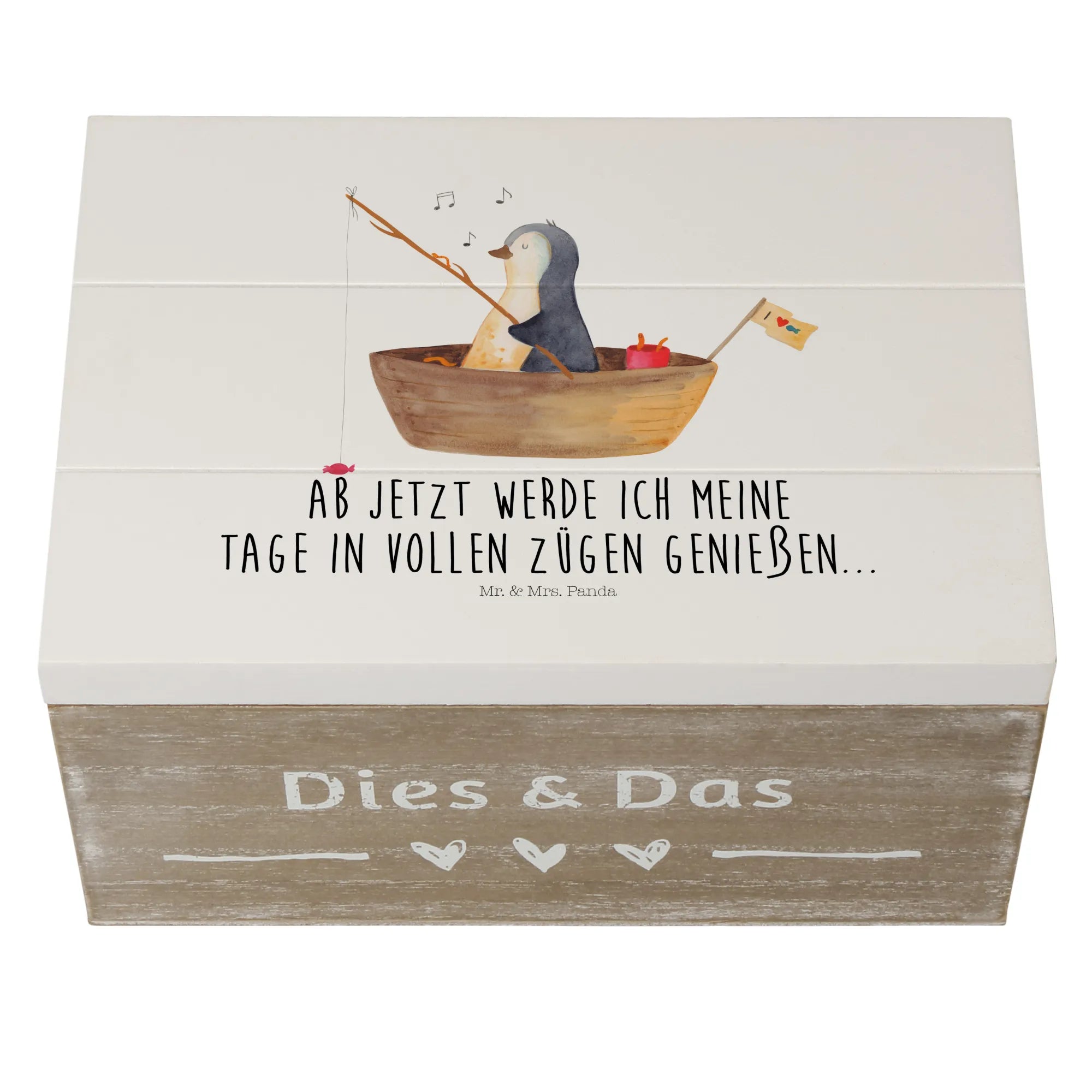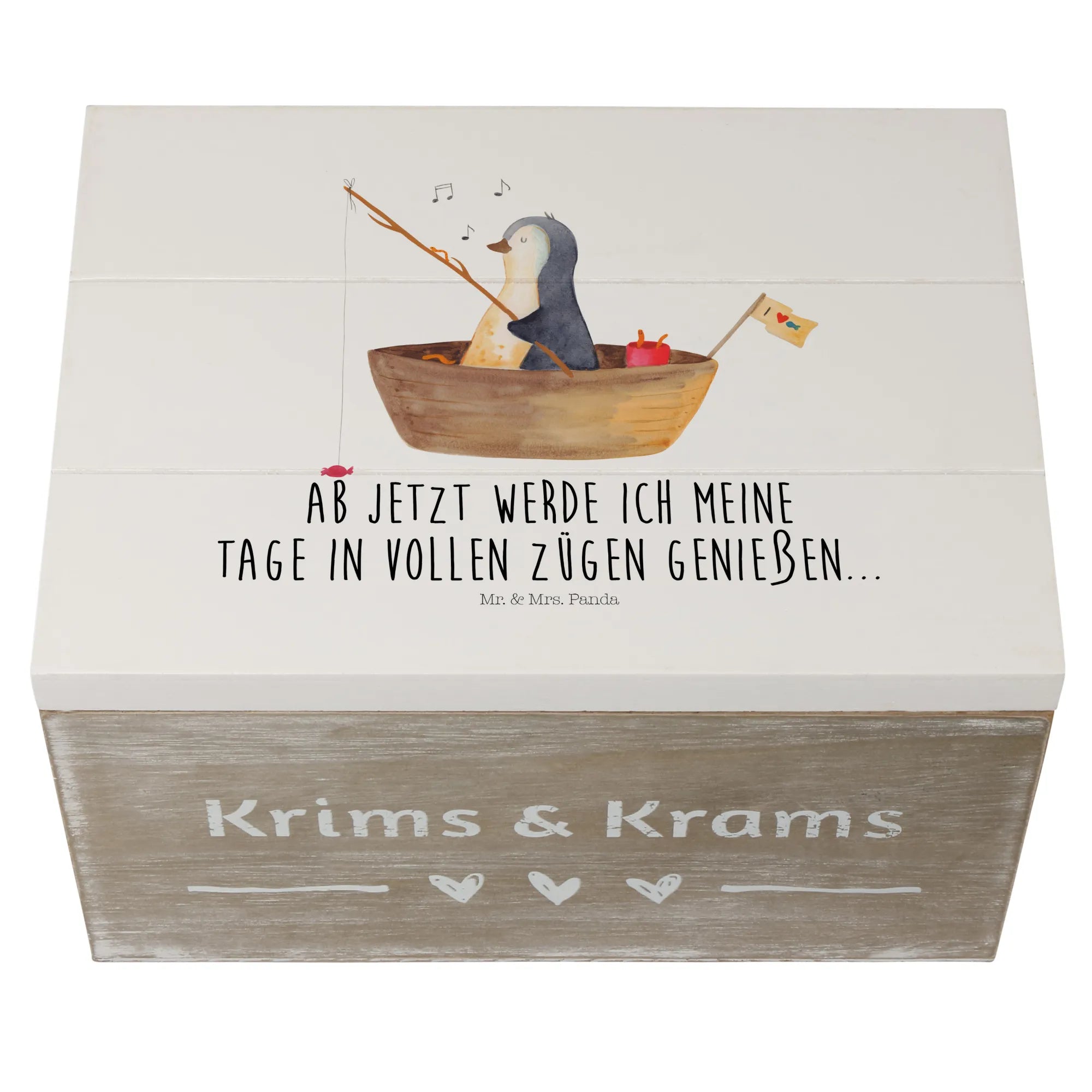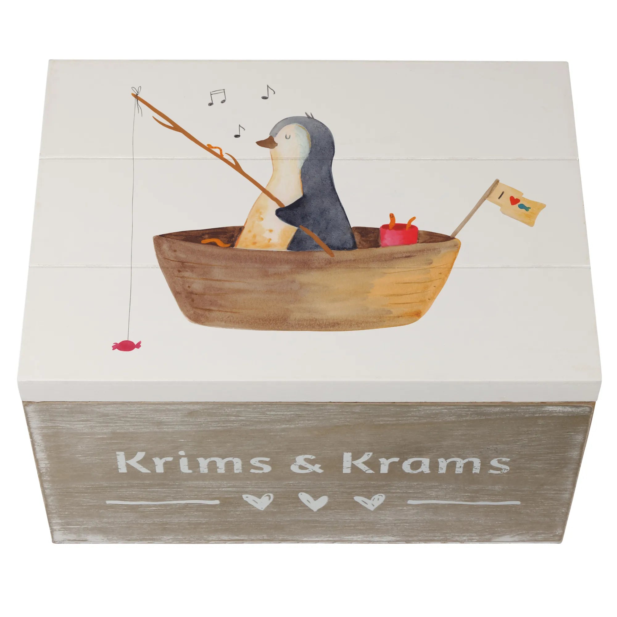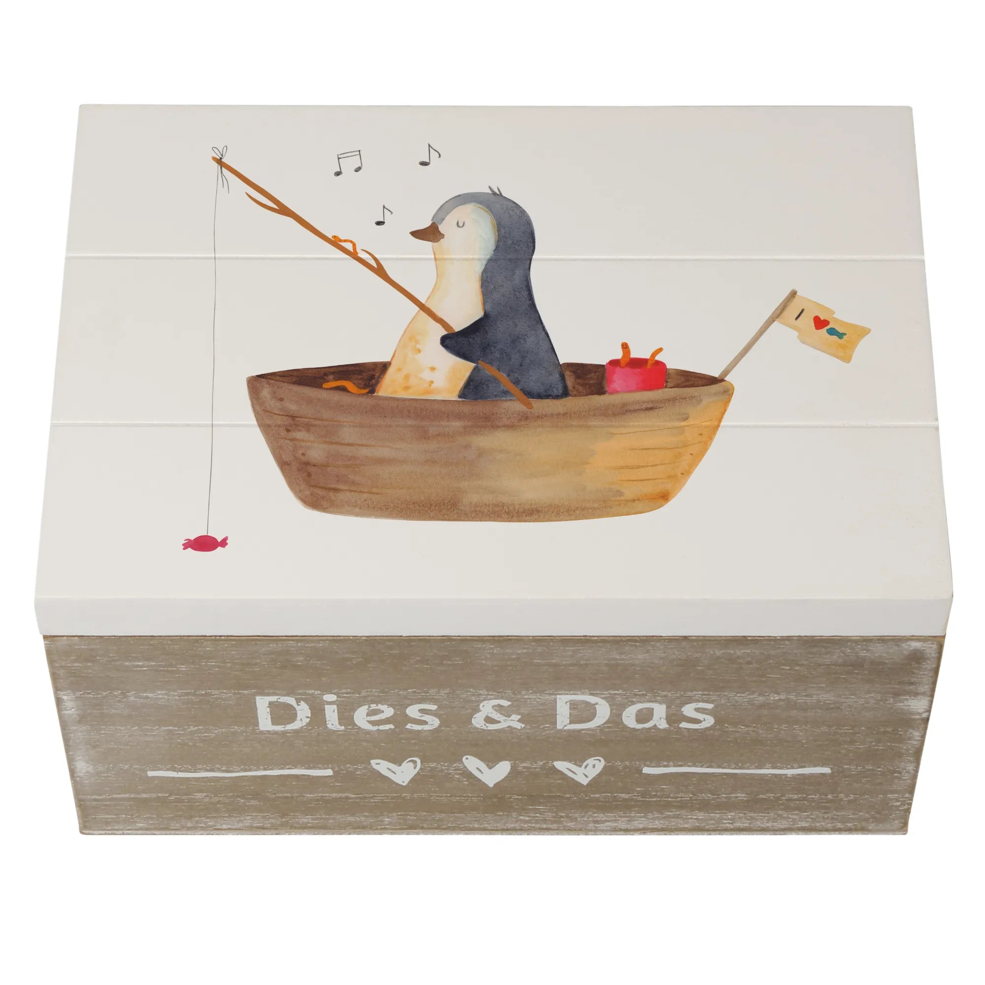 Wooden chest Penguin fishing boat - 22 x 15 cm - with saying - White