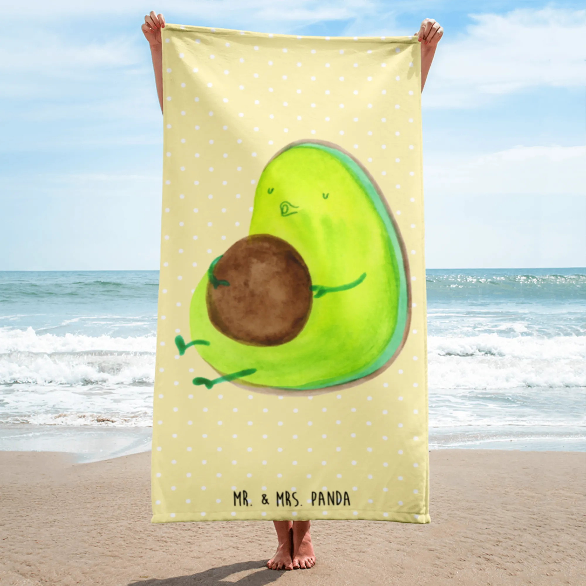 As for care, it's a breeze to maintain. Simply toss it in the washing machine at 30°C, and it's good as new! The exciting blend of beautifully printed colors on the towel creates a splash of happiness in your home or beach setup, making it a lovely addition. Elevate your relaxation game with this oversized, soft, and charmingly designed towel from Mr. & Mrs. Panda's Avocado collection today! Perfect as a spa towel, a beach companion, or a chic home accessory!