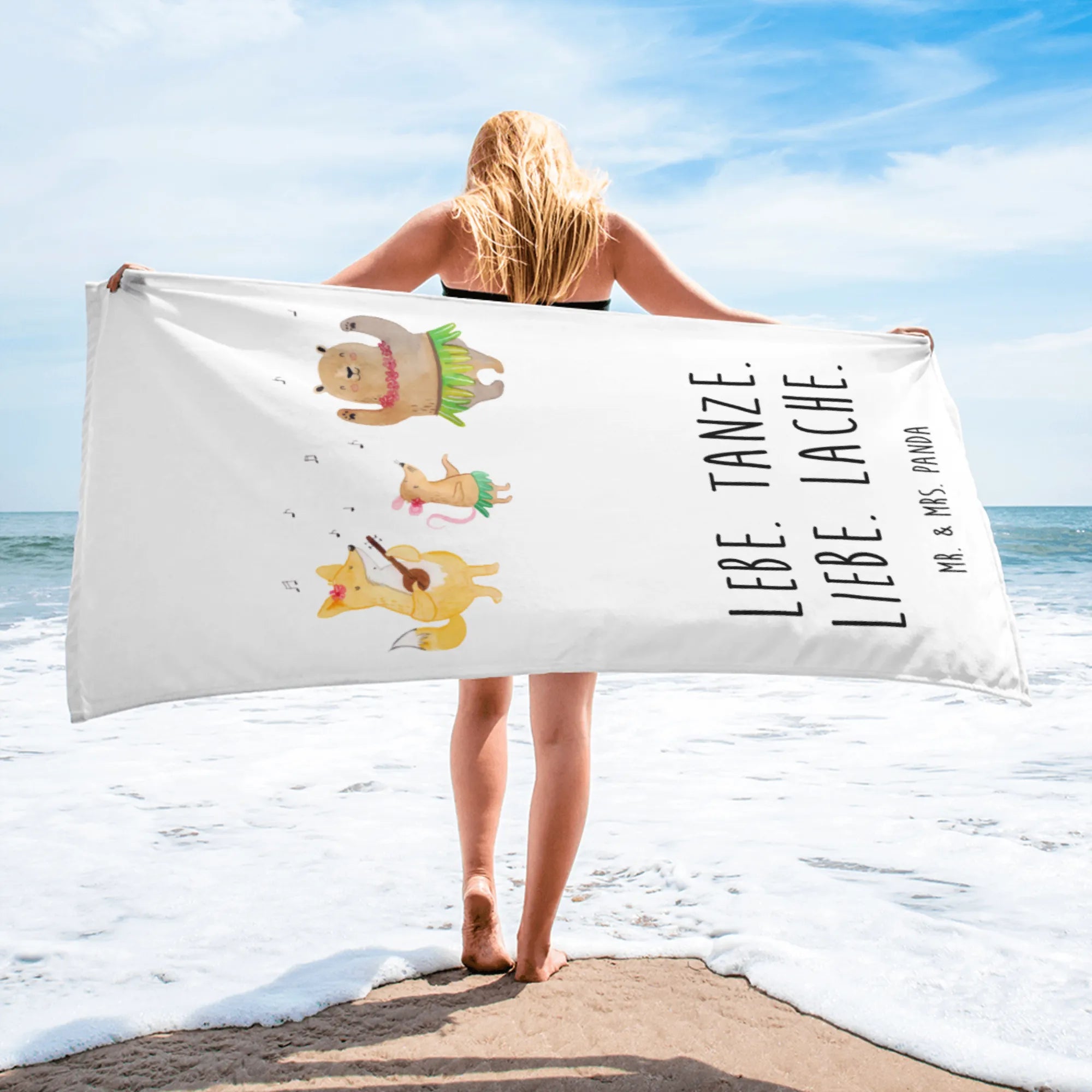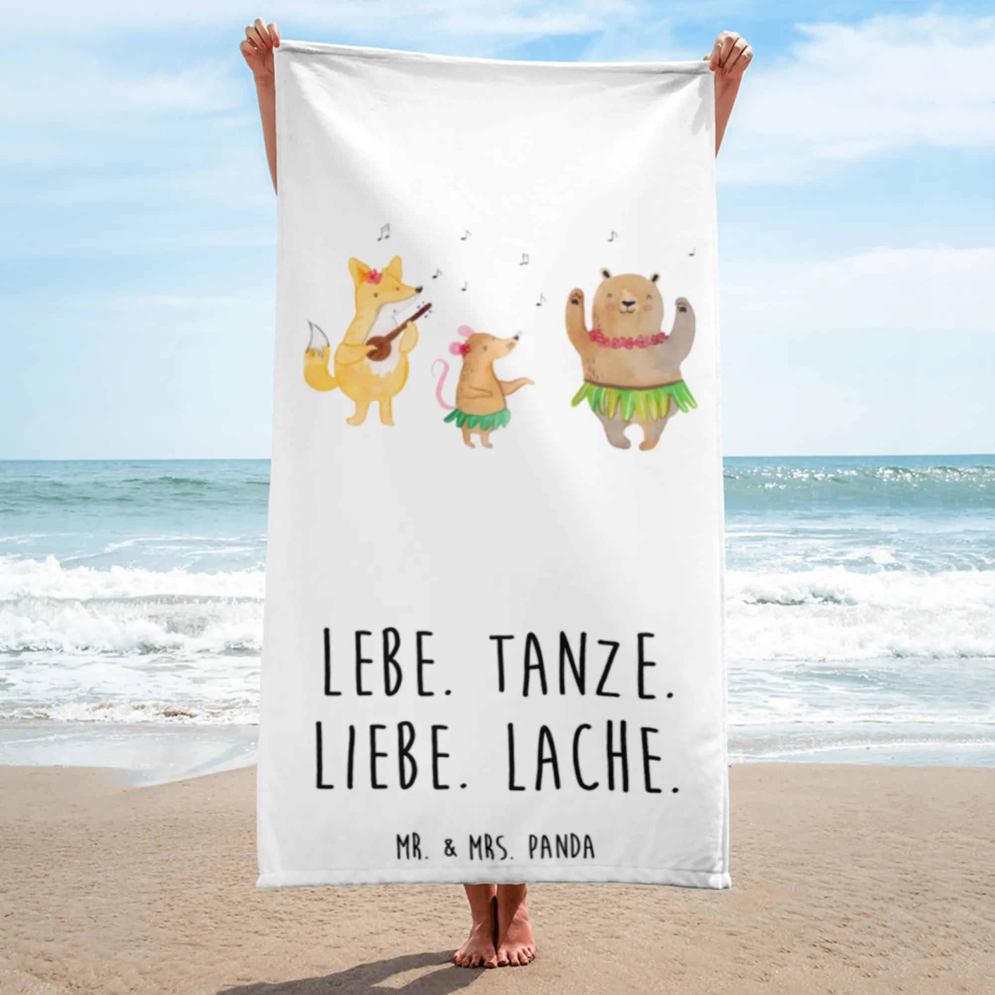 This oversized towel is not just a practical item; it's a vibrant celebration of life, laughter, and love. Adorned with charming illustrations of forest animals like bears, rabbits, and hedgehogs frolicking in Hula skirts, it instantly transforms any beach day or spa experience into a delightful adventure.