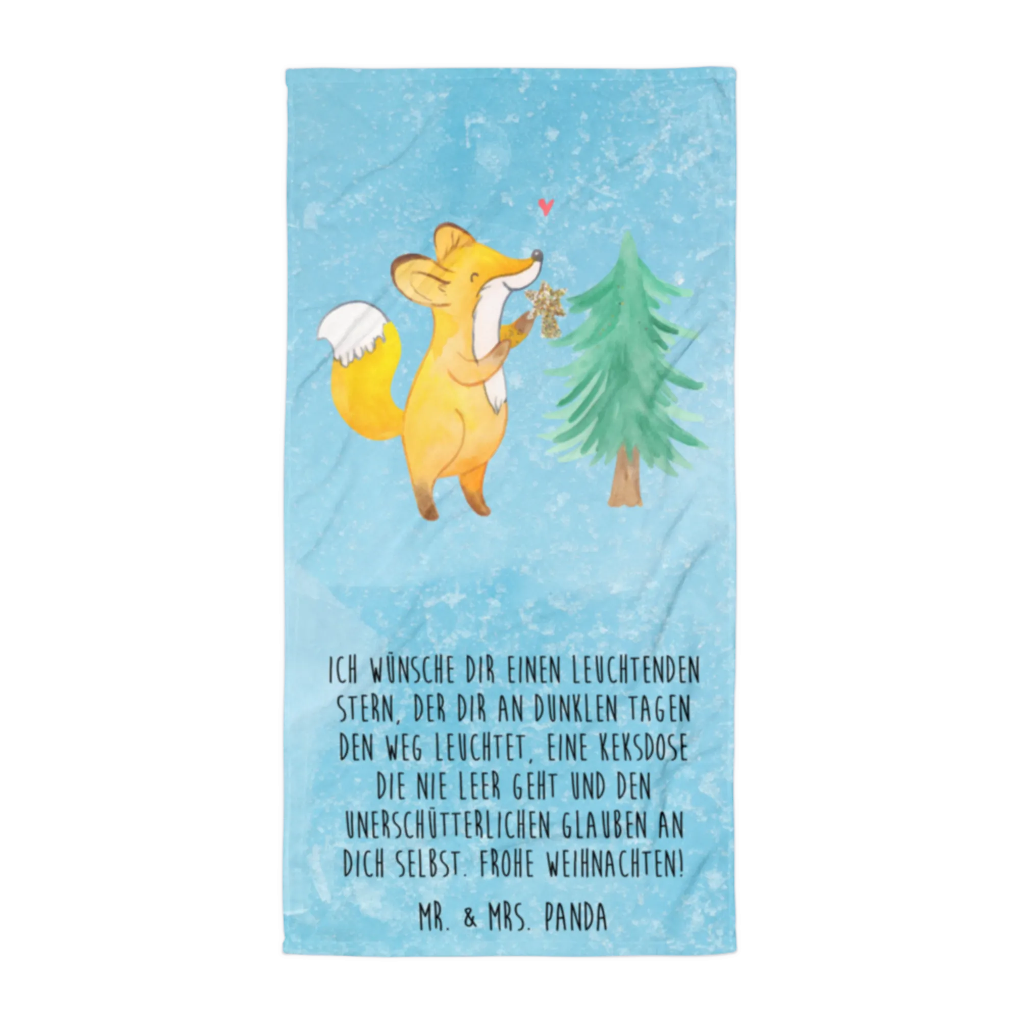 Picture a joyful winter wonderland where a spirited fox is busy decorating a Christmas tree with such enthusiasm. Holding a golden star in its paws, the fox prepares to ensure that this tree shines its brightest on Christmas Eve. Above, a loving heart adds a sweet touch to the vibrant holiday scene, evoking warmth and happiness. This motif invites you to embrace the festive spirit of Christmas days with love and joy. "I wish for you a dazzling star to illuminate your path, a cookie jar that never empties, and the unwavering belief in yourself. Merry Christmas!"
