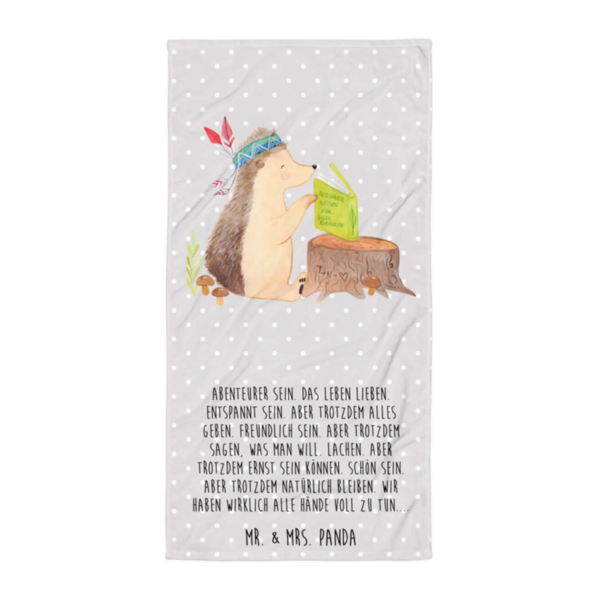 Imagine a cozy day in the great outdoors – surrounded by lush greenery, the sound of crackling campfires, and good company. This oversized beach towel, beautifully adorned with a whimsical hedgehog wearing feathered headdresses and sipping on an adventurous book, is perfect for every adventure-seeker, whether it’s lounging on the beach, taking a dip in a swimming pool, or cuddling up after a sauna session.