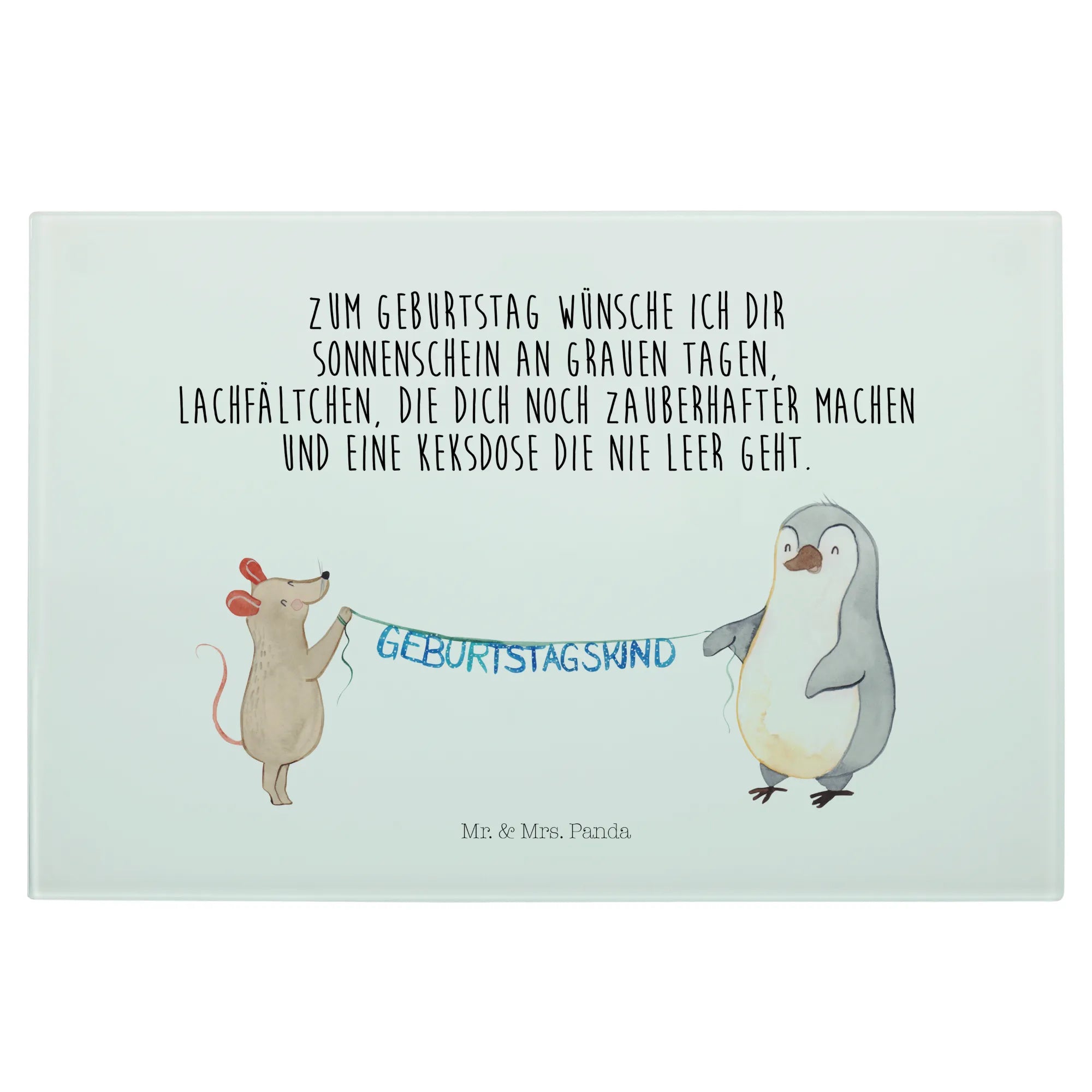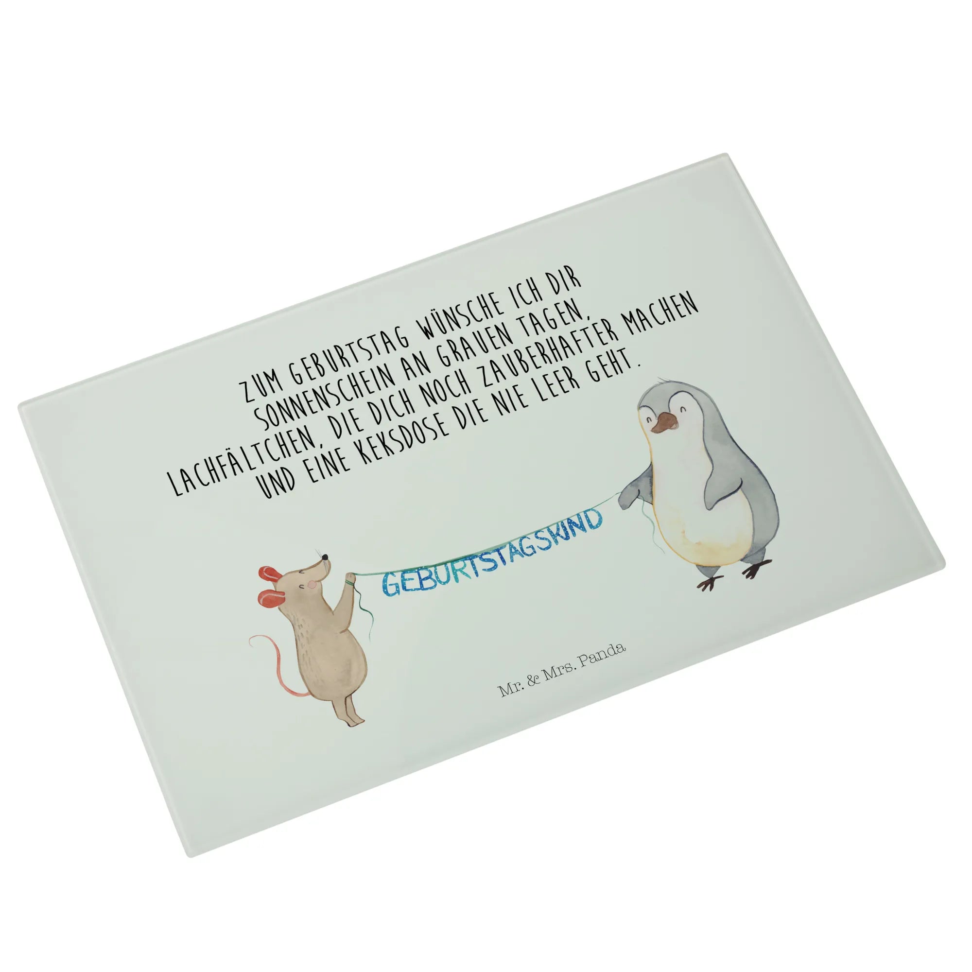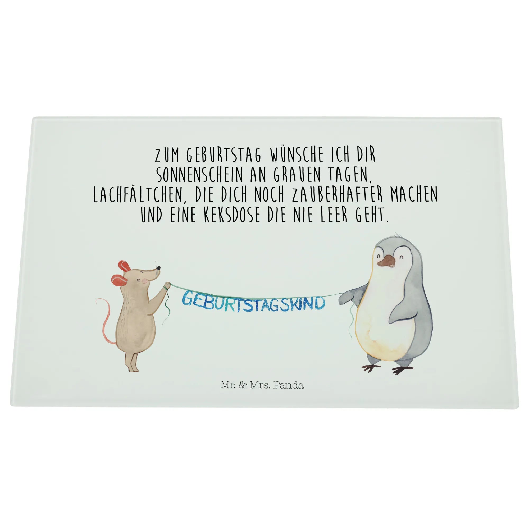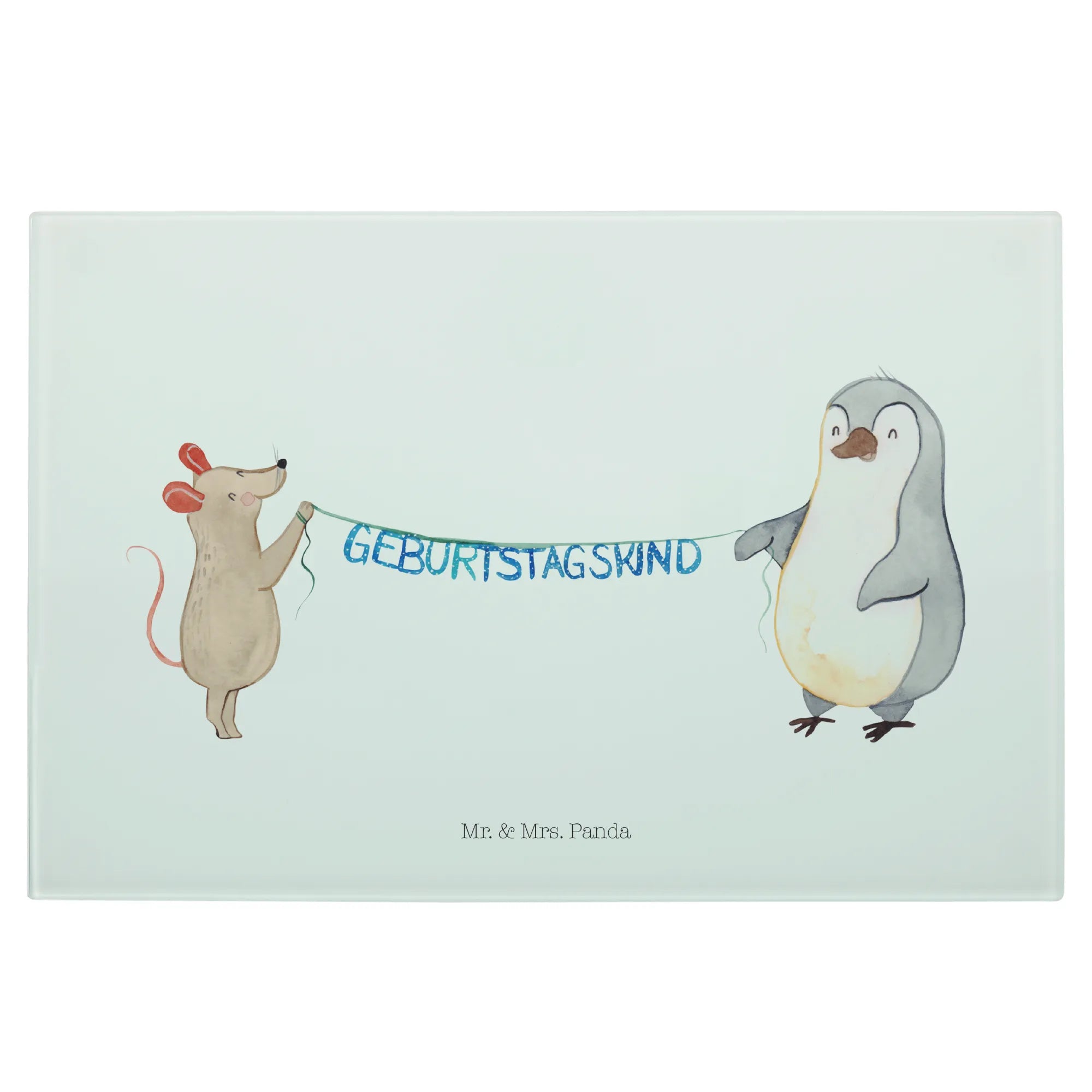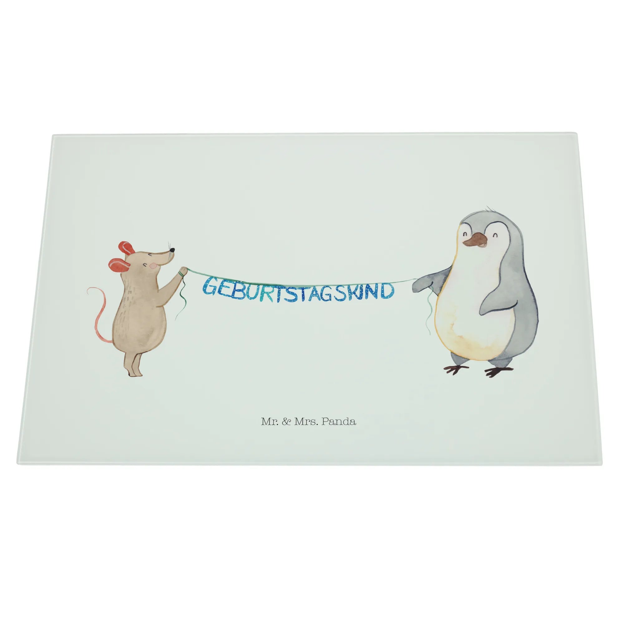 Introducing the delightful Mouse Penguin Birthday Glass Cutting Board from Mr. & Mrs. Panda, the perfect gift for celebrations big and small! This unique glass chopping board is not only practical but also beautifully designed, featuring an endearing illustration of a cute mouse and a charming penguin holding a festive garland. Ideal for those who adore animals and enjoy cooking, this cutting board adds a dash of joyful whimsy to any kitchen.