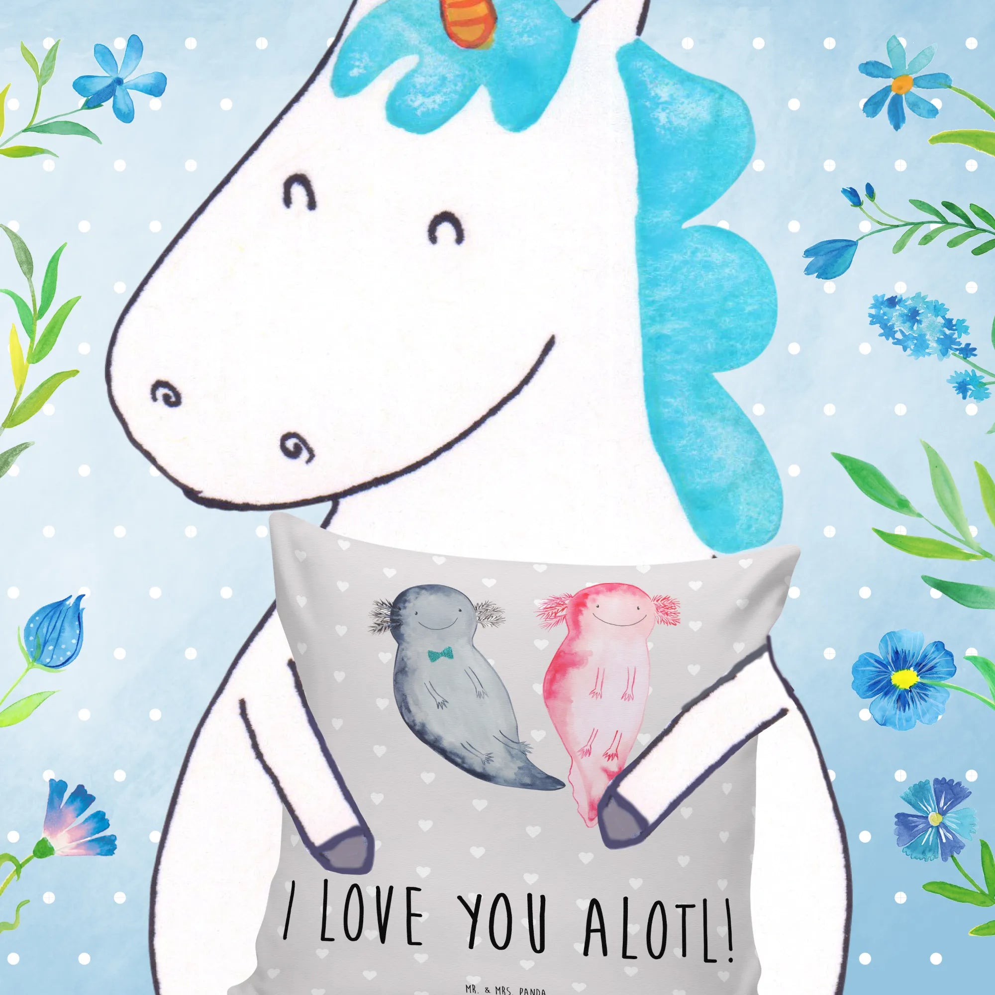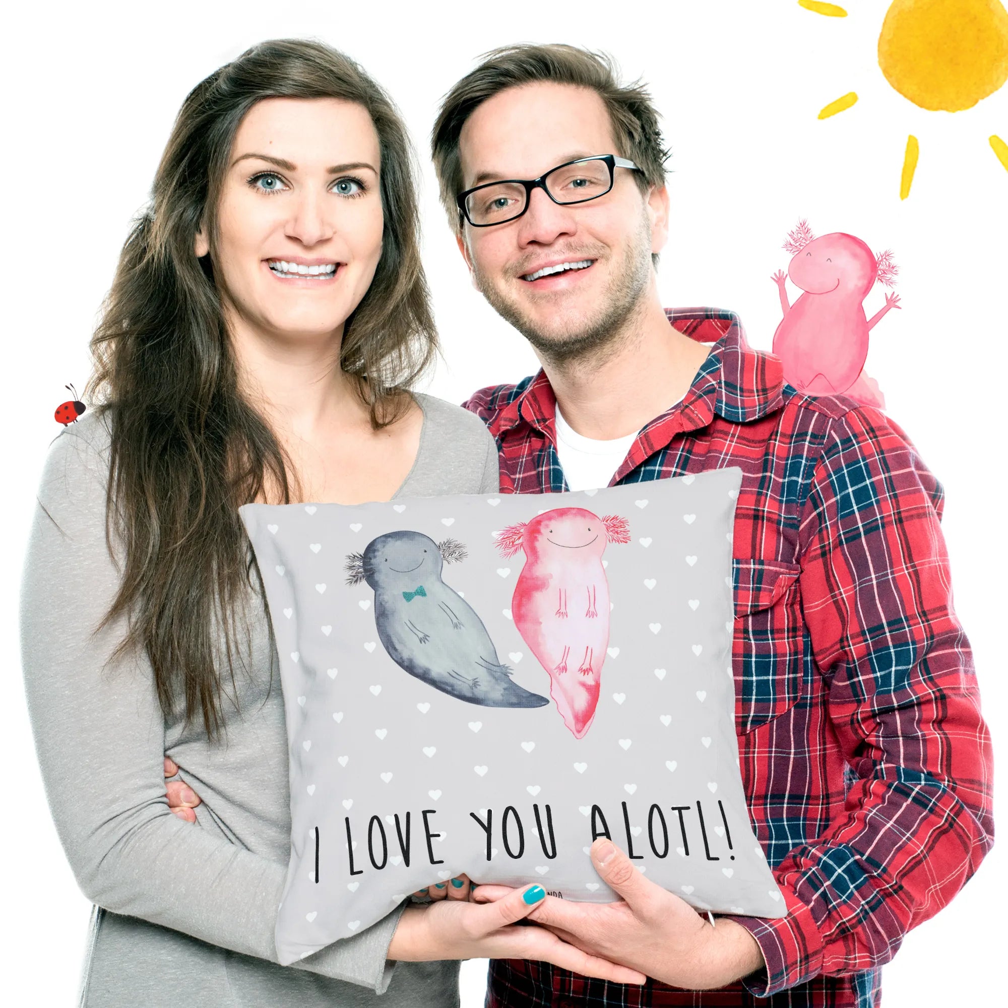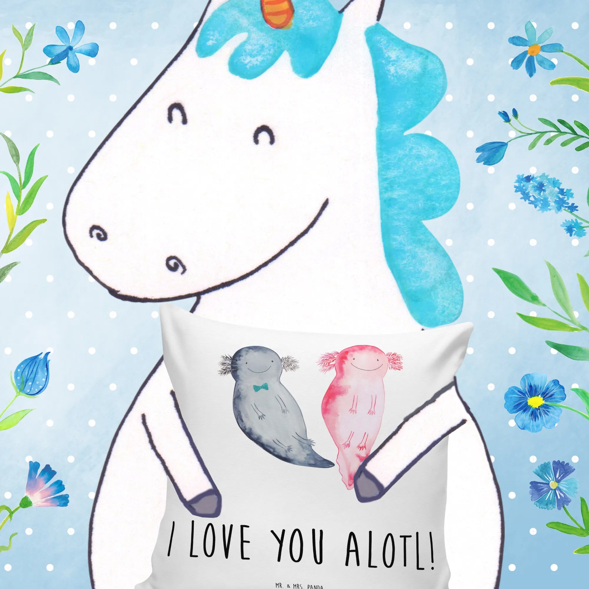 Dieses liebevoll gestaltete Sofakissen zeigt zwei bezaubernde Axolotl, die sich verliebt anstrahlen – begleitet vom charmanten Spruch „I love you alotl!”. Das Motiv stammt aus unserer Liebe-Kollektion und wurde mit viel Herz von Mrs. Panda handgezeichnet. Es eignet sich perfekt als Dekokissen, Zierkissen oder gemütliches Kopfkissen für romantische Stunden.