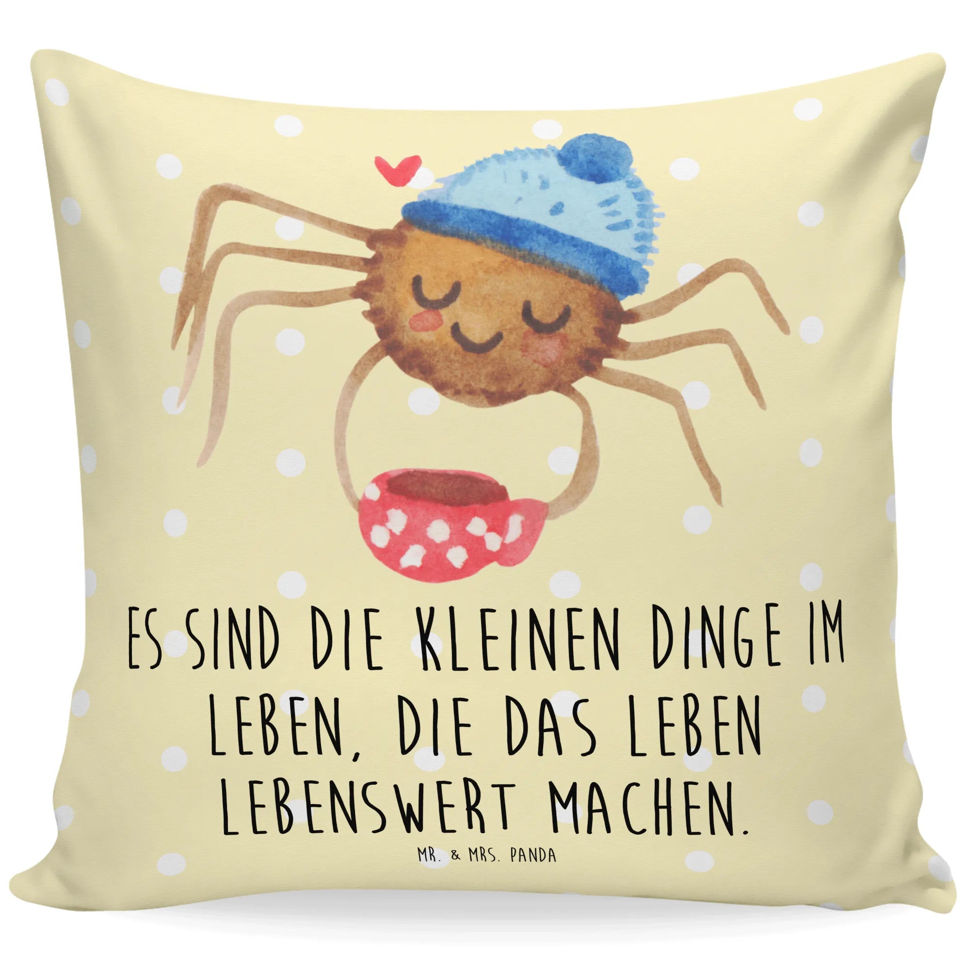 Entdecke das zauberhafte 40x40 Kissen Spinne Agathe Kaffee von Mr. & Mrs. Panda! Dieses liebevoll gestaltete gute Stück ist nicht nur ein echter Blickfang, sondern auch ein warmherziger Begleiter für dein Zuhause. Die niedliche Spinne Agathe genießt genüsslich einen Kaffee, während sie mit ihrer Wollmütze einen Hauch von Gemütlichkeit verbreitet. Auf dem Kissenbezug steht der inspirierende Spruch: 'Es sind die kleinen Dinge im Leben, die das Leben lebenswert machen.'