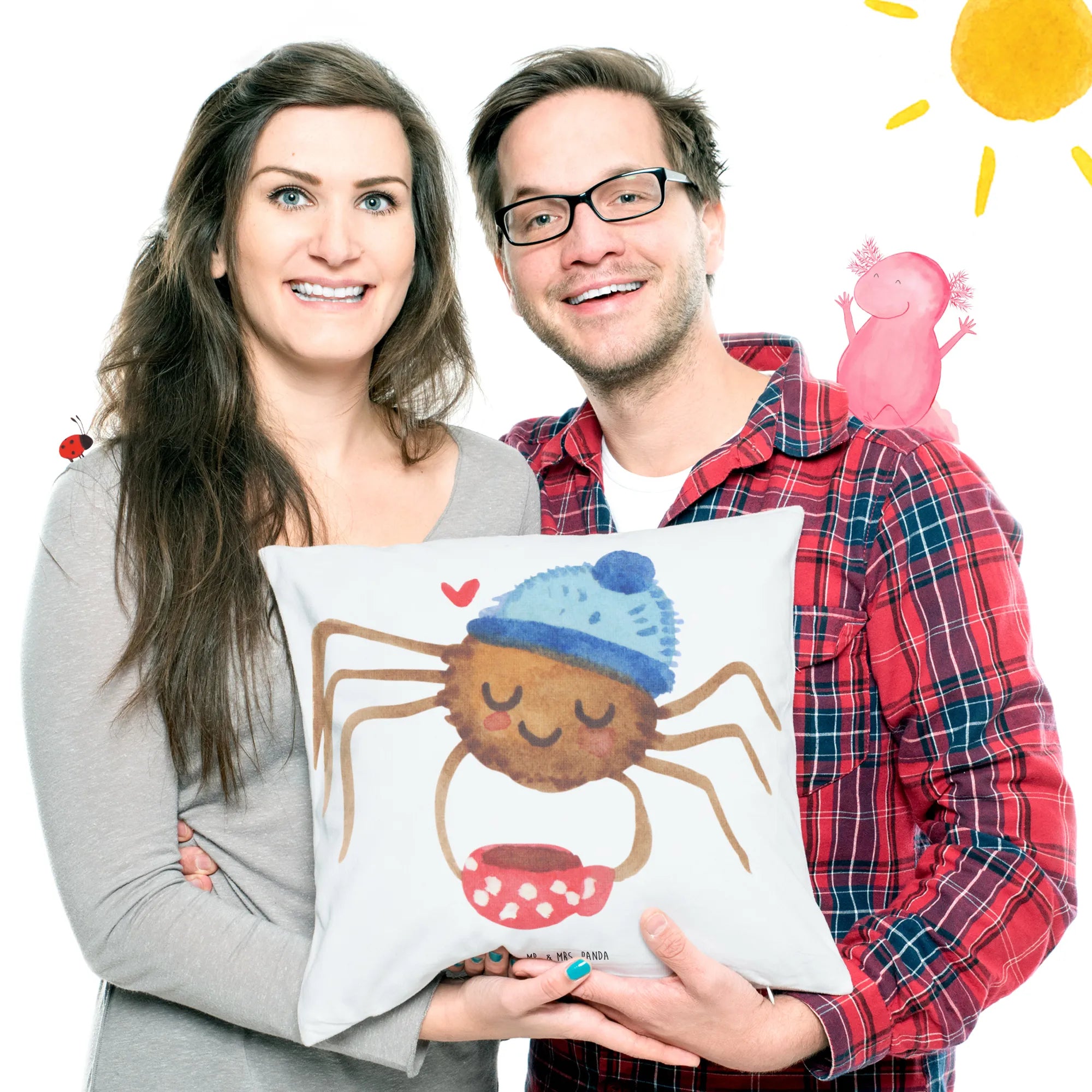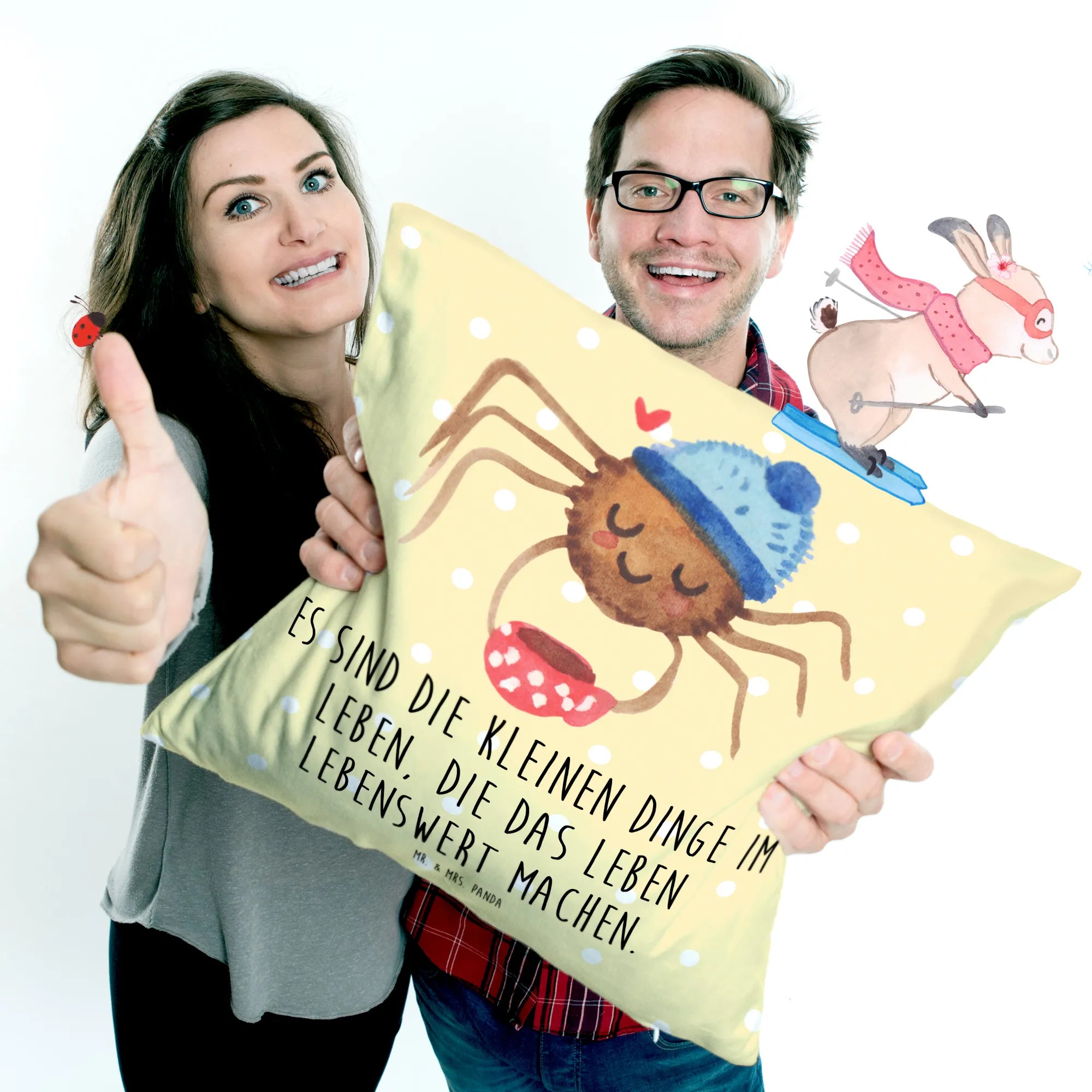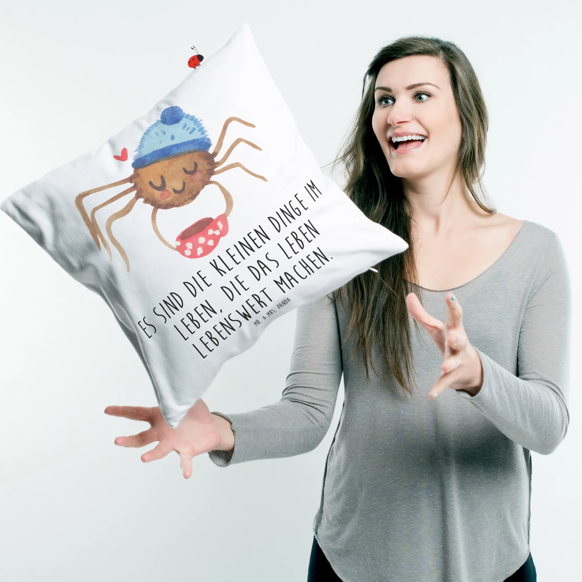 Es ist Teil der beliebten Spinne Agathe Kollektion, die durch die Social Media-Kanäle von Mr. & Mrs. Panda berühmt wurde, als Nora, alias Mrs. Panda, eine besondere Beziehung zu Agathe aufbaute. Das Kissen strahlt Lebensfreude und die Botschaft aus, dass es die kleinen Dinge im Leben sind, die zählen.