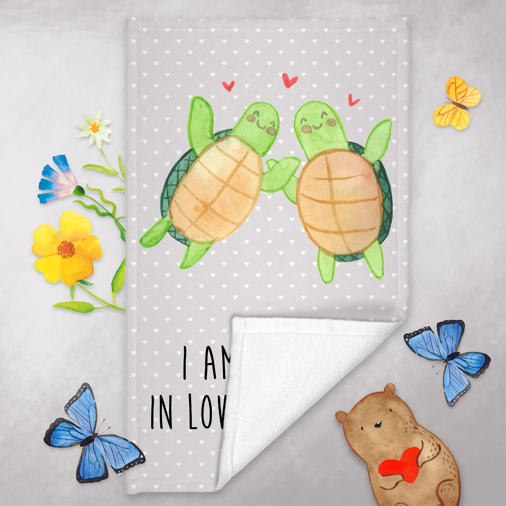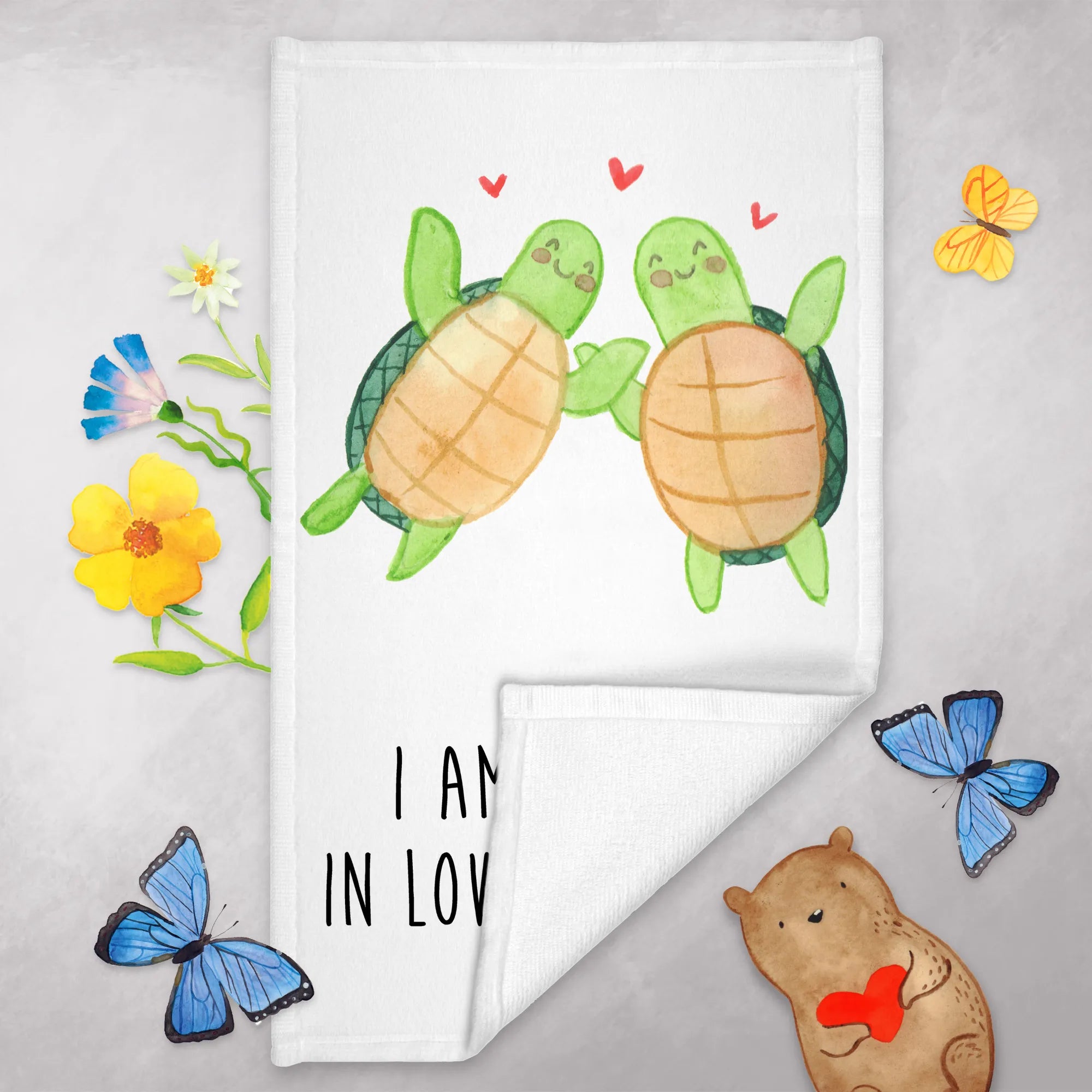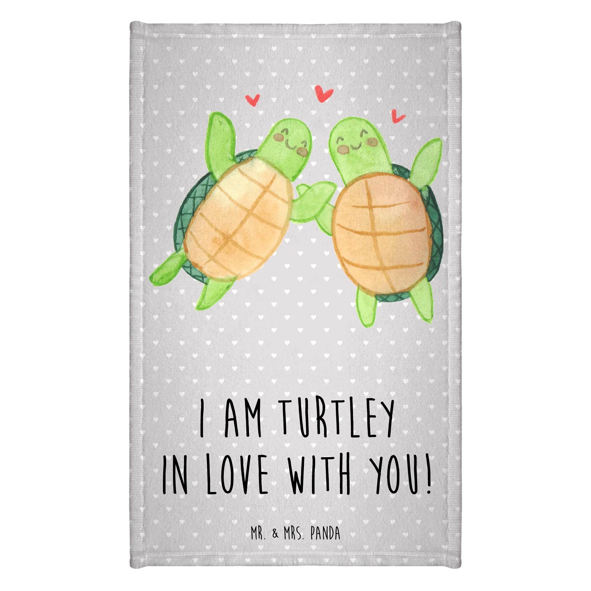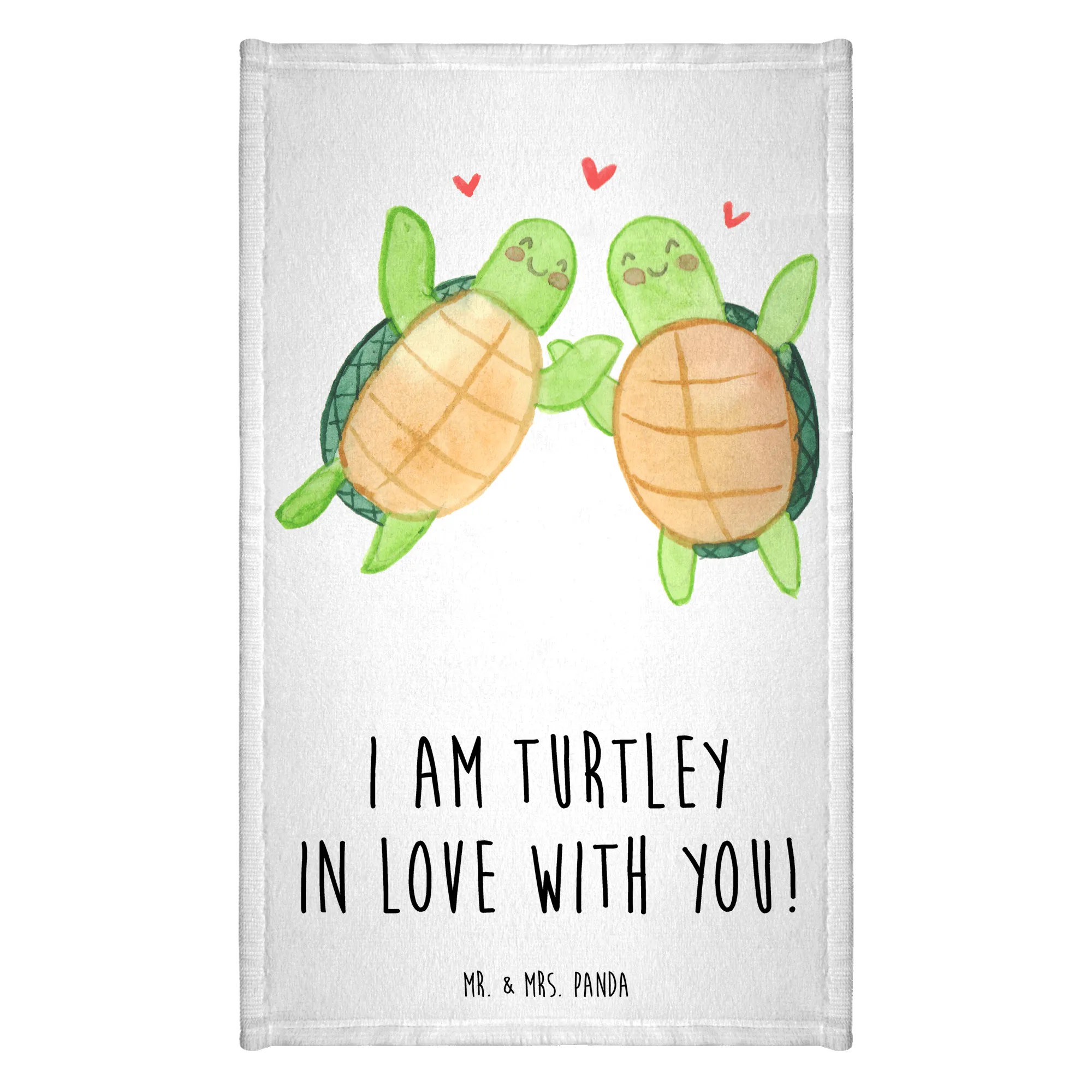 Mit dem zauberhaften Spruch "I am turtley in love with you!" und dem stilisierten Schildkröten-Paar, das sich zueinander gewandt hat, strahlt dieses Handtuch pure Zuneigung und Freude aus. Zwischen den beiden Schildkröten schweben kleine, rote Herzen, die die Liebe symbolisieren. Es ist perfekt für Anlässe wie den Valentinstag, Jahrestage, Hochzeitstage oder einfach als liebevolles Mitbringsel für die Freundin oder den Freund.