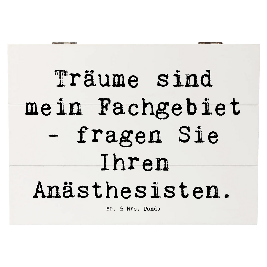 Eine wunderschöne Holzkiste von Mr. & Mrs. Panda, die ganz im Zeichen des Anästhesisten steht! Mit dem liebevoll gestalteten Spruch "Träume sind mein Fachgebiet - fragen Sie Ihren Anästhesisten" wird dieses besondere Stück zum idealen Geschenk für alle, die diesen faszinierenden Beruf ausüben.