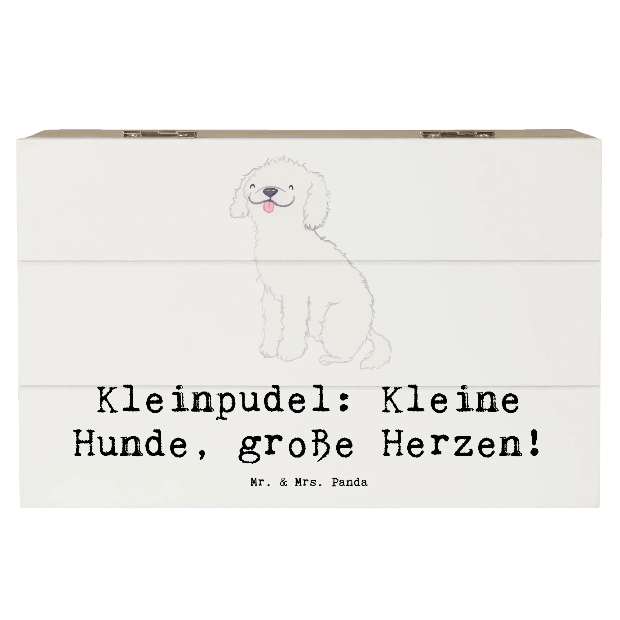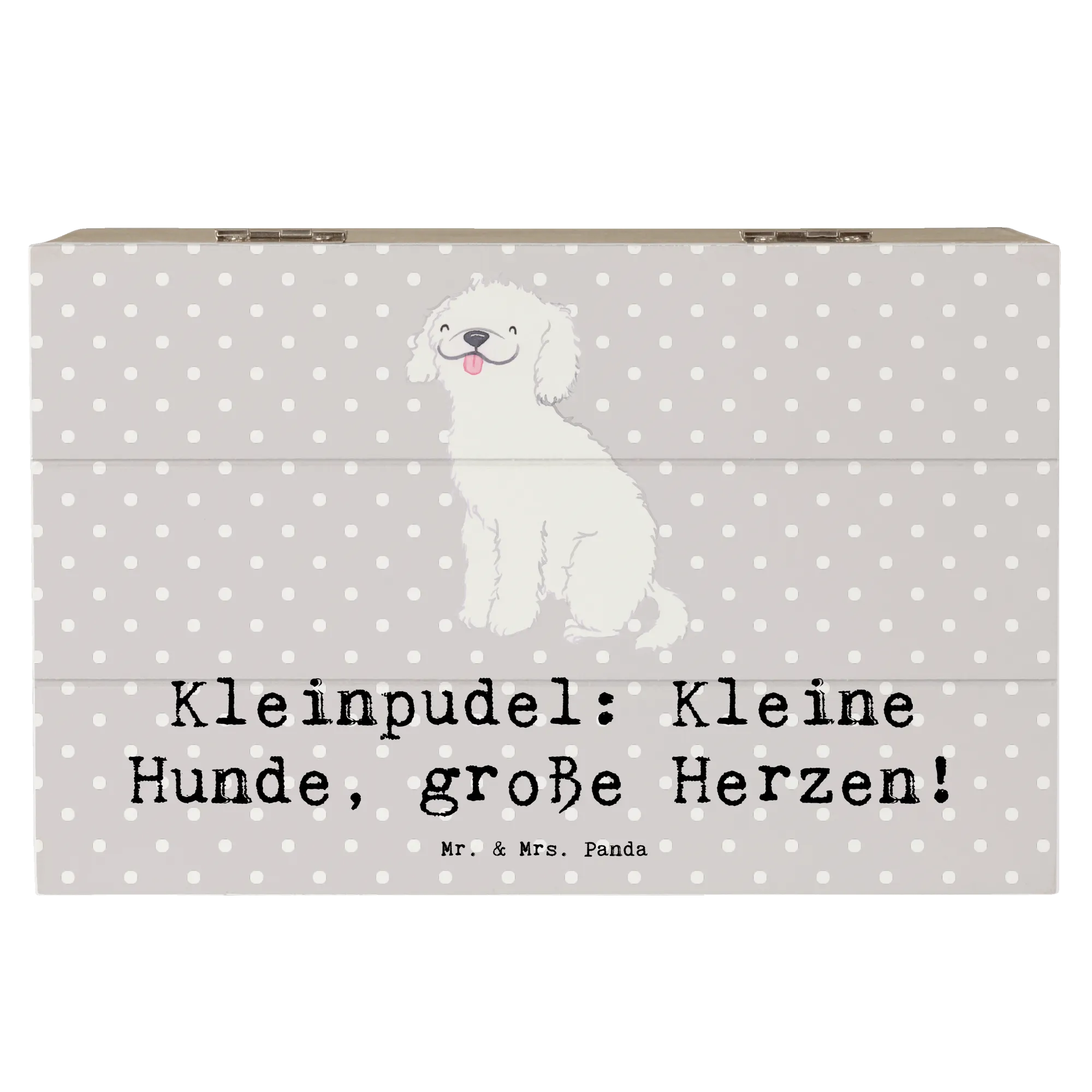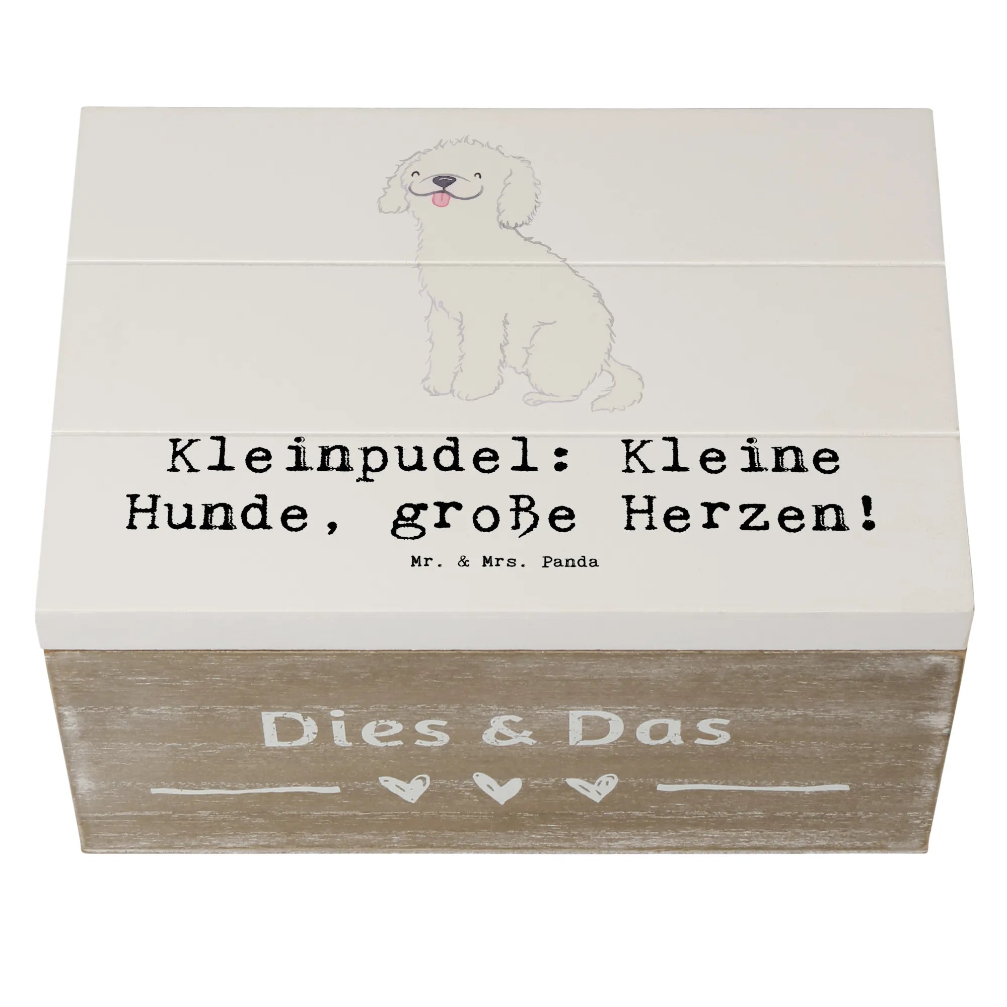Die kleine Schatzkiste ist ein echter Hingucker. Auf der Vorderseite prangt das niedliche Motiv eines Kleinpudels, das von Mrs. Panda liebevoll handgezeichnet wurde. Der Spruch "Kleinpudel: Kleine Hunde, große Herzen!" macht sie besonders charmant und fragt quasi nach einem neuen Zuhause. Die Einschlagscharniere ermöglichen ein einfaches Öffnen und Schließen der Kiste, was sie zu einer praktischen Aufbewahrungsbox für alles macht, was dir lieb und wertvoll ist.