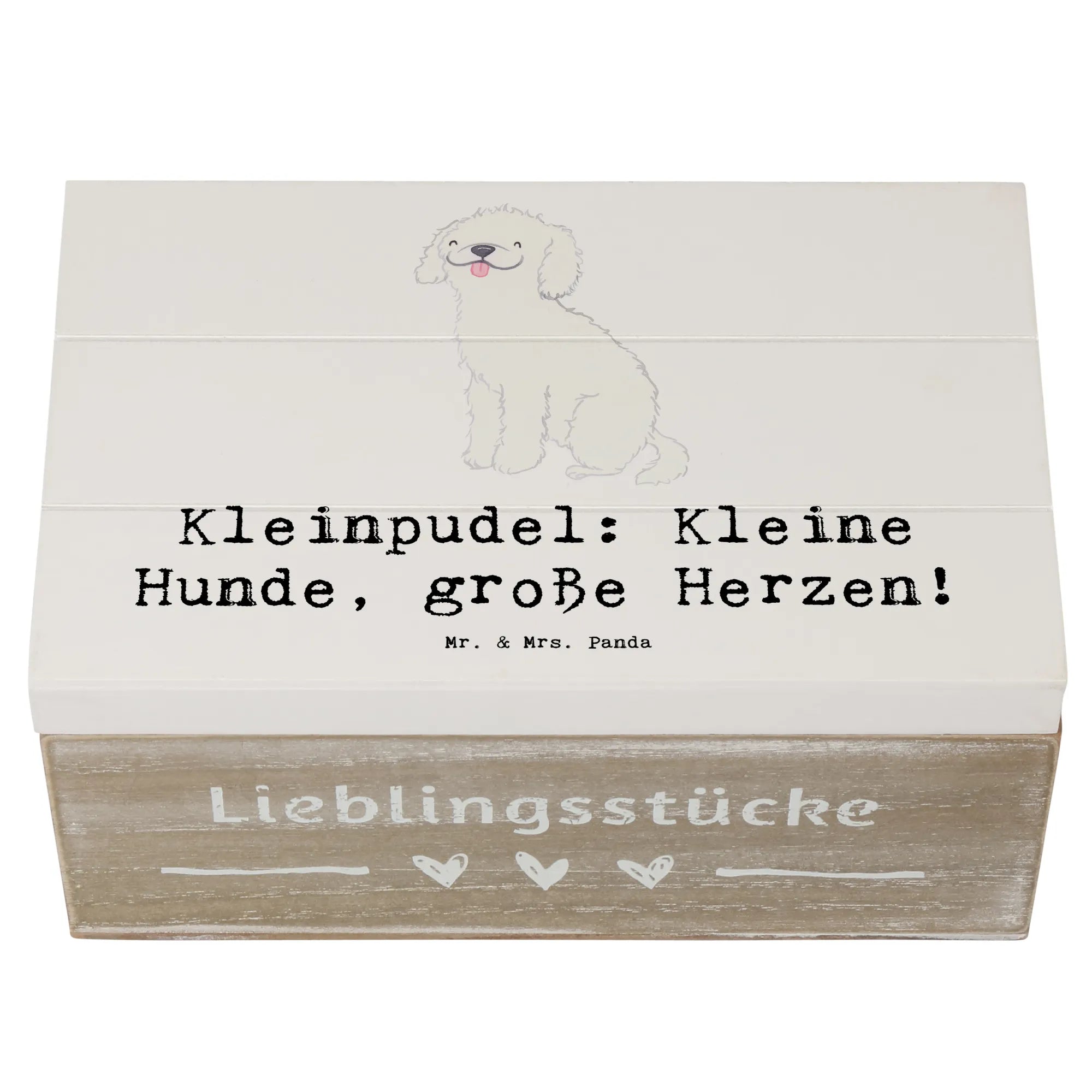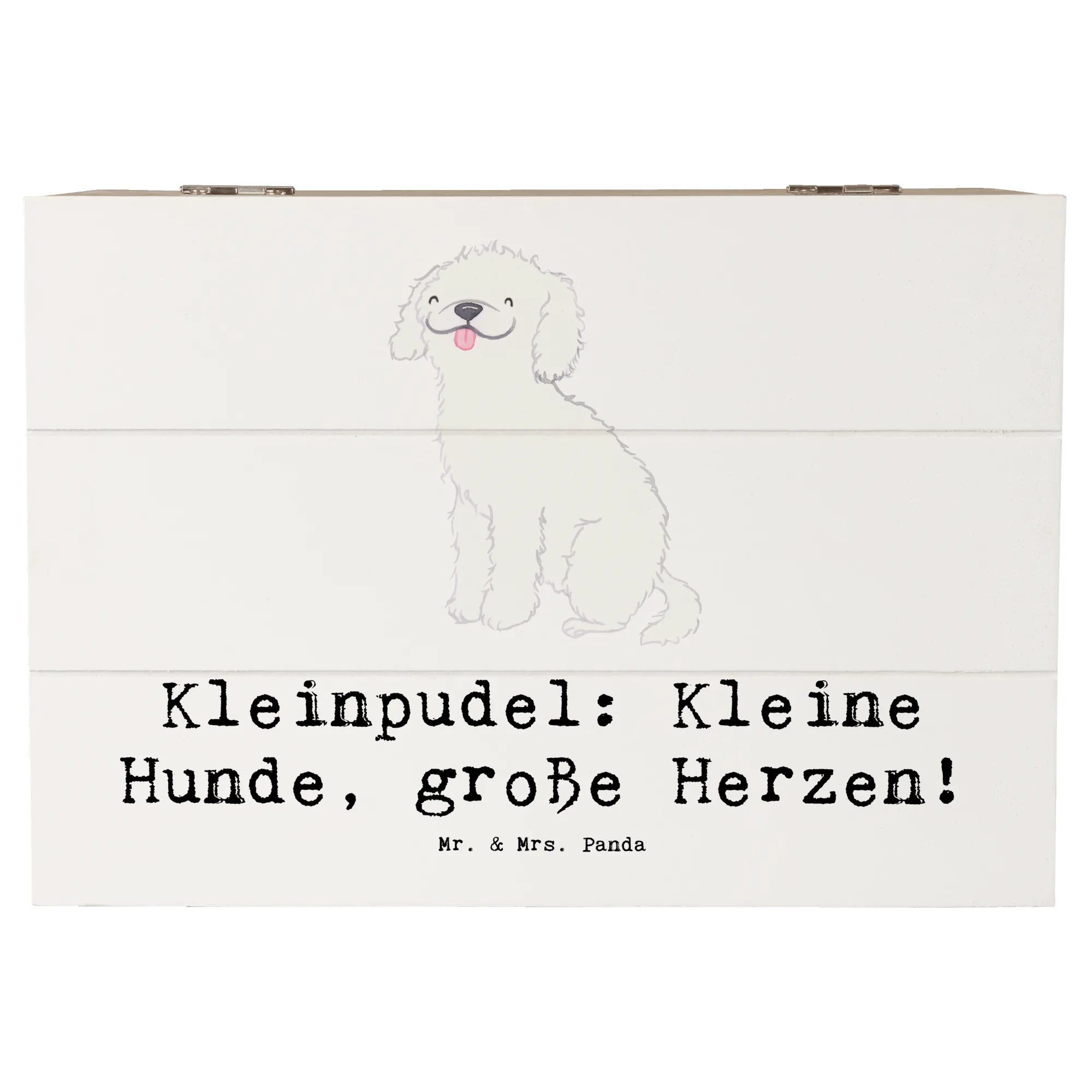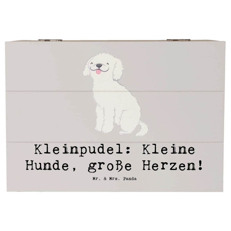 Die kleine Schatzkiste ist ein echter Hingucker. Auf der Vorderseite prangt das niedliche Motiv eines Kleinpudels, das von Mrs. Panda liebevoll handgezeichnet wurde. Der Spruch "Kleinpudel: Kleine Hunde, große Herzen!" macht sie besonders charmant und fragt quasi nach einem neuen Zuhause. Die Einschlagscharniere ermöglichen ein einfaches Öffnen und Schließen der Kiste, was sie zu einer praktischen Aufbewahrungsbox für alles macht, was dir lieb und wertvoll ist.