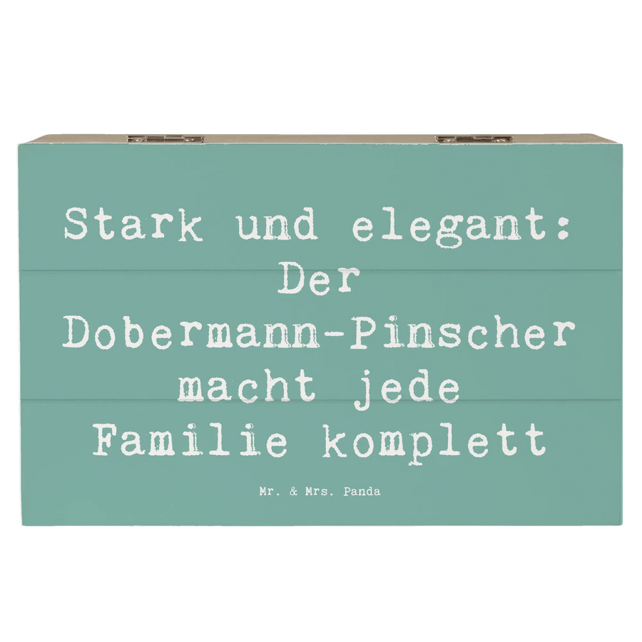 Die Kiste besteht aus robustem, wasserabweisendem Material und ist besonders stabil, somit ist sie der ideale Begleiter im Alltag. Sie besitzt praktische Einschlagscharniere, die das Öffnen und Schließen der Kiste kinderleicht machen. In der bezaubernden Hunderassen-Kollektion von Mr. & Mrs. Panda ist diese Holzkiste mit dem Slogan 'Stark und elegant: Der Dobermann-Pinscher macht jede Familie komplett' versehen, der die Treue und den Charakter dieser wundervollen Hunderasse würdigt.
