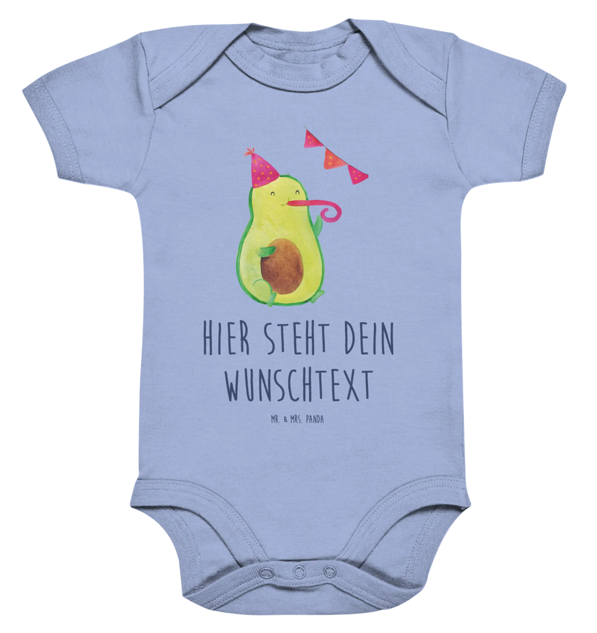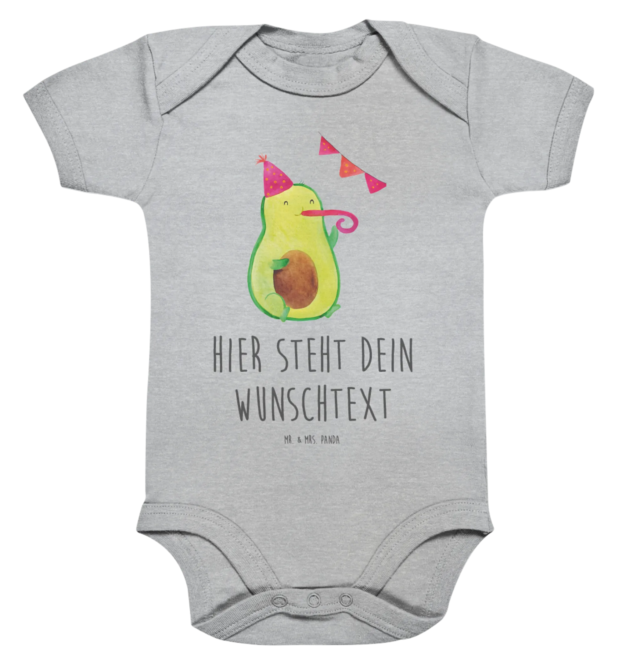 Der personalisierte Baby Body "Avocado Party Time" aus der beliebten Avocado Kollektion von Mr. & Mrs. Panda ist das perfekte Geschenk für frisch gebackene Eltern oder als besonderes Highlight zur Baby-Erstausstattung. Mit einem fröhlichen Motiv einer süßen Avocado, die einen Partyhut trägt und in eine Partypfeife pustet, bringt dieser Body nicht nur gute Laune, sondern ist auch ein echter Hingucker! Der Baby Body besteht aus hochwertiger, zertifizierter Öko-Baumwolle und ist somit besonders sanft zur empfindlichen Babyhaut.
