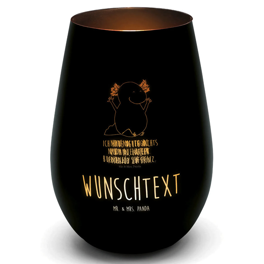 Verschenke Freude und Gemütlichkeit mit unserem personalisierten Gold Windlicht Axolotl Hurra von Mr. & Mrs. Panda! Dieses wunderschöne und edle Windlicht verzaubert nicht nur durch sein fröhliches Design, sondern auch durch die Möglichkeit, es mit deinem Wunschnamen oder einem persönlichen Text zu gravieren. Der süße Axolotl, der begeistert seine Arme in die Höhe reckt, bringt ein Lächeln in jedes Zuhause. Er beschreibt ein Lebensgefühl: "Ich habe heute nichts zu tun, außer fröhlich zu sein...". Diese Worte und das liebevoll gestaltete Motiv sorgen für eine positive Atmosphäre in deinem Raum.