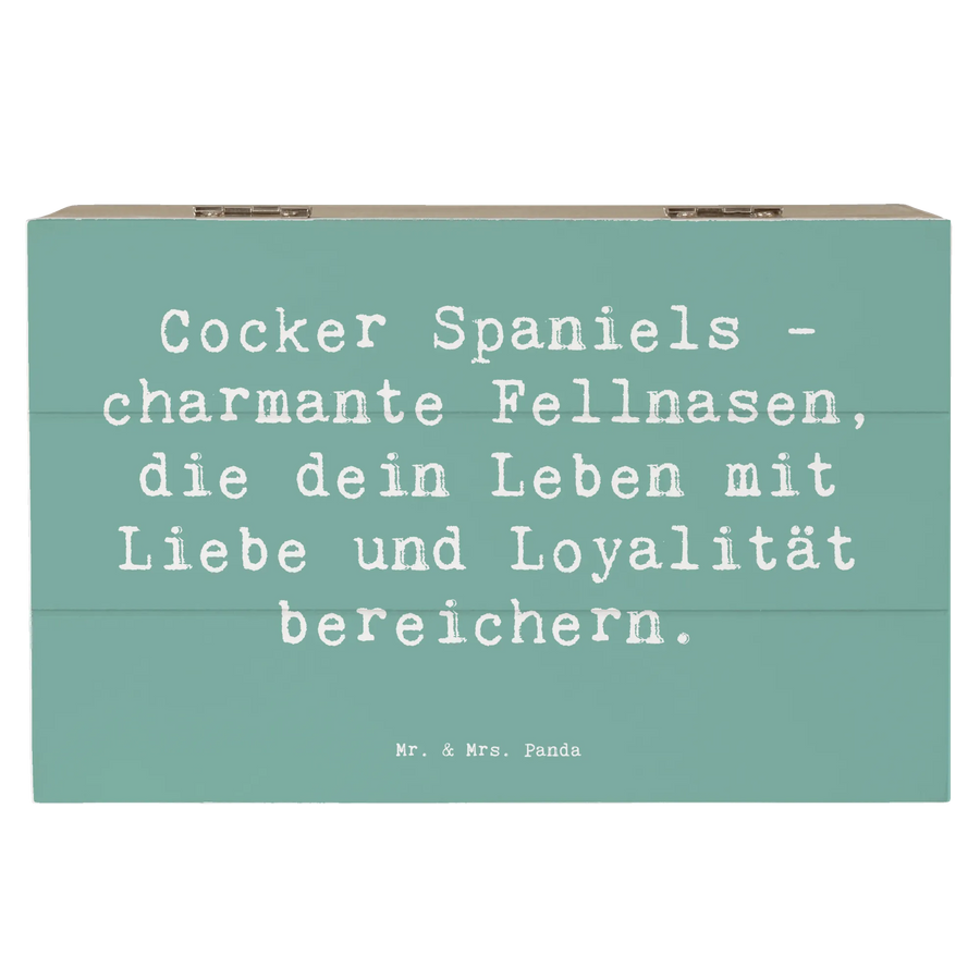 Ob Fotos, kleine Andenken oder besondere Geschenke, die Holzkiste ist vielseitig einsetzbar und sorgt dafür, dass all deine wertvollen Dinge sicher verwahrt sind. Mit den Maßen von 22 cm x 15 cm x 12 cm hat sie genau die richtige Größe, um sie überall zu platzieren. Der Cocker Spaniel bringt mit dem Spruch „Cocker Spaniels - charmante Fellnasen, die dein Leben mit Liebe und Loyalität bereichern.“ sofort ein Lächeln auf dein Gesicht und ist ein wahrer Blickfang in jedem Raum.