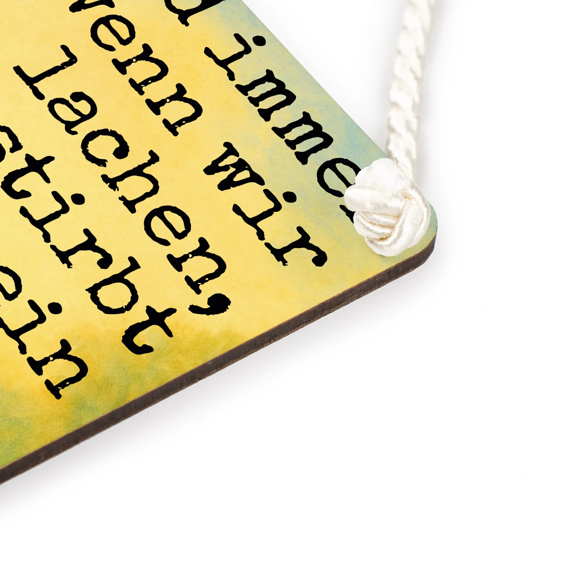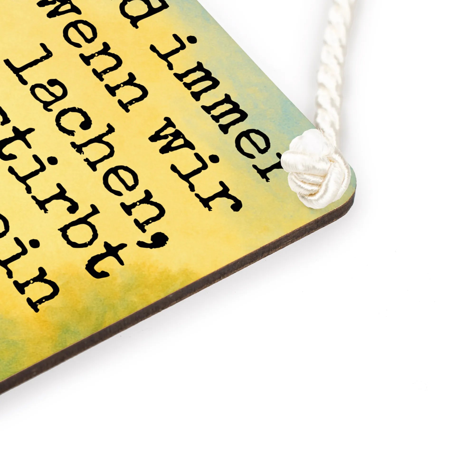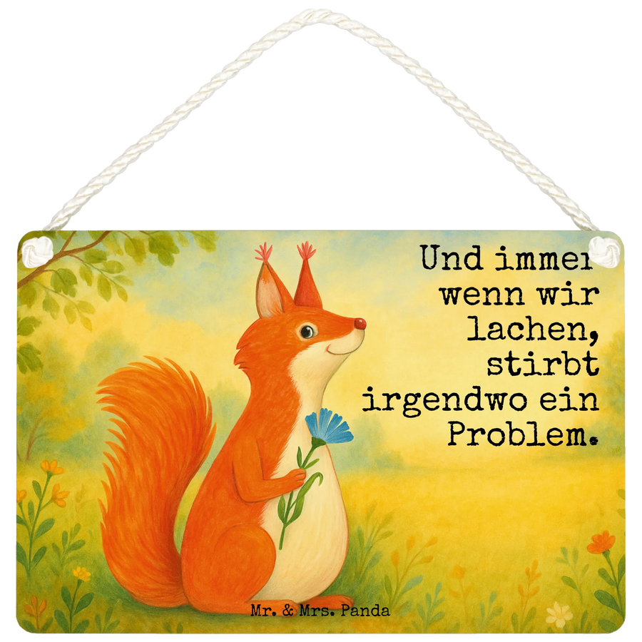 Das niedliche Eichhörnchen mit einer Blume in der Pfote strahlt sofort Wärme und Freude aus. In liebevollem Aquarell von Mrs. Panda gestaltet und mit dem positiven Spruch „Und immer wenn wir lachen, stirbt irgendwo ein Problem.“ bedruckt, bringt dieses Wandschild gute Laune in jeden Raum.