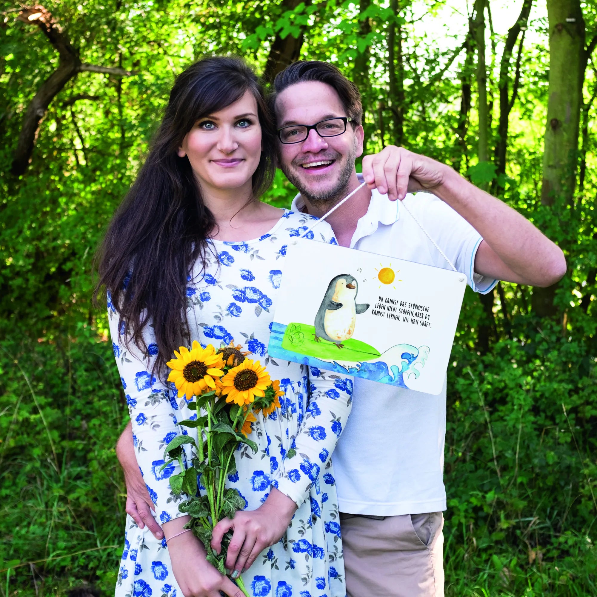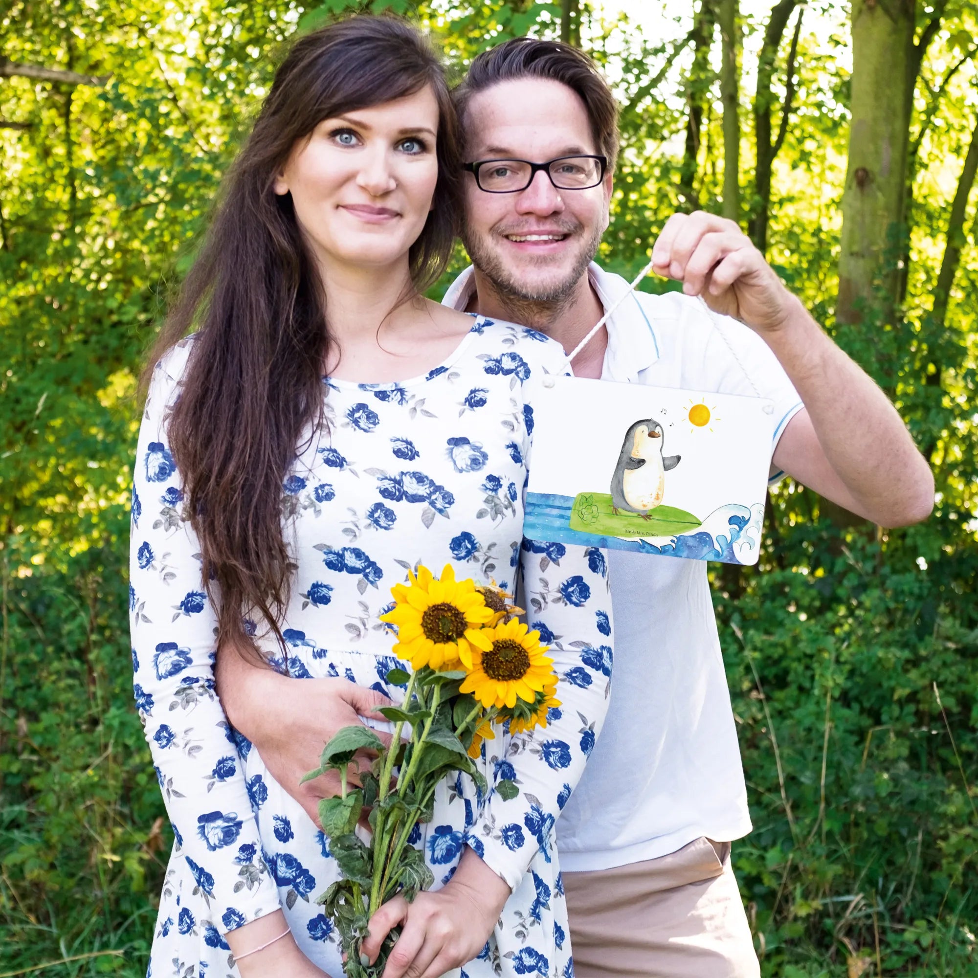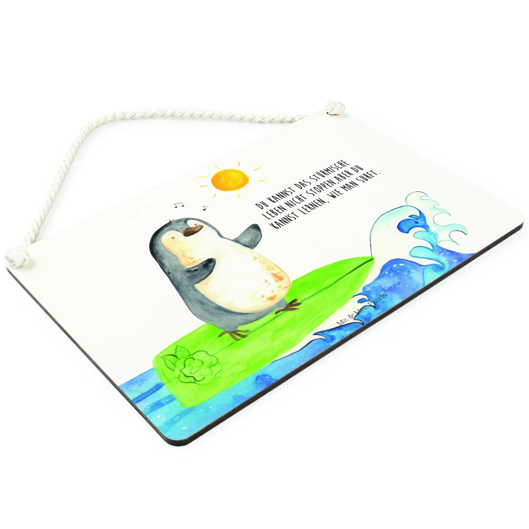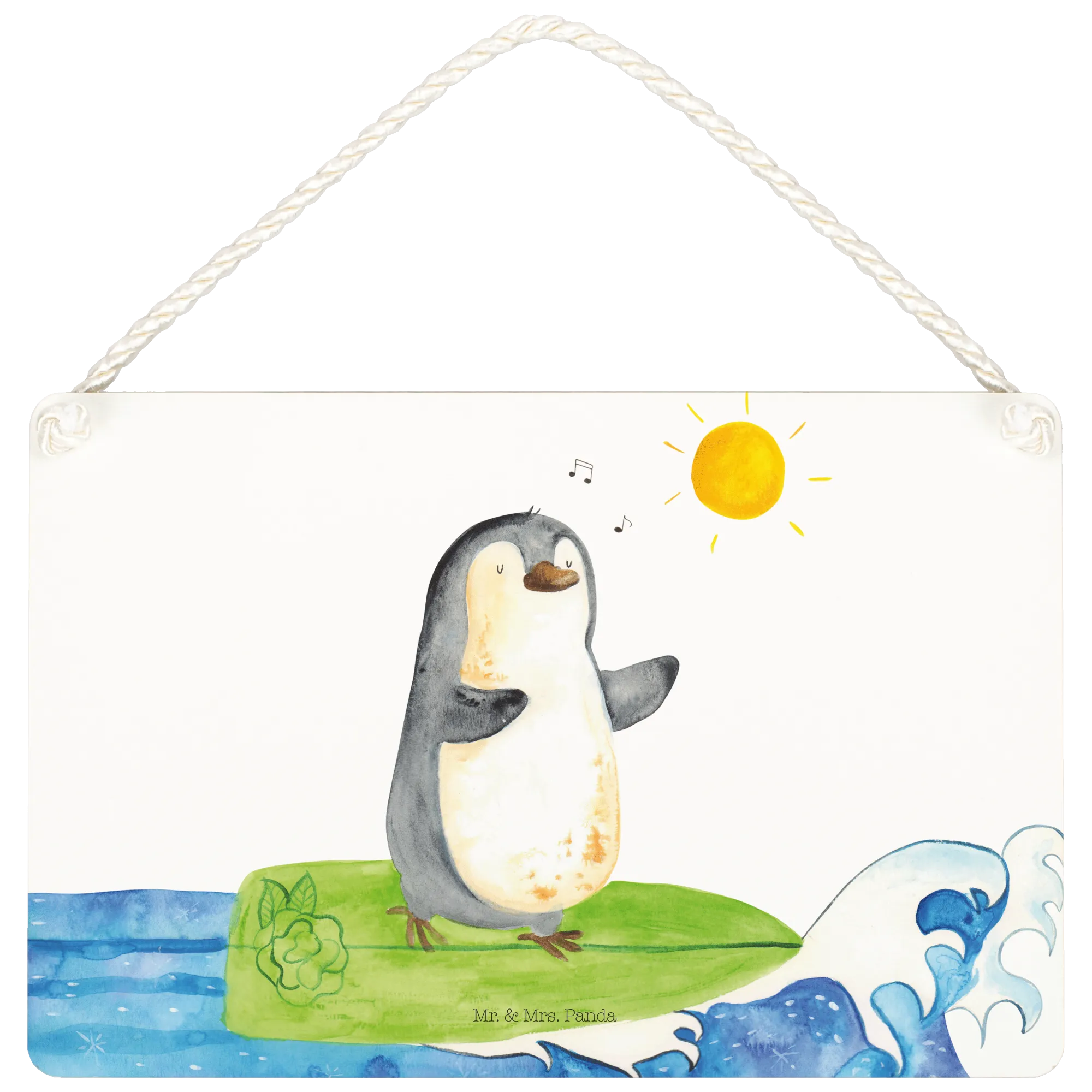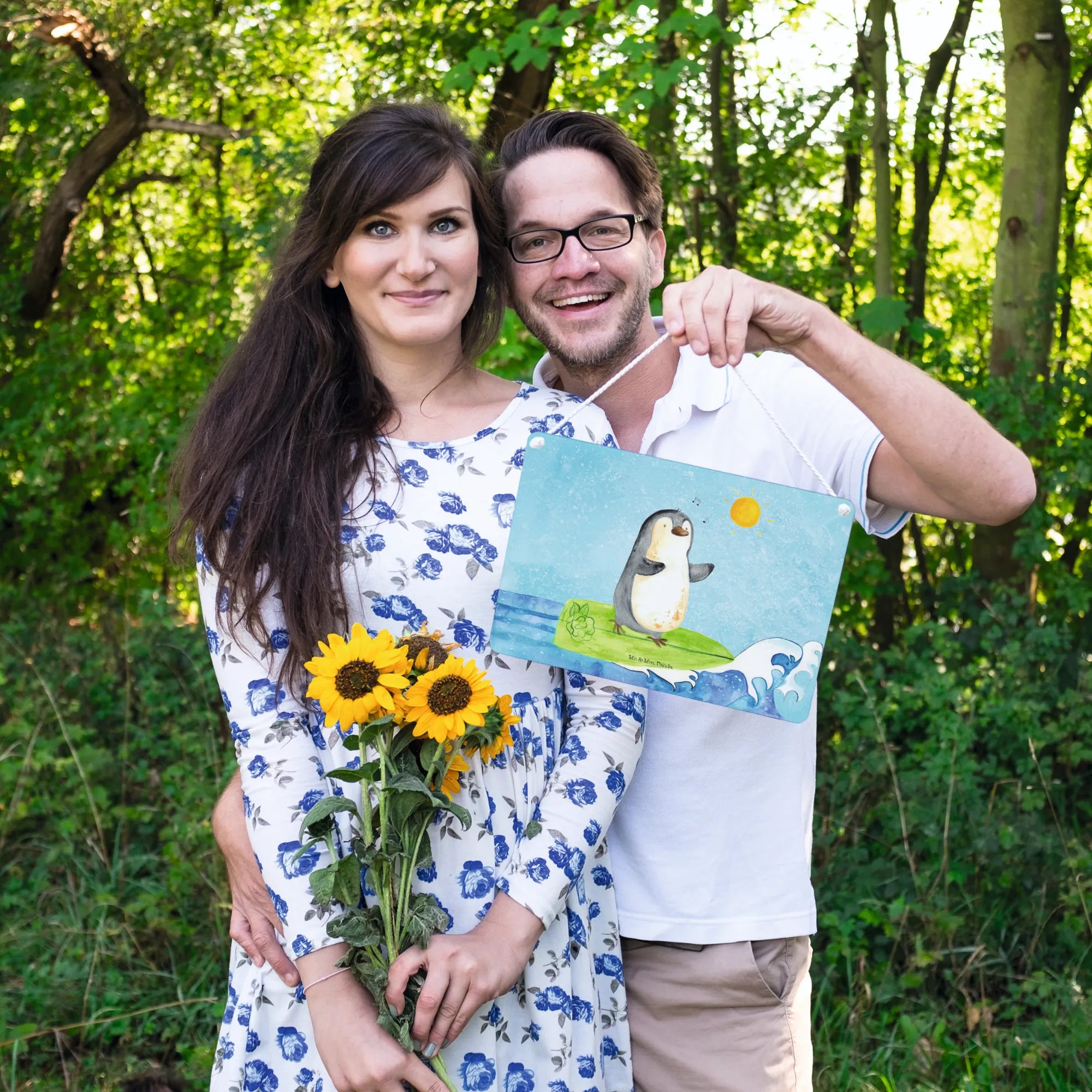 Dekoracyjny znak Pingwin surfista - DIN A5 - z napisem - lodowoniebieski