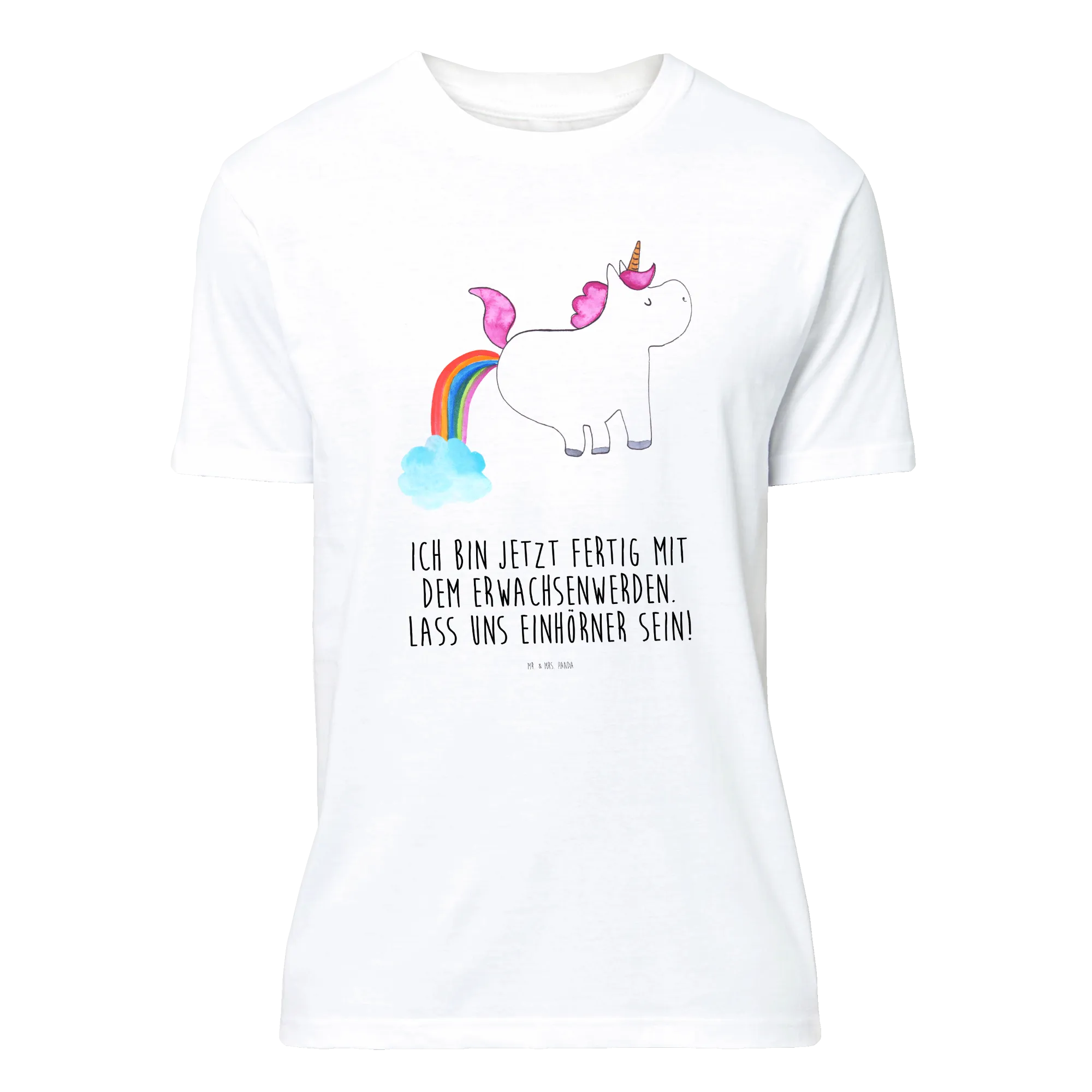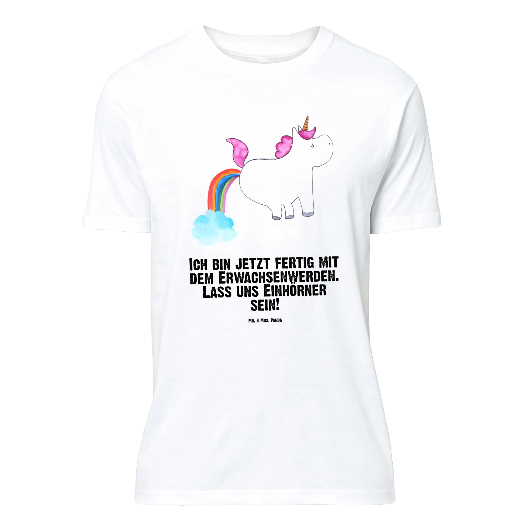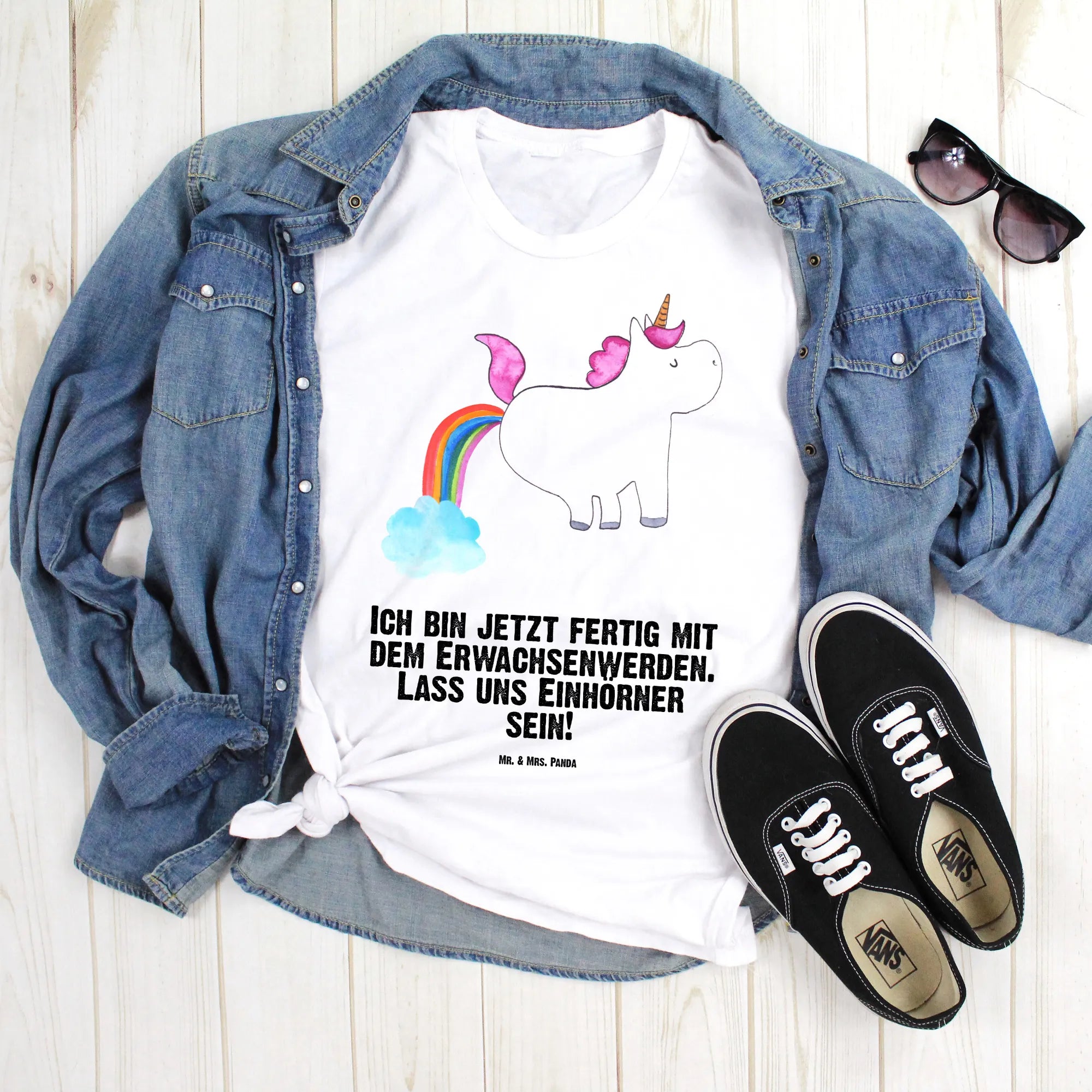 Du suchst ein Geschenk, das Spaß macht und ein Herz erwärmt? Unser Größe L T-Shirt "Einhorn Pupsend" aus der Einhorn - Kollektion von Mr. & Mrs. Panda vereint frechen Humor mit zarten, handgezeichneten Aquarell-Details. Ein süßes Einhorn lässt einen bunten Regenbogenpups los und der große Spruch "Ich bin jetzt fertig mit dem Erwachsenwerden. Lass uns Einhörner sein!" rundet das Design perfekt ab.