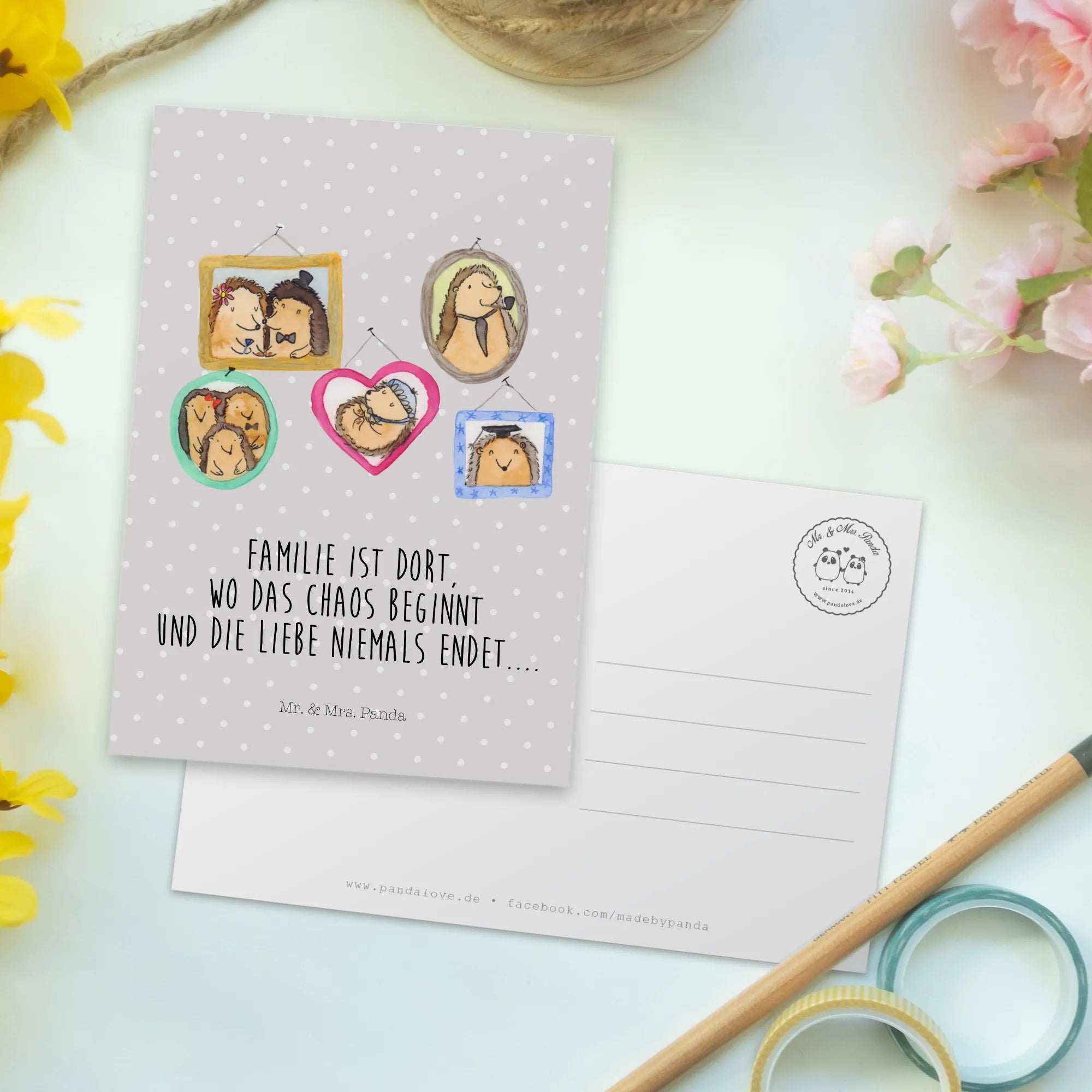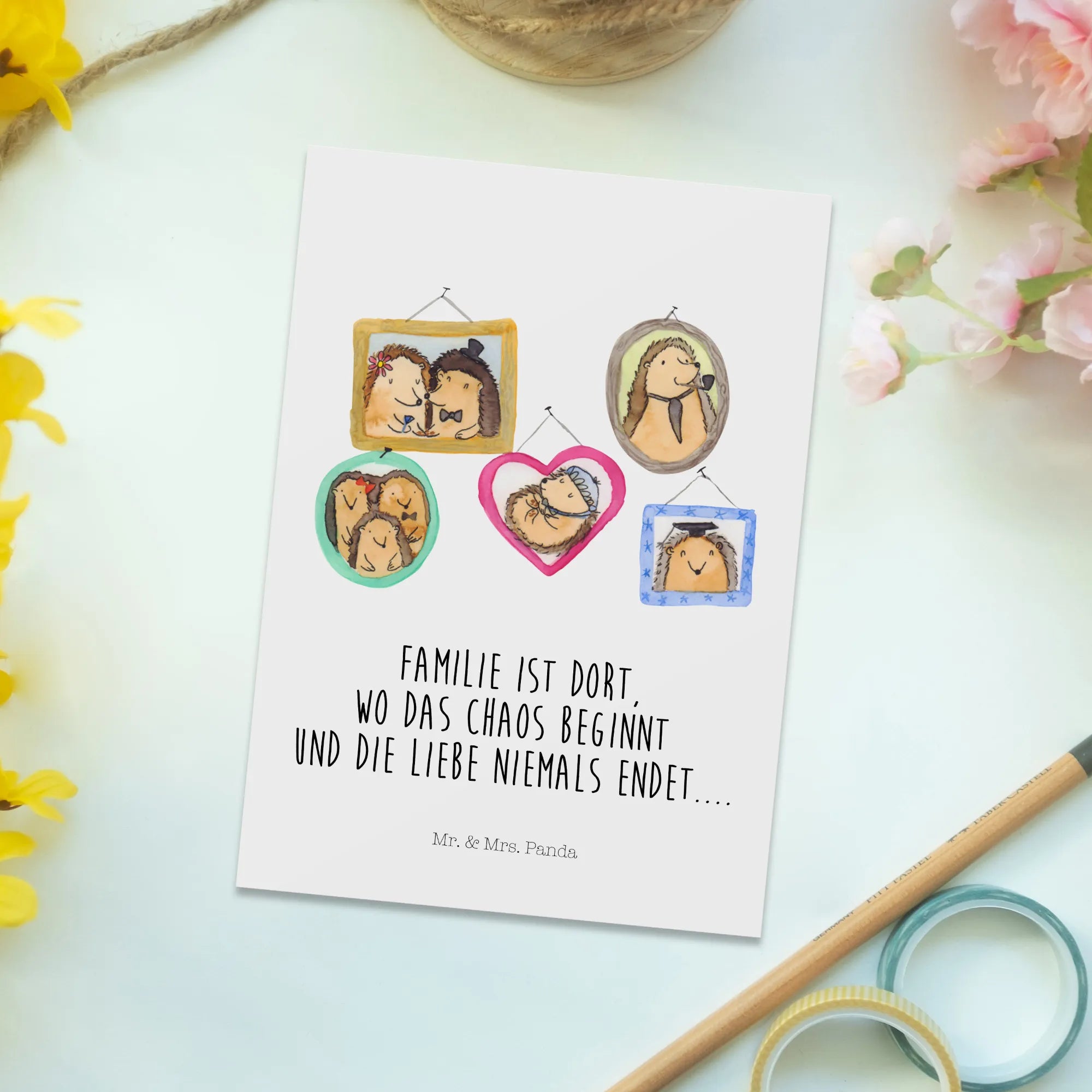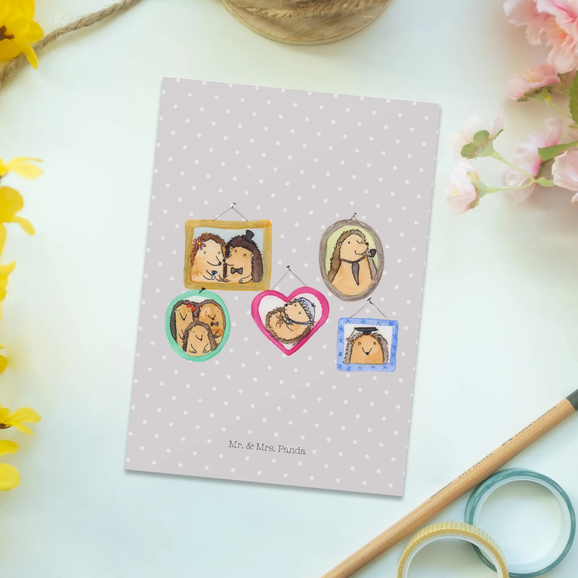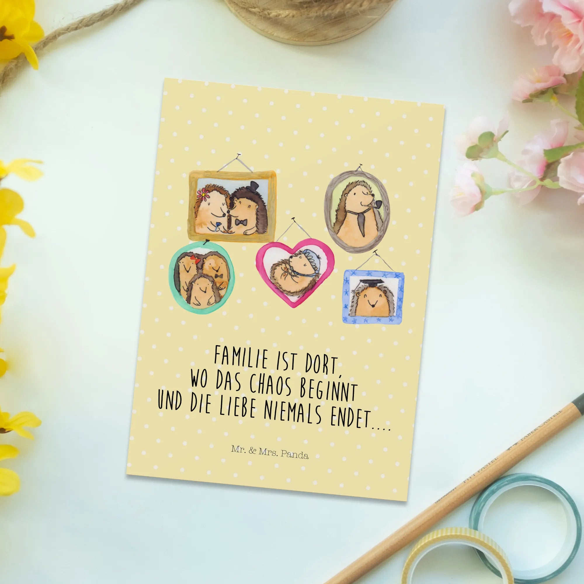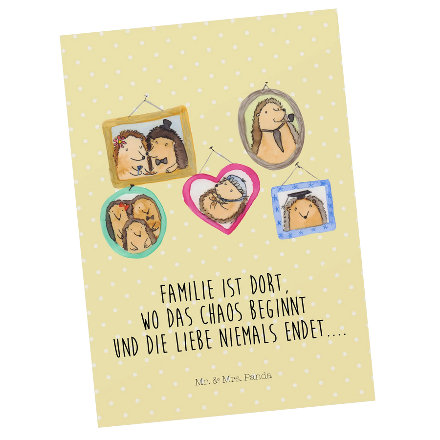 Pocztówka Rodzina jeży - z napisem - Żółty Pastel