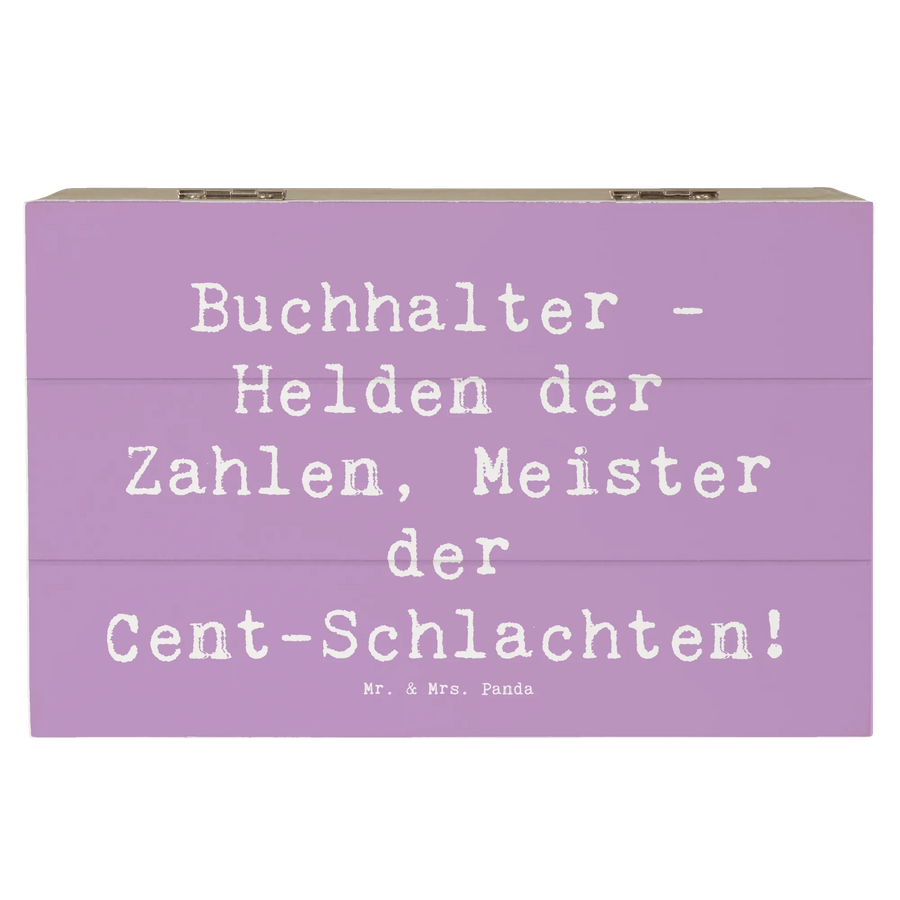 Die wunderschöne Holzkiste "Buchhalter" von Mr. & Mrs. Panda ist das perfekte Geschenk für alle, die im Zahlenraum zu Hause sind. Mit dem liebevollen Spruch "Buchhalter - Helden der Zahlen, Meister der Cent-Schlachten!" wird diese Kiste zum besonderen Blickfang.