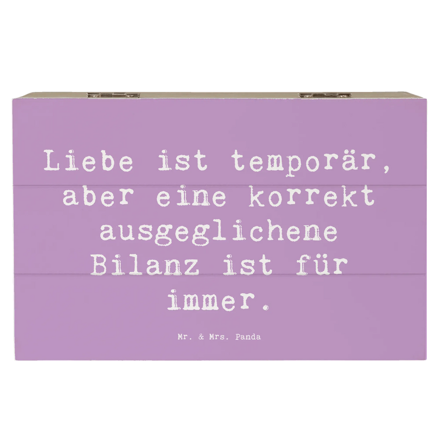 Die wunderschöne Holzkiste von Mr. & Mrs. Panda ist das perfekte Geschenk für alle Buchhalter und Finanzbegeisterten. Mit einem charmanten Motif, das den Spruch "Liebe ist temporär, aber eine korrekt ausgeglichene Bilanz ist für immer" trägt, ist diese Box nicht nur ein Blickfang, sondern auch äußerst nützlich. Diese Erinnerungsbox bietet einen Gastgeber für all Deine wertvollen Schätze – seien es Rechnungen, wichtige Dokumente oder einfach nur die schönen Erinnerungen des Alltags.