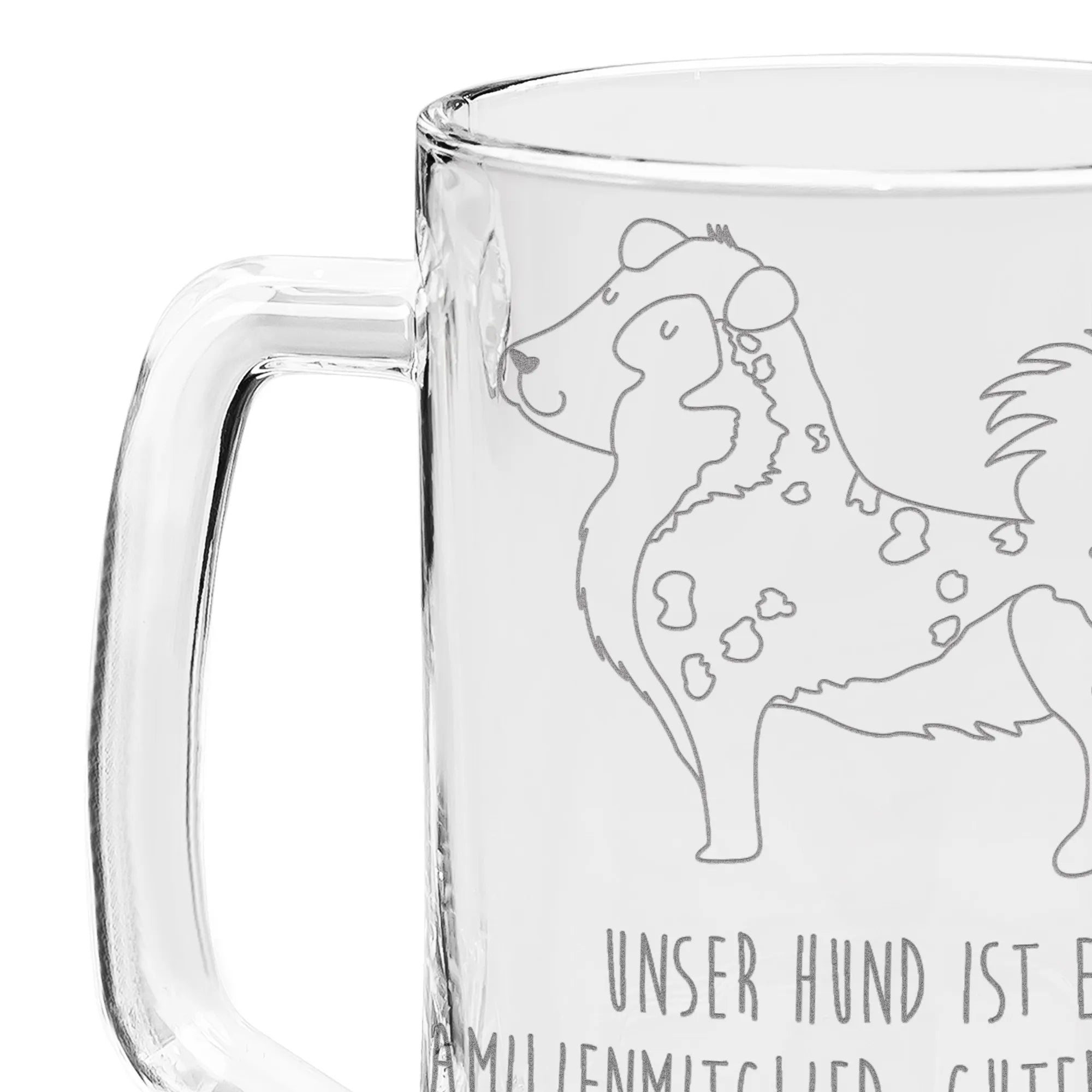 Der wunderschöne Gravur Bierkrug mit dem süßen Motiv eines Australian Shepherds ist das perfekte Geschenk für alle Hundeliebhaber und Biertrinker! Ob zum Vatertag, Geburtstag oder einfach als liebevolles Mitbringsel, dieser Bierkrug überzeugt durch seine hochwertige Verarbeitung aus robustem Glas und wird mit einem einzigartigen Spruch verziert: 'Unser Hund ist ein Familienmitglied, guter Freund, Aufpasser und Wegbegleiter'. Dieser Spruch spricht jedem Hundebesitzer aus der Seele und zaubert ein Lächeln auf die Gesichter der Beschenkten.