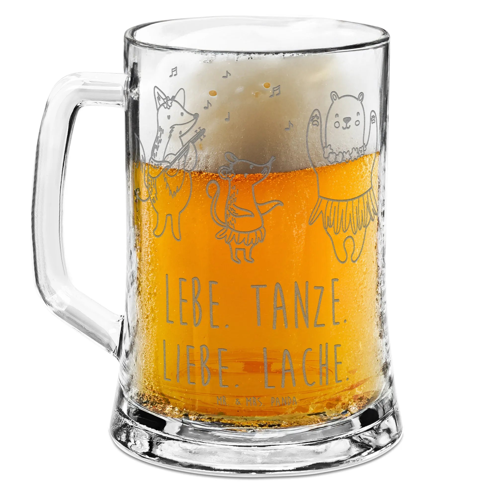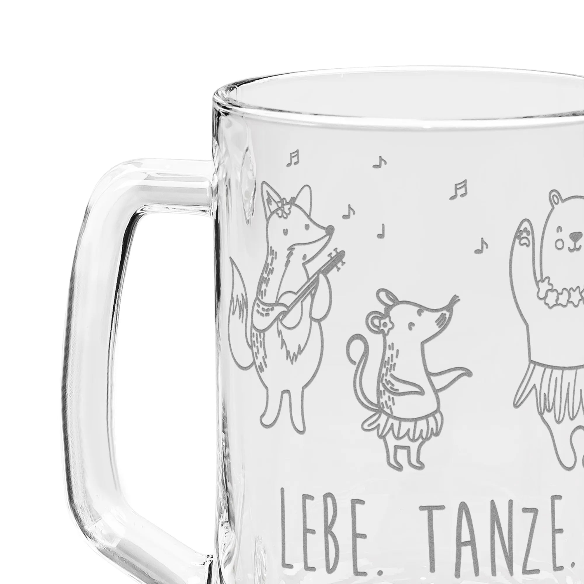 Der wunderschöne Gravur Bierkrug mit dem Motiven "Waldtiere Aloha" aus der entzückenden Small World Kollektion von Mr. & Mrs. Panda ist das perfekte Geschenk für alle, die Leben, Spaß und gute Laune lieben! Ob zum Vatertag, Geburtstag, zu Weihnachten oder einfach nur, um jemandem eine Freude zu bereiten – dieser Bierkrug bringt jedes Herz zum Lachen. Die süßen Waldtiere, die sich im Hula-Rock schwingen und zu ihren eigenen hawaiianischen Melodien tanzen, zaubern dir ein Lächeln ins Gesicht. Mit dem Slogan "Lebe. Tanze. Liebe. Lache." verabschiedest du dich von grauen Tagen und tauchst ein in eine Welt voller Freude und Unbeschwertheit.