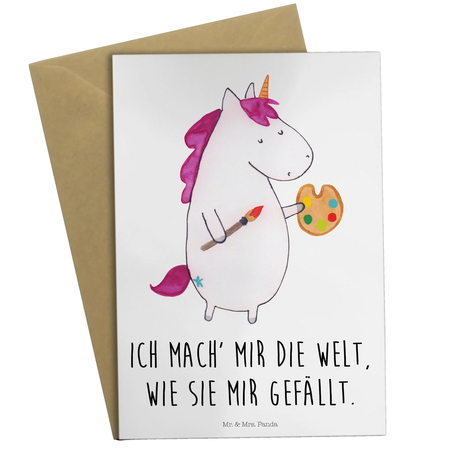Kartka okolicznościowa Jednorożec Artysta Grußkarte, vatertagskarte, neujahrskarte, dankeskarten, weihnachtskarten, osterkarten, kommunionskarte, einladungskarten, osterkarte, genesungskarte, glückwunschkarten, jubiläumskarte, Beileidskarte, Motivkarte, firmungskarte, valentinstagskarte, Glückwunschkarte, abiturkarte, Grußkarten, hochzeitskarten, babykarte, Klappkarte, spruchkarte, Unicorn, Einhorn, Einhörner, Einhorn Deko, Maler, Stift, Pinsel, Farbe, Künstler, Geschenk, Welt, Zeichnen, Malen, Artist, Englisch