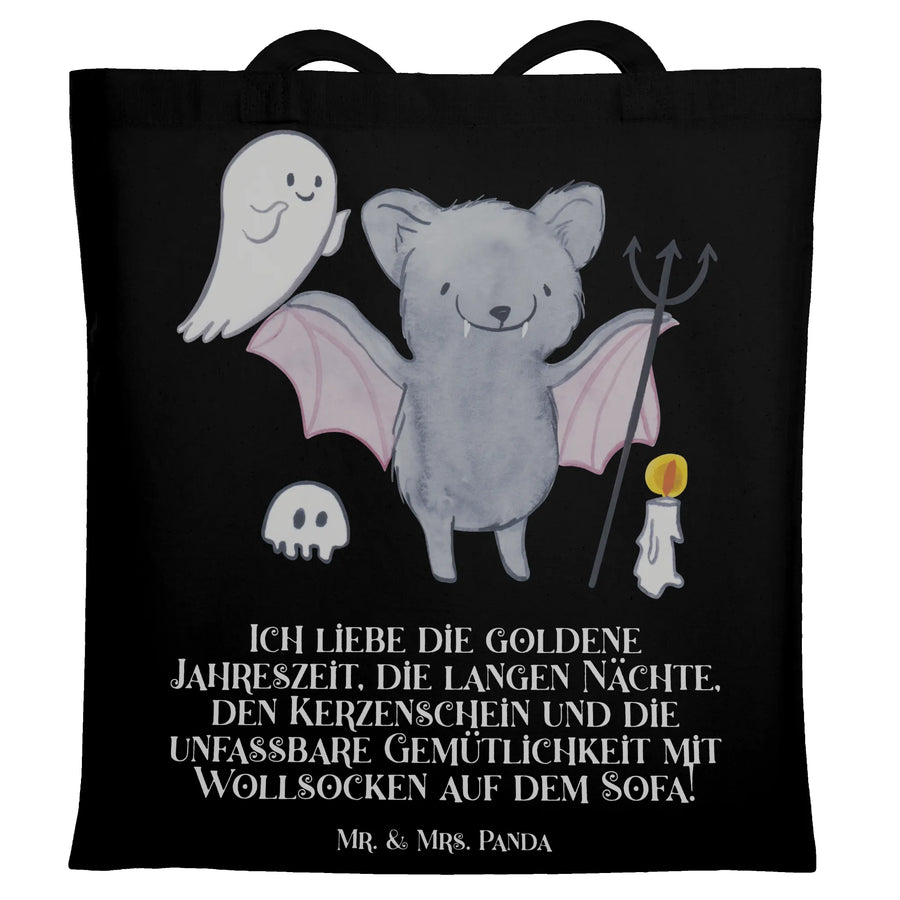 Unsere schwarze Stofftasche aus der Feiertage & Events Kollektion vereint praktischen Alltagseinsatz mit liebevollem Design. Das handgezeichnete Aquarellmotiv von Mrs. Panda und der warme Spruch "Ich liebe die goldene Jahreszeit, die langen Nächte, den Kerzenschein und die unfassbare Gemütlichkeit mit Wollsocken auf dem Sofa!" machen diese Tragetasche zu einem besonderen Accessoire für Halloween, Gruselparty und herbstliche Stunden. Perfekt als Halloween Geschenk oder als süße Ergänzung zu deiner Halloween Deko.