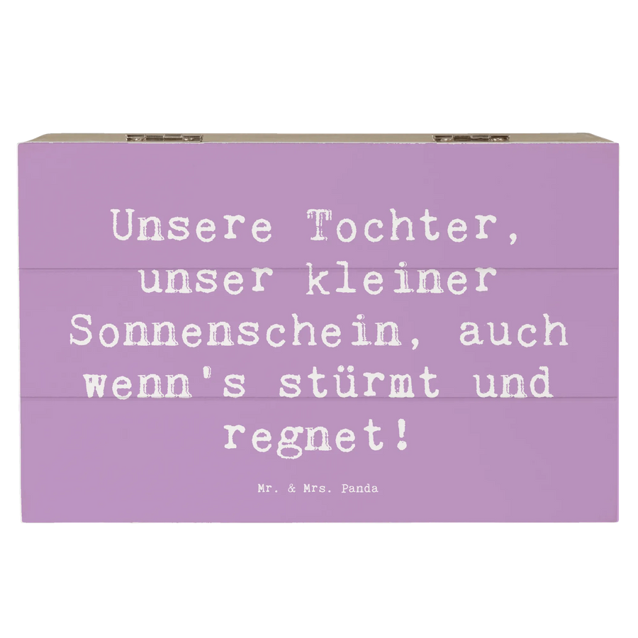 Suchst du nach dem perfekten Geschenk für deine geliebte Tochter? Die wunderschöne Holzkiste von Mr. & Mrs. Panda ist die ideale Wahl! Mit einem charmanten Motiv, das ausdrückt: 'Unsere Tochter, unser kleiner Sonnenschein, auch wenn's stürmt und regnet!', ist diese Kiste nicht nur ein Blickfang, sondern auch ein wertvoller Aufbewahrungsort für die besonderen Erinnerungen deiner kleinen Prinzessin. Egal ob für Geburtstage, Kommunion, Konfirmation oder einfach nur so - diese Erinnerungskiste wird Herzen höherschlagen lassen!
