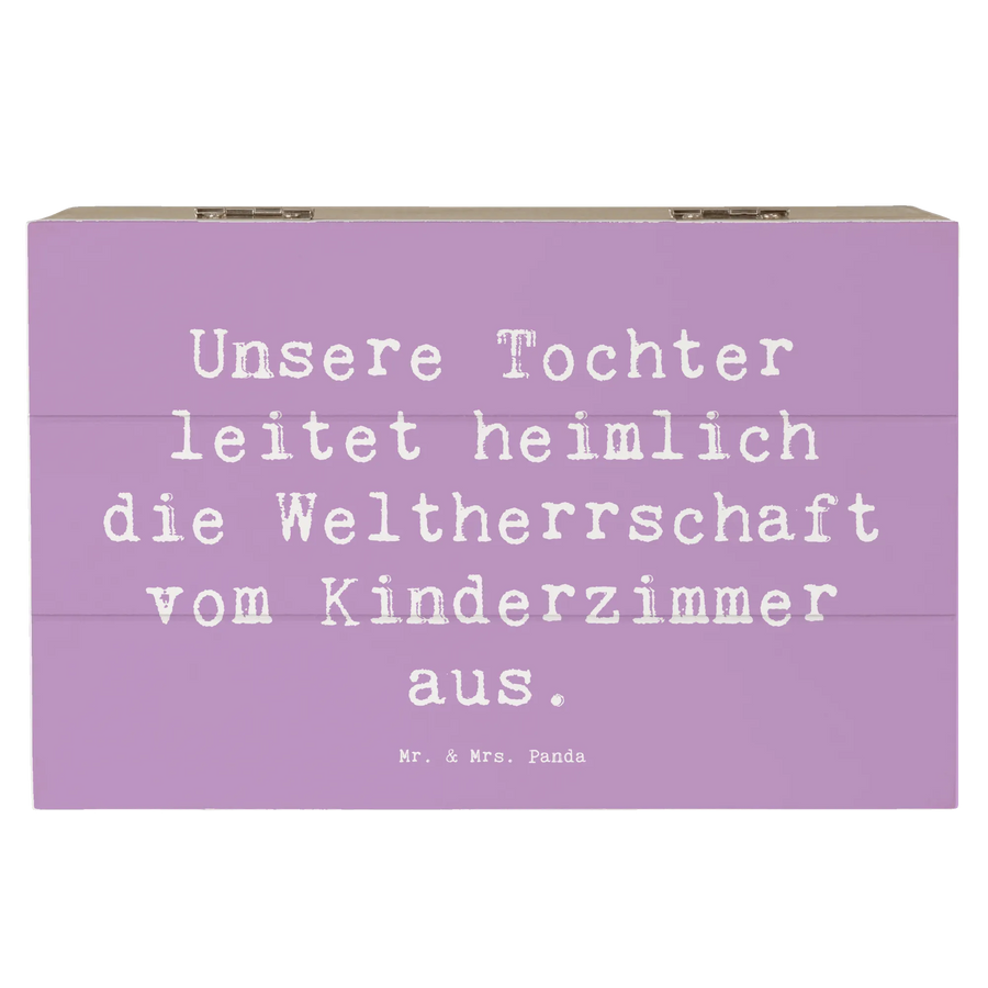 Mit dem zauberhaften Motiv für Töchter, die eine große Bedeutung für jede Familie haben, ist diese Kiste ein echter Hingucker. "Unsere Tochter leitet heimlich die Weltherrschaft vom Kinderzimmer aus" - dieser freche Spruch sorgt für ein Lächeln auf den Lippen und bringt den besonderen Charme mit sich.