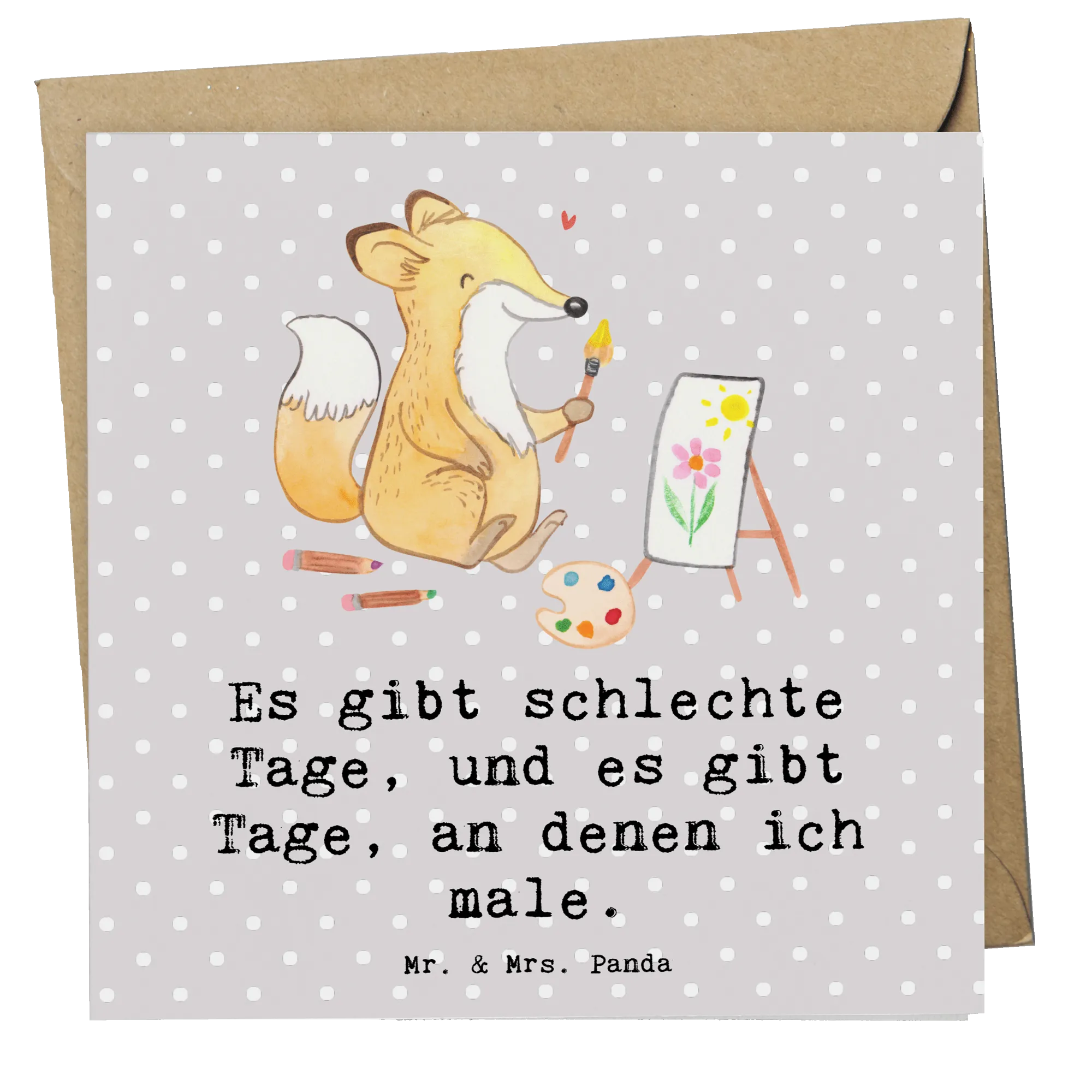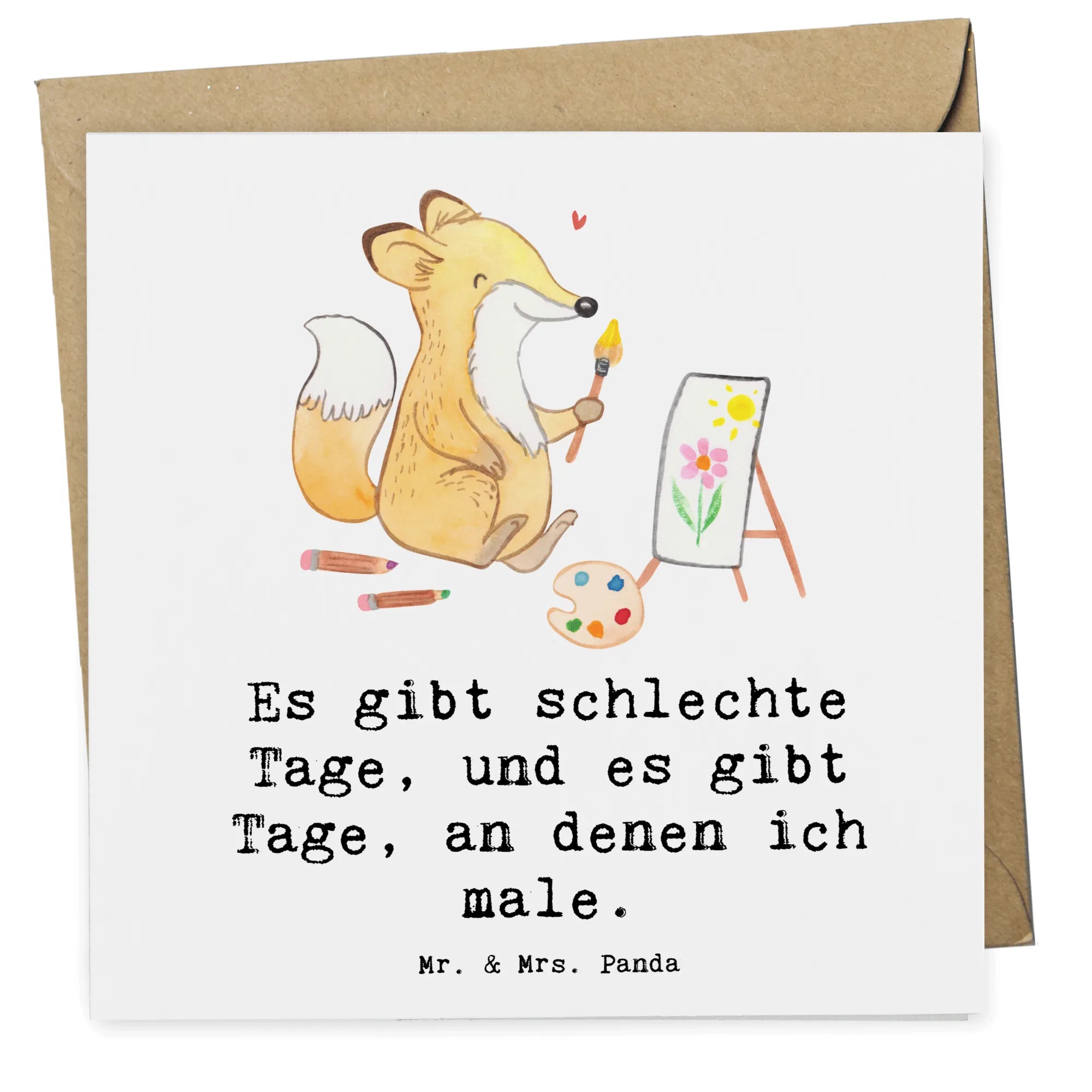 Diese hochwertige quadratische Grußkarte aus der Hobby & Sport Kollektion von Mr. & Mrs. Panda zeigt einen liebenswerten Fuchs an der Staffelei und trägt den stimmigen Spruch: „Es gibt schlechte Tage, und es gibt Tage, an denen ich male.“ 🎨🦊