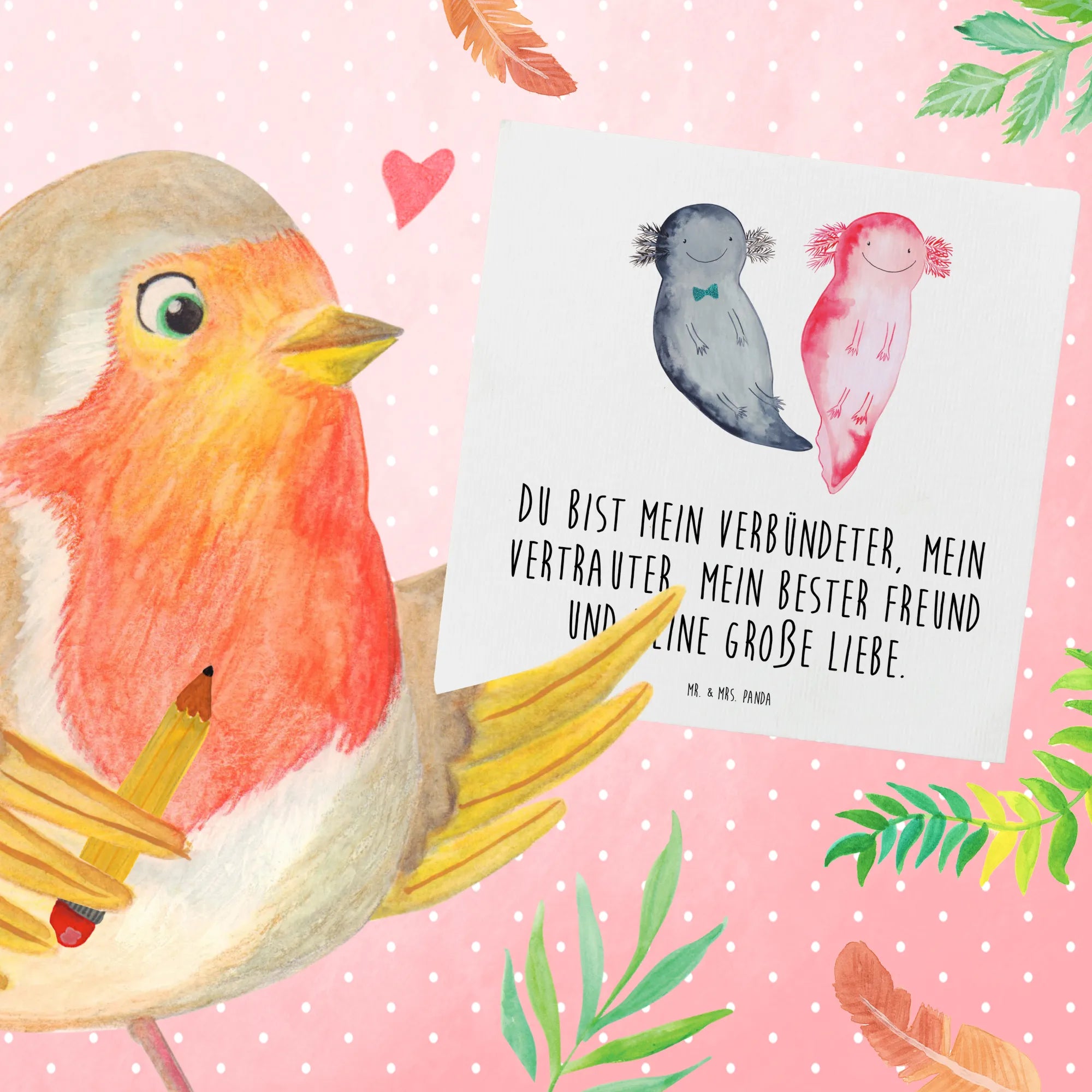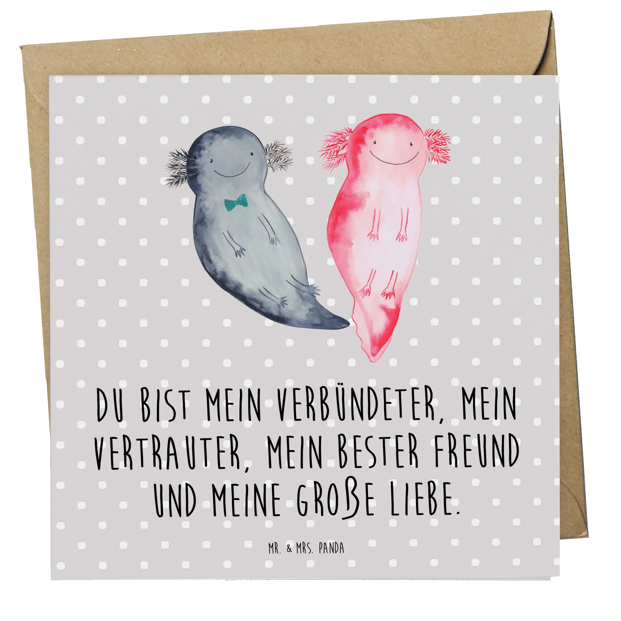 Die Deluxe Karte mit dem zauberhaften Axolotl Axel und Lotte ist das ideale Geschenk für jeden Anlass. Diese wunderschöne und besonders hochwertige quadratische Karte von Mr. & Mrs. Panda begeistert durch ihr niedliches Motiv und die harmonischen Pastellfarben. Ob zum Geburtstag, zur Hochzeit, für einen Jahrestag oder einfach nur so – mit dieser Glückwunschkarte zeigst Du deinem liebsten Menschen, wie viel er dir bedeutet.