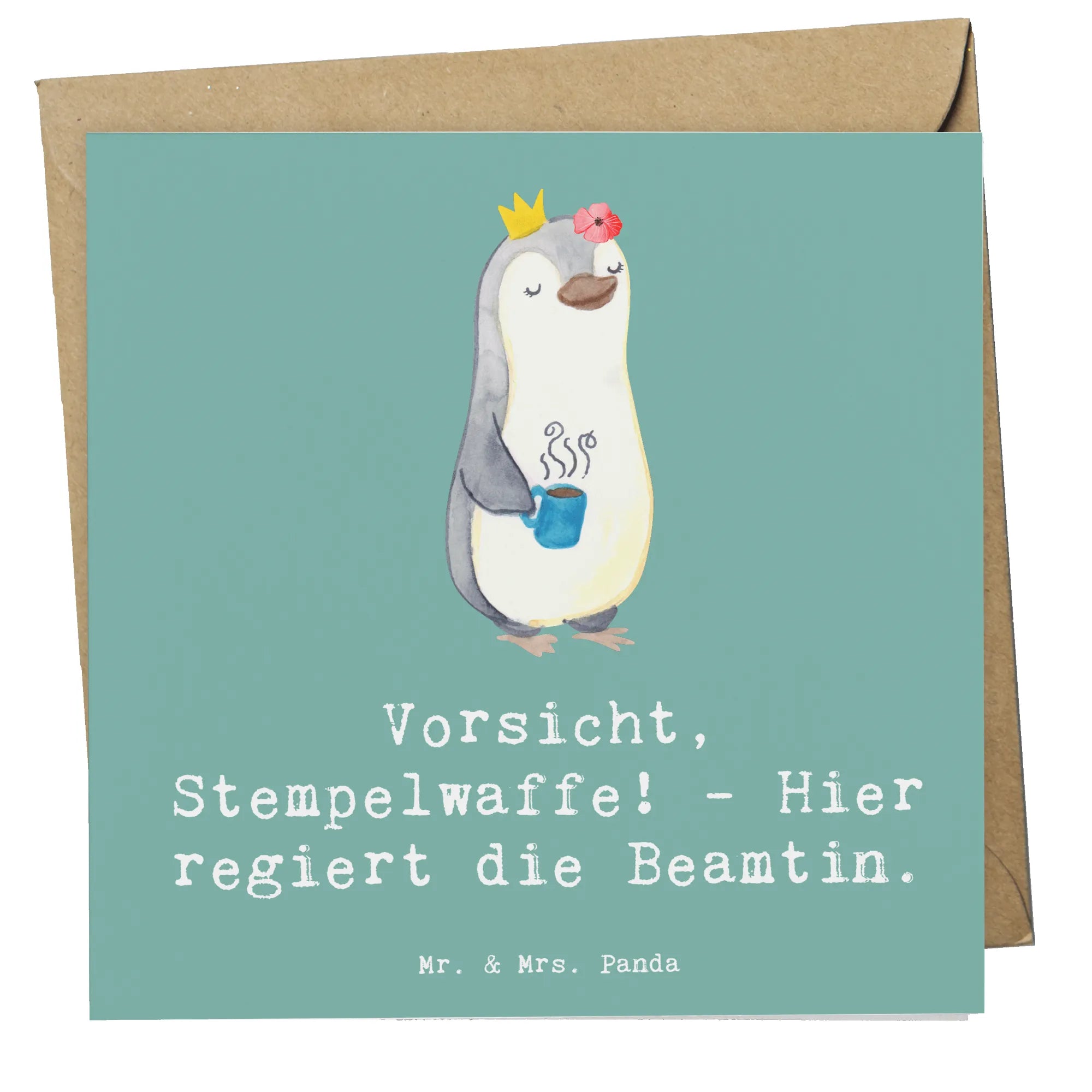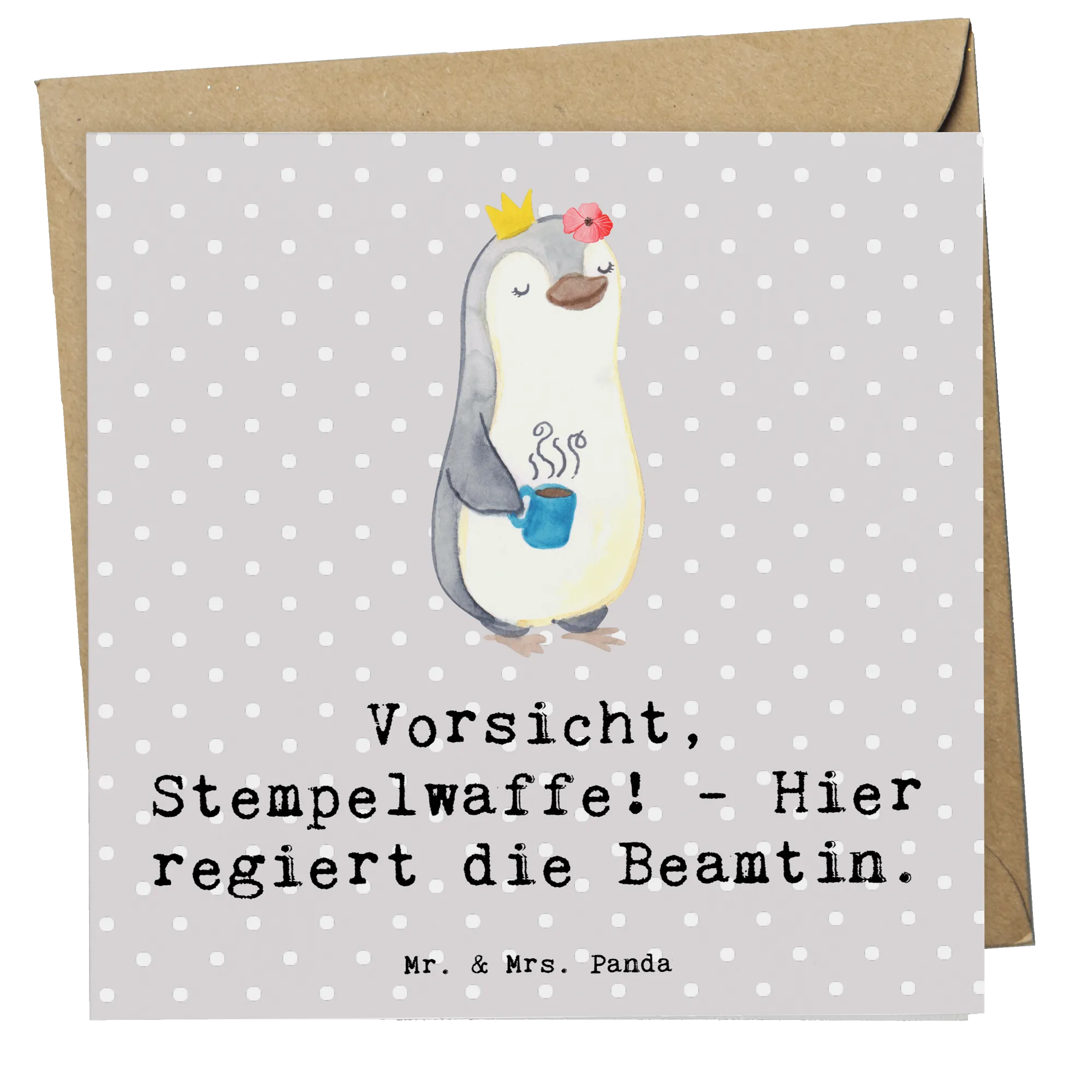 Die Vorderseite der Karte ist mit dem humorvollen Spruch "Vorsicht, Stempelwaffe! - Hier regiert die Beamtin." sowie einem niedlichen Motiv versehen, das eigens von Mrs. Panda handgezeichnet wurde. Die matte Innenseite bietet genügend Platz für Deine persönlichen Grüße oder Glückwünsche - perfekt für feierliche Anlässe wie Geburtstage, Hochzeiten, Verabschiedungen oder Jubiläen.
