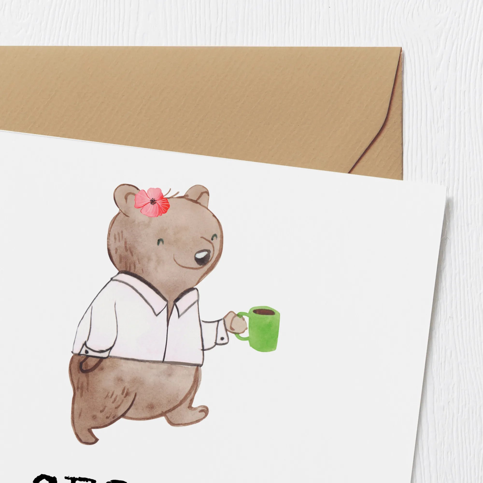 Die hochwertige Klappkarte besteht aus erstklassigem 300 Gramm Karton und hat die Maße 140 mm x 140 mm, was sie perfekt für individuelle Grüße und Glückwünsche macht. Die Vorderseite ziert ein süßer Bär mit einer Kaffeetasse, der ganz im Zeichen der Leidenschaft für den Beruf steht. Dieser kleine Bär bringt nicht nur ein Lächeln ins Gesicht, sondern zeigt auch Wertschätzung für die harte Arbeit des Chefs.