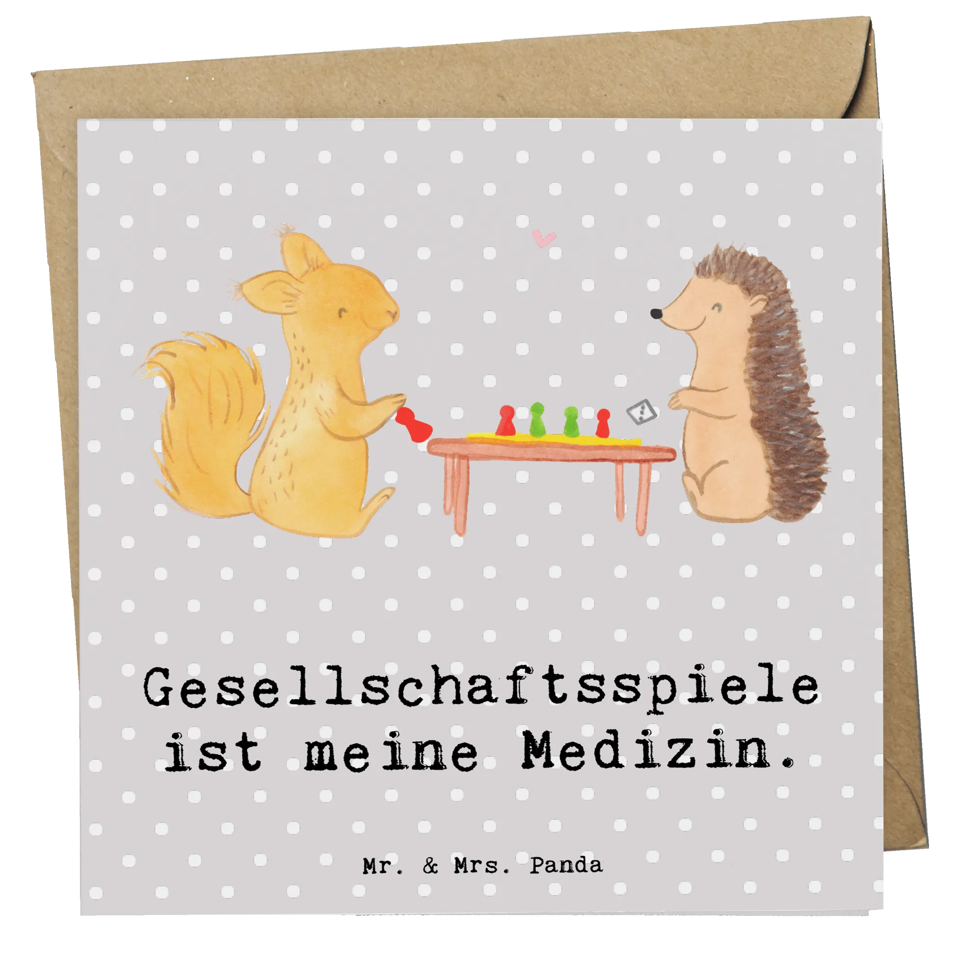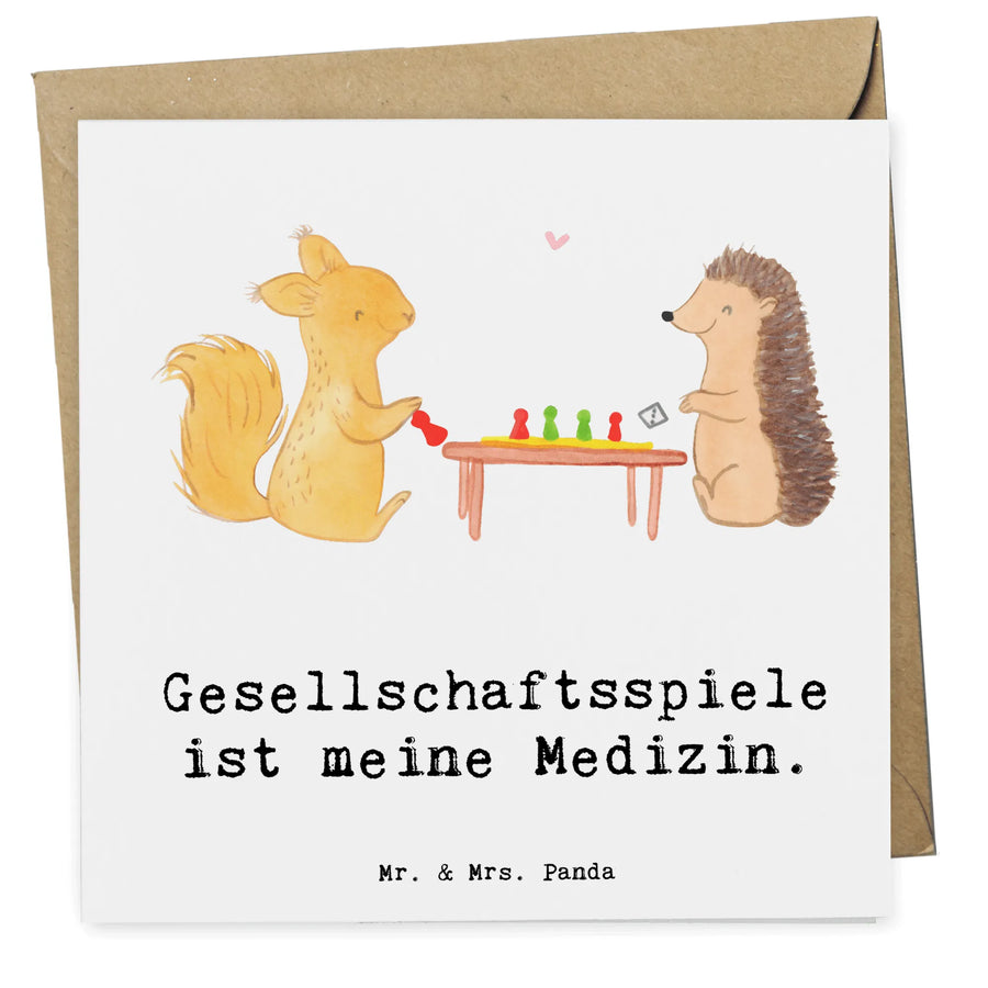 Die Deluxe Karte von Mr. & Mrs. Panda mit dem süßen Motiv "Eichhörnchen Gesellschaftsspiele Medizin" ist das perfekte Geschenk für alle, die Gesellschaftsspiele lieben. Diese hochwertige quadratische Karte misst 140 mm x 140 mm und ist aus edlem 300 Gramm Karton gefertigt.