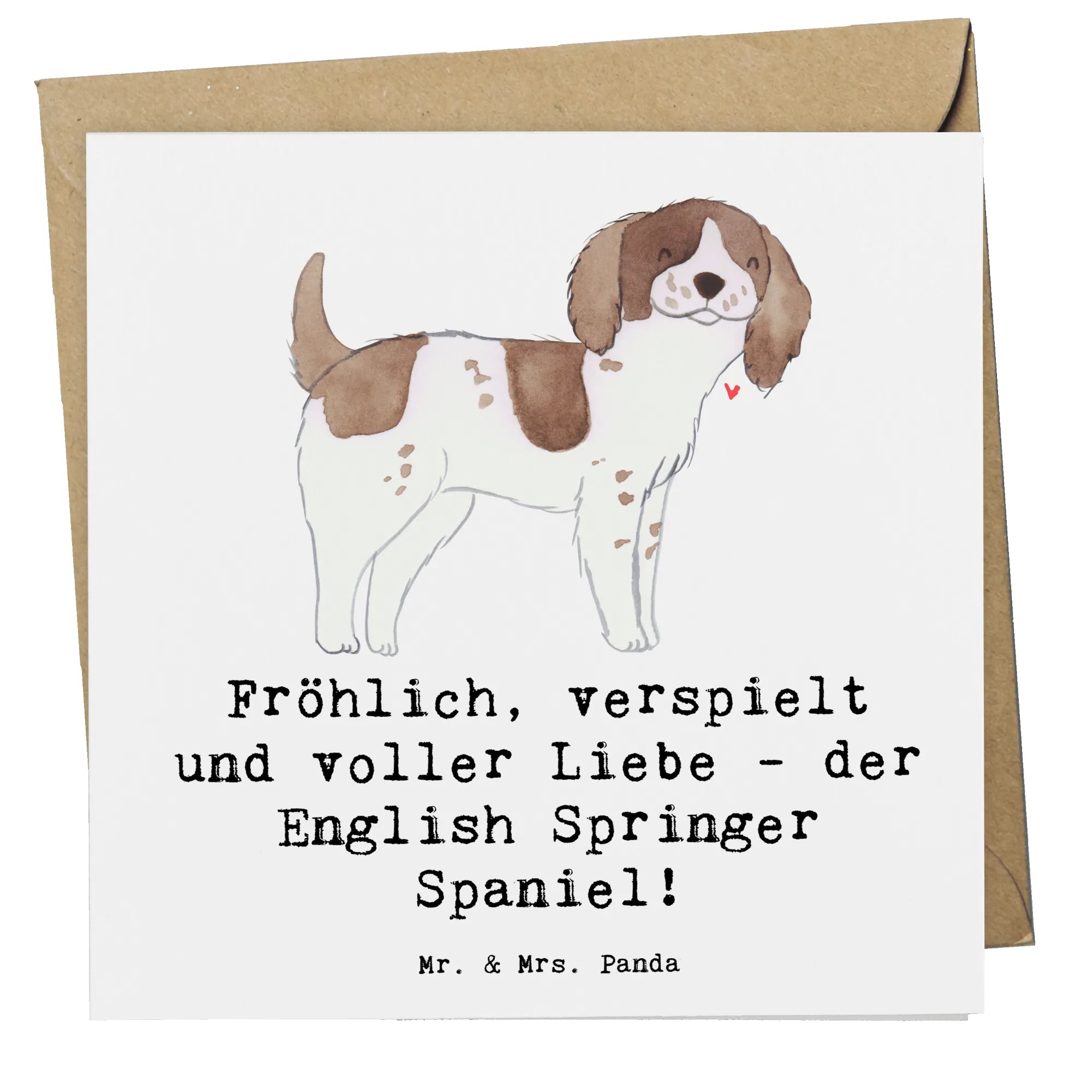 Die Deluxe Karte mit dem charmanten Motiv des English Springer Spaniels ist das perfekte Geschenk für jeden Hundeliebhaber. Diese wunderschöne und außergewöhnlich hochwertige quadratische Karte von Mr. & Mrs. Panda misst 140 mm x 140 mm und ist aus erstklassigem 300 Gramm Karton gefertigt. Mit ihrem fröhlichen und verspielten Design spricht sie das Herz einer jeden Person an, die die Hunderasse English Springer Spaniel liebt. Der Spruch "Fröhlich, verspielt und voller Liebe - der English Springer Spaniel!" ziert die Vorderseite der Karte und zaubert jedem ein Lächeln ins Gesicht.