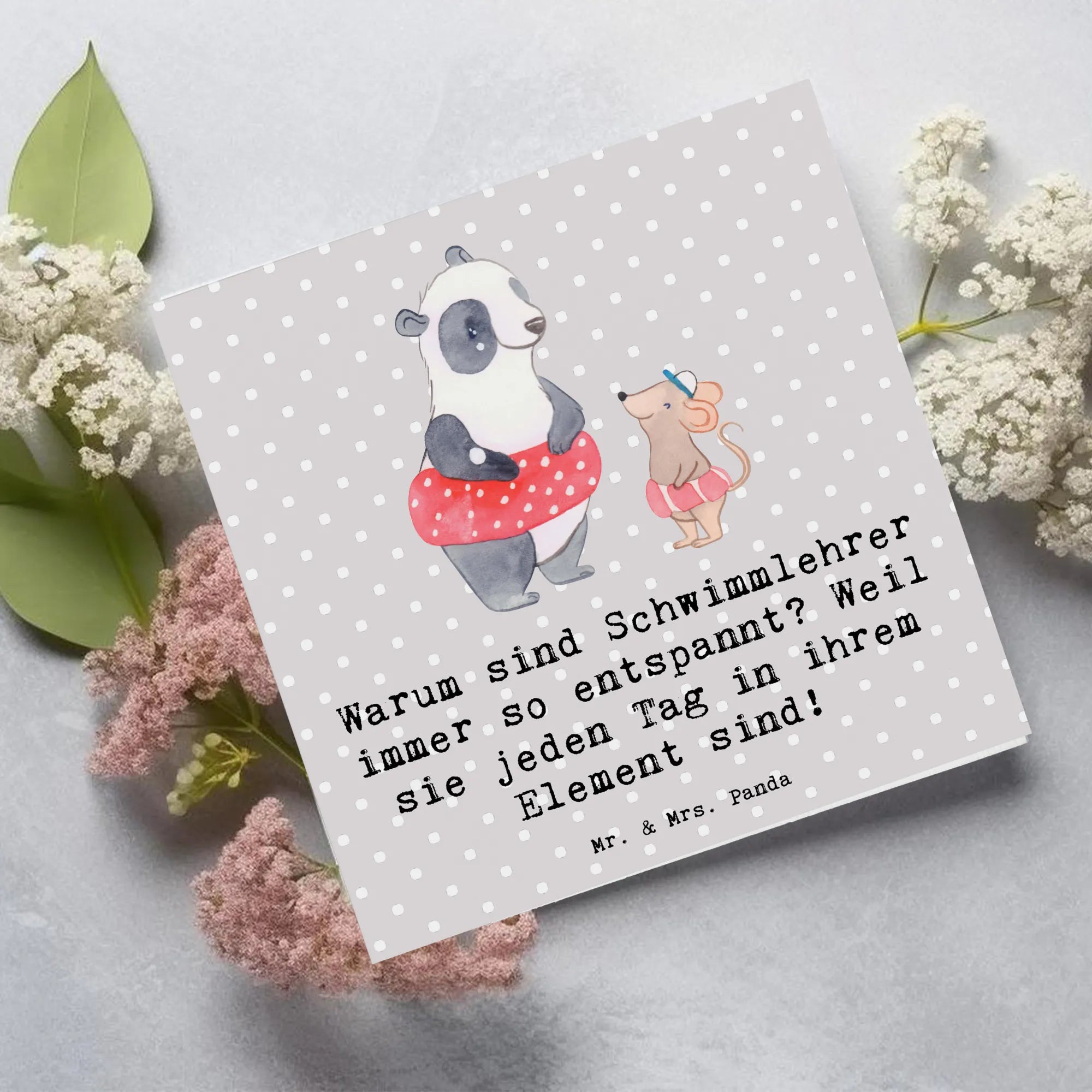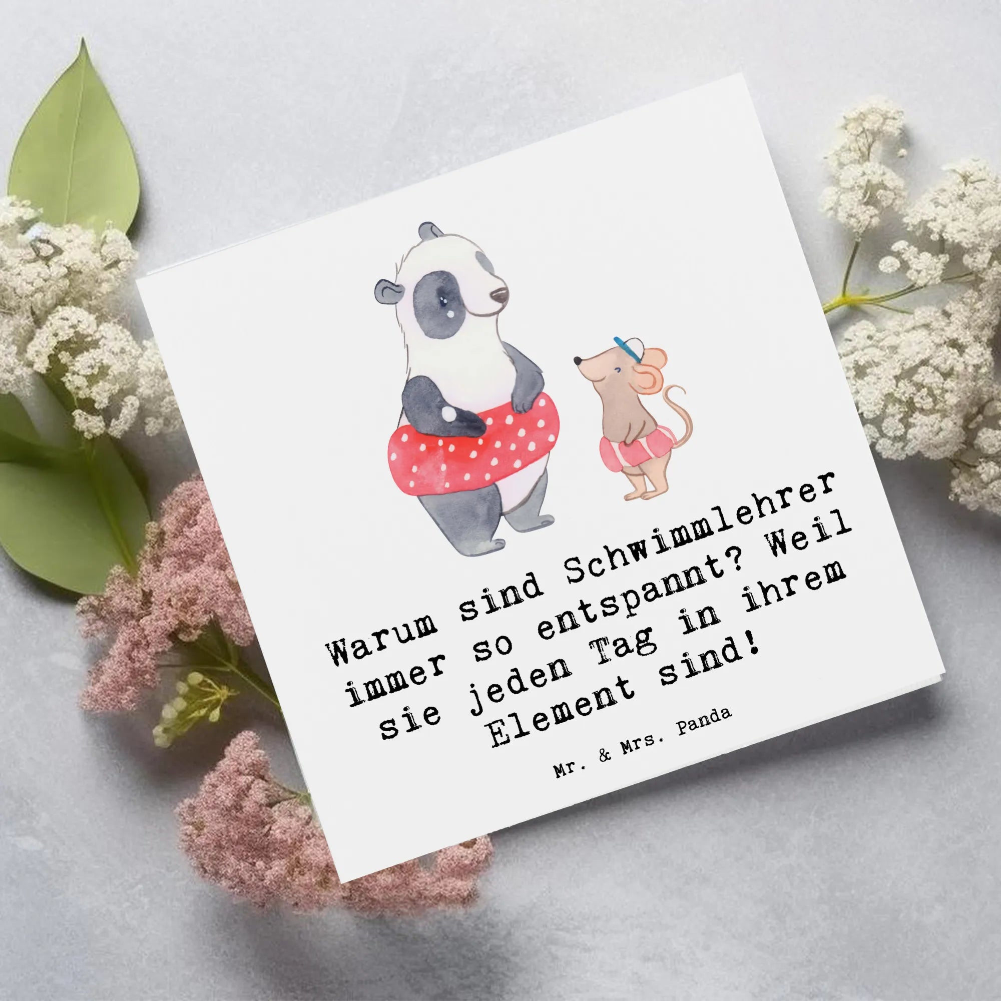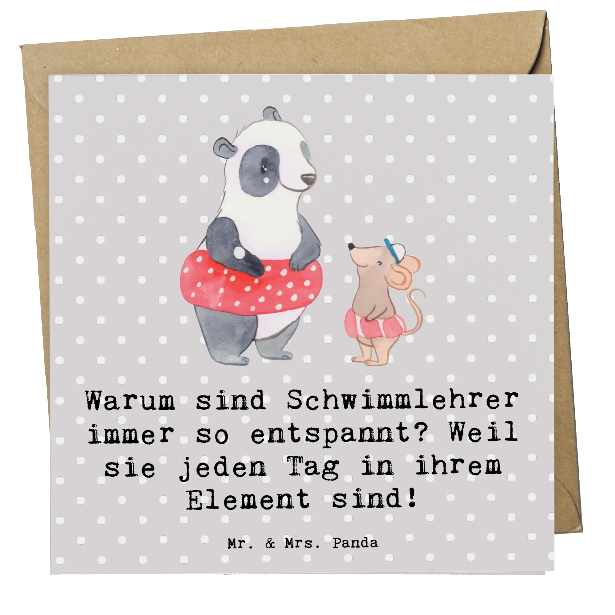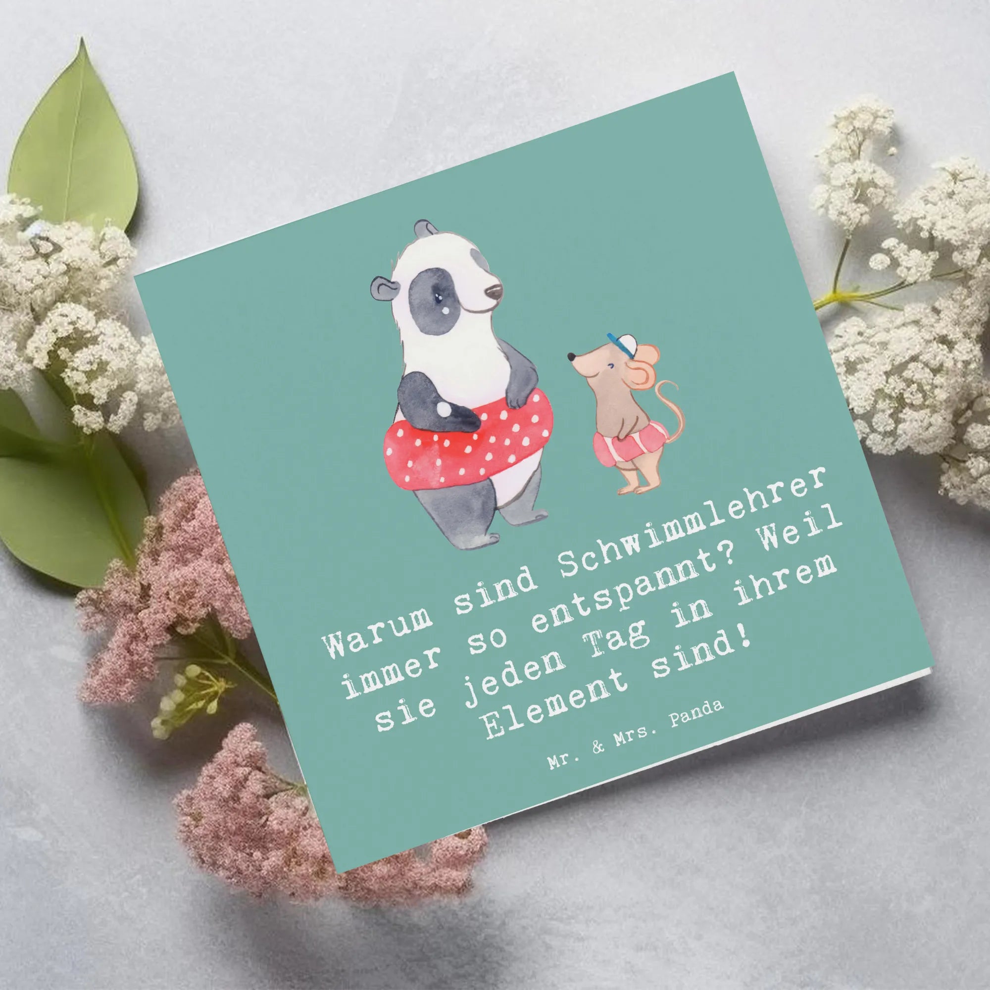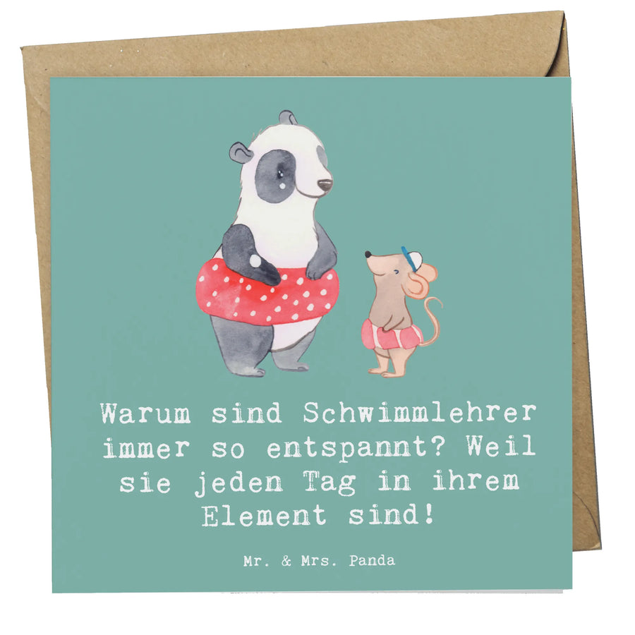 Die Deluxe Karte Schwimmlehrer aus der wundervollen Kollektion Berufe von Mr. & Mrs. Panda ist das perfekte Geschenk für alle, die das Element Wasser und das Lehren vereinen! Diese hochwertige Grußkarte ist nicht nur ein schöner Blickfang, sondern auch ideal, um Grüße oder Glückwünsche an einen Schwimmlehrer oder eine Schwimmlehrerin zu versenden. Mit dem humorvollen Slogan "Warum sind Schwimmlehrer immer so entspannt? Weil sie jeden Tag in ihrem Element sind!" bringt die Karte nicht nur ein Lächeln auf das Gesicht des Empfängers, sondern ist auch ein toller Gesprächspartner bei feierlichen Anlässen.