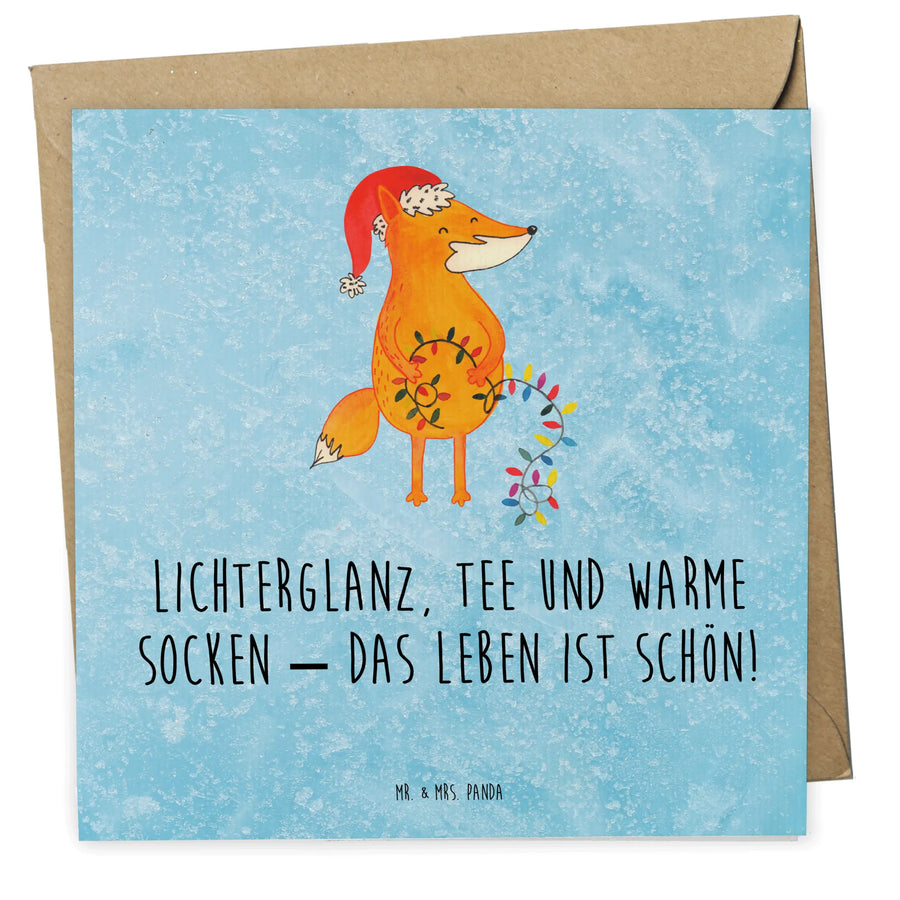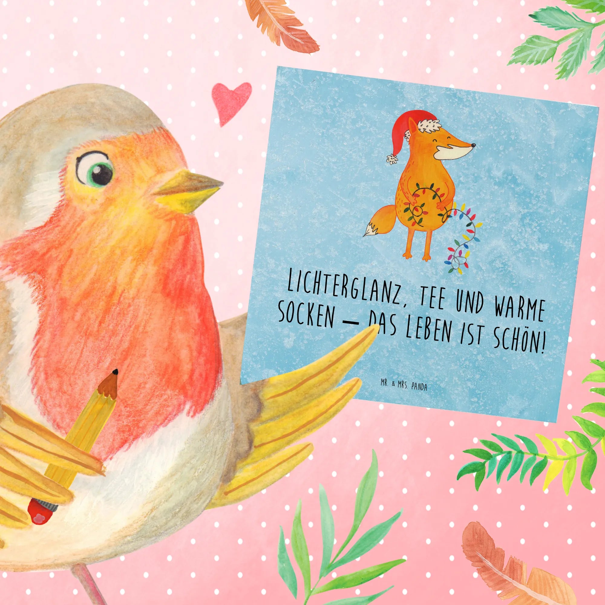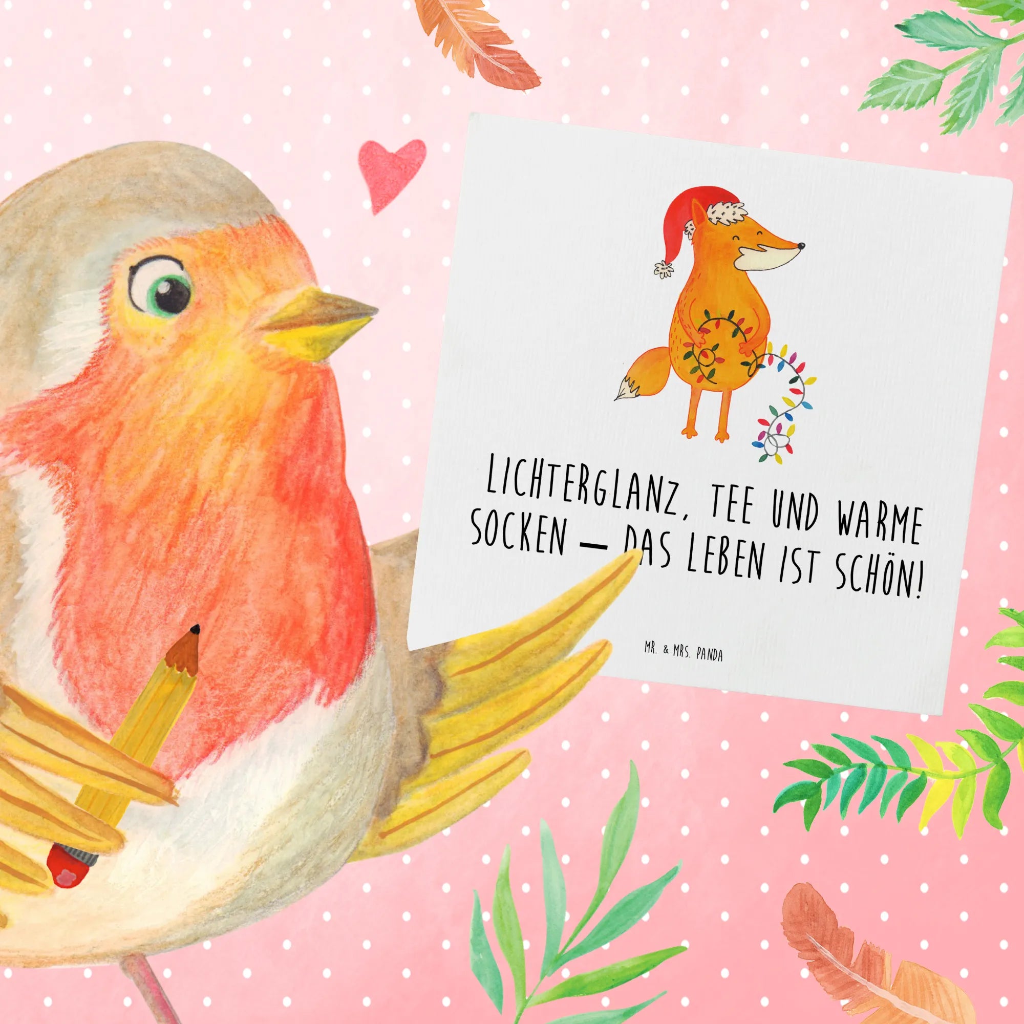 Die Deluxe Karte "Fuchs Weihnachten" aus der Winter Kollektion von Mr. & Mrs. Panda ist das perfekte Geschenk für die Weihnachtszeit! Wenn die ersten Schneeflocken fallen und der Duft von frisch gebackenen Plätzchen in der Luft liegt, dann wird es Zeit, seinen Liebsten eine besondere Freude zu bereiten. Diese hochwertige, quadratische Karte misst 140 mm x 140 mm und besticht durch ihr liebevolles Fuchs-Motiv, das handgezeichnet und mit viel Liebe zum Detail gestaltet wurde. Der fröhliche Fuchs mit seiner Weihnachtsmütze und der bunten Lichterkette bringt sofort festliche Stimmung in jedes Zuhause. Mit dem Spruch "Lichterglanz, Tee und warme Socken – das Leben ist schön!" ist sie ein ganz besonderer Gruß für die Weihnachtszeit.