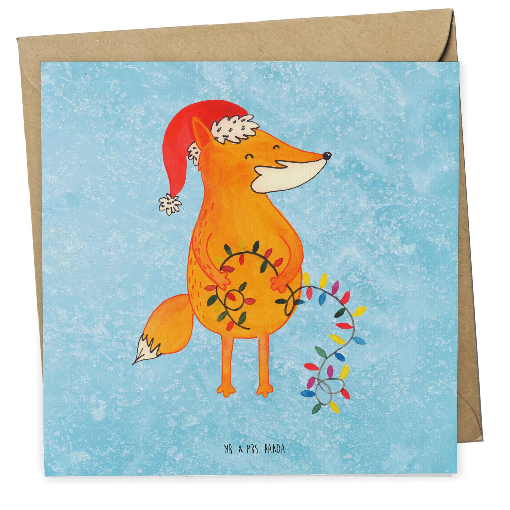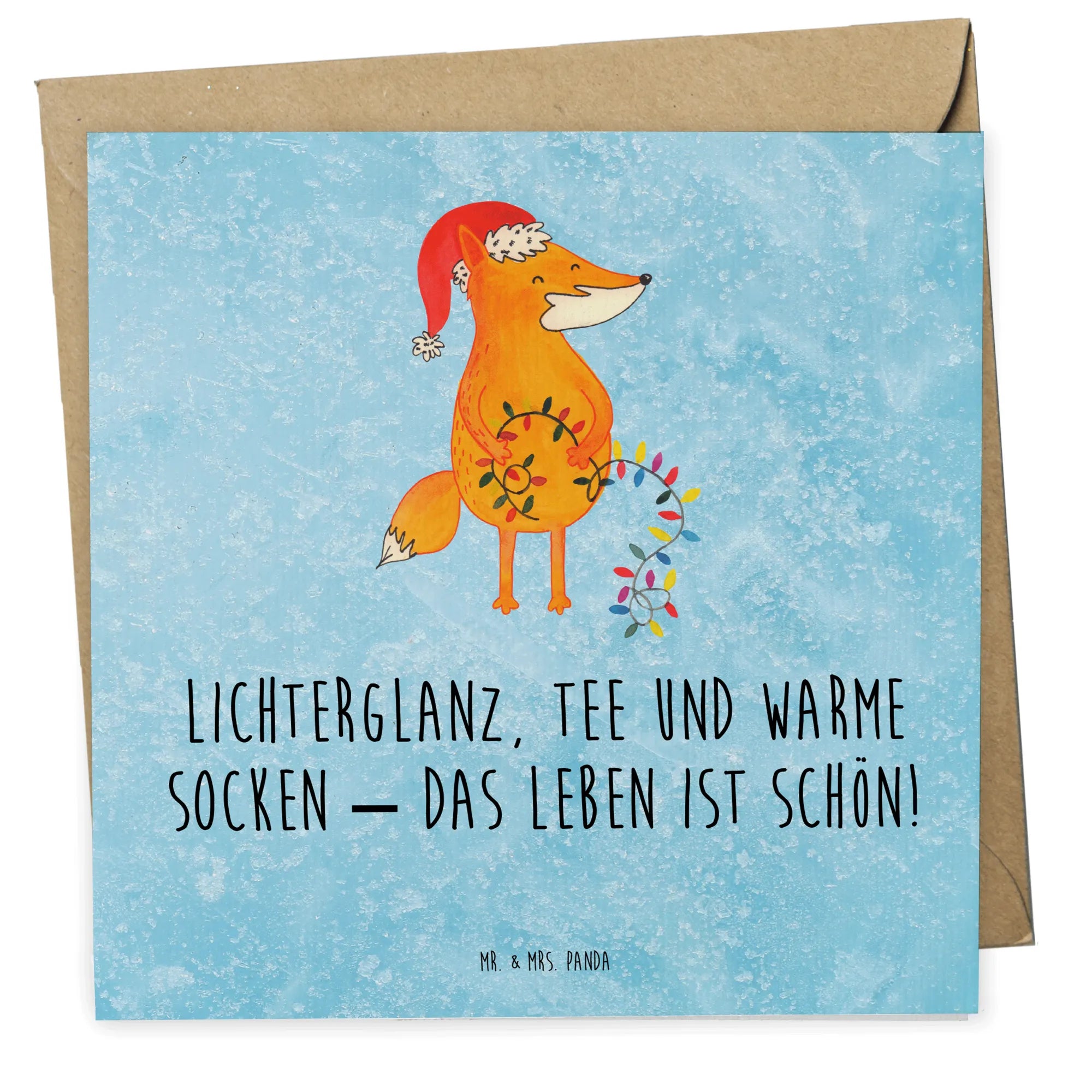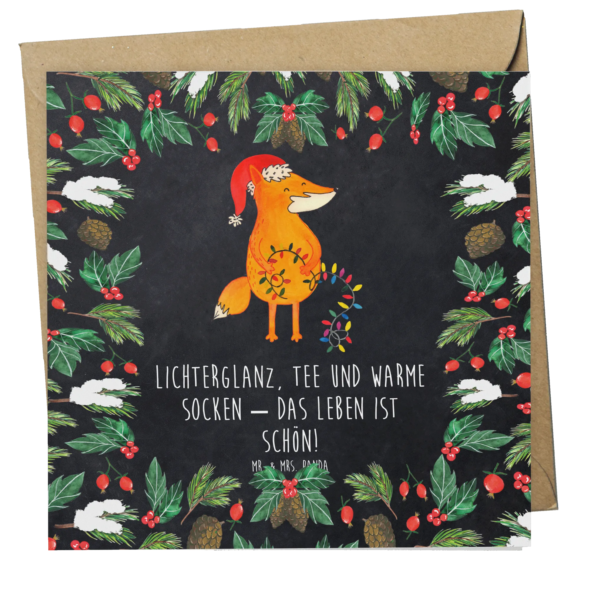 Die Deluxe Karte "Fuchs Weihnachten" aus der Winter Kollektion von Mr. & Mrs. Panda ist das perfekte Geschenk für die Weihnachtszeit! Wenn die ersten Schneeflocken fallen und der Duft von frisch gebackenen Plätzchen in der Luft liegt, dann wird es Zeit, seinen Liebsten eine besondere Freude zu bereiten. Diese hochwertige, quadratische Karte misst 140 mm x 140 mm und besticht durch ihr liebevolles Fuchs-Motiv, das handgezeichnet und mit viel Liebe zum Detail gestaltet wurde. Der fröhliche Fuchs mit seiner Weihnachtsmütze und der bunten Lichterkette bringt sofort festliche Stimmung in jedes Zuhause. Mit dem Spruch "Lichterglanz, Tee und warme Socken – das Leben ist schön!" ist sie ein ganz besonderer Gruß für die Weihnachtszeit.