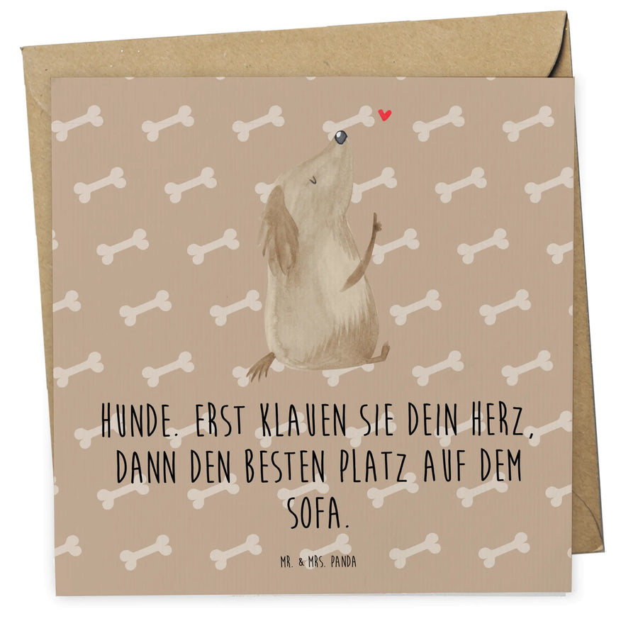 Egal ob zu einem Geburtstag, einer Hochzeit oder einfach als liebevolle Geste zwischendurch – mit dieser Karte wirst du garantiert Herzen erobern. Diese Karte besticht durch ihr süßes Hundemotiv, das einen entzückenden Hund zeigt, der auch noch ein kleines Herz präsentiert. So vermitteln die Worte "Hunde. Erst klauen sie dein Herz, dann den besten Platz auf dem Sofa." auf spielerische Art und Weise, was Hundeliebe wirklich bedeutet.