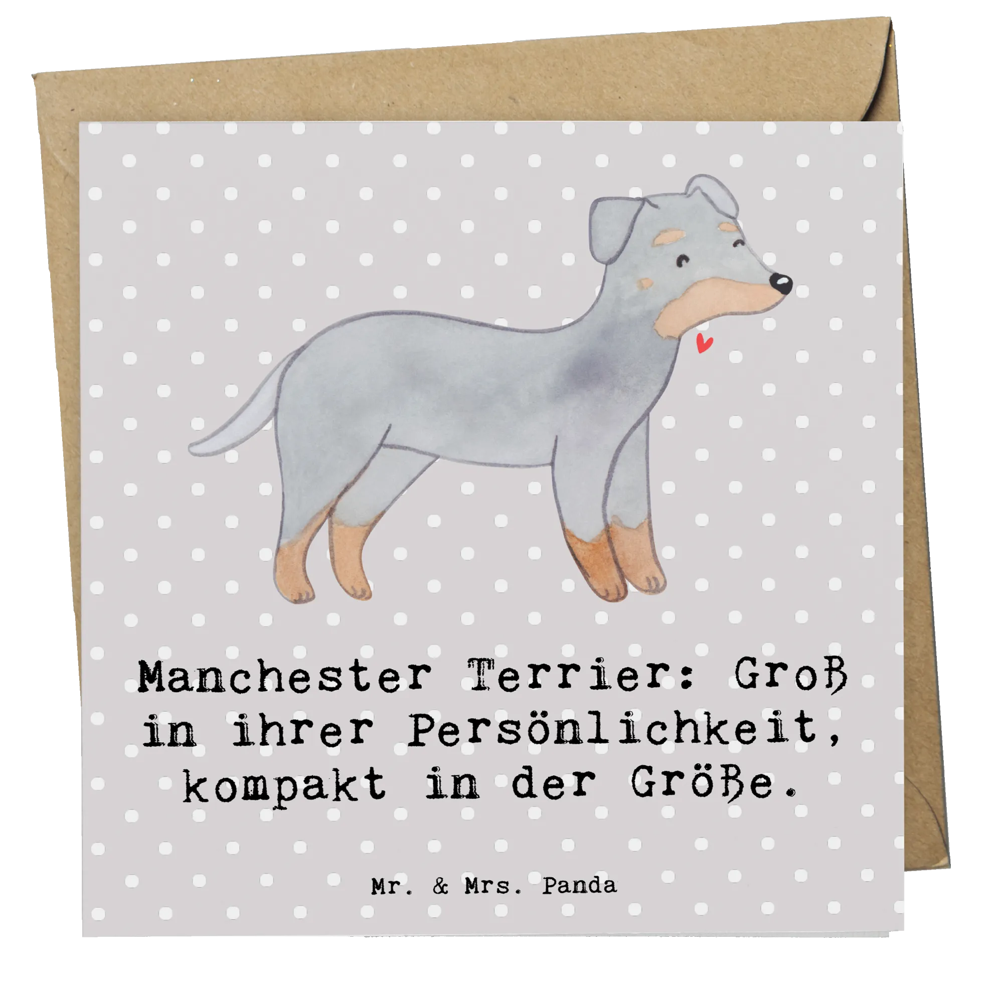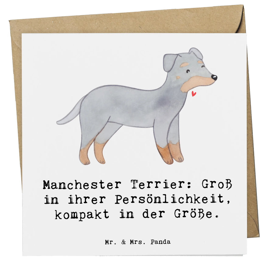 Die Deluxe Karte mit dem liebevollen Motiv des Manchester Terriers aus der Hunderassen-Kollektion von Mr. & Mrs. Panda ist das perfekte Geschenk für jeden Hundefan! Diese wundervolle, hochwertige quadratische Karte misst 140 mm x 140 mm und besteht aus edlem 300 Gramm Karton, der mit einem hochglänzenden Finish veredelt wurde. Die Vorderseite ziert der Spruch: "Manchester Terrier: Groß in ihrer Persönlichkeit, kompakt in der Größe." Diese liebevollen Worte passen perfekt zu diesem energiegeladenen und charmanten kleinen Hund.