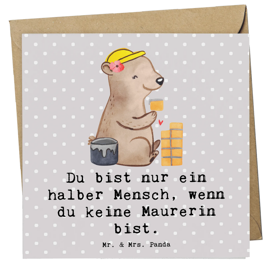 Die Karte hat die Maße 140 mm x 140 mm und besteht aus hochwertigem 300 Gramm Karton, der edel und robust ist. Ihr besonders designtes Motiv zeigt einen süßen Bär, der mit Liebe und Leidenschaft eine Mauer baut. Mit einem schildenden Herzen und dem Slogan "Du bist nur ein halber Mensch, wenn du keine Maurerin bist" wird diese Karte sicherlich ein Lächeln auf die Gesichter Deiner Freunde und Kollegen zaubern.