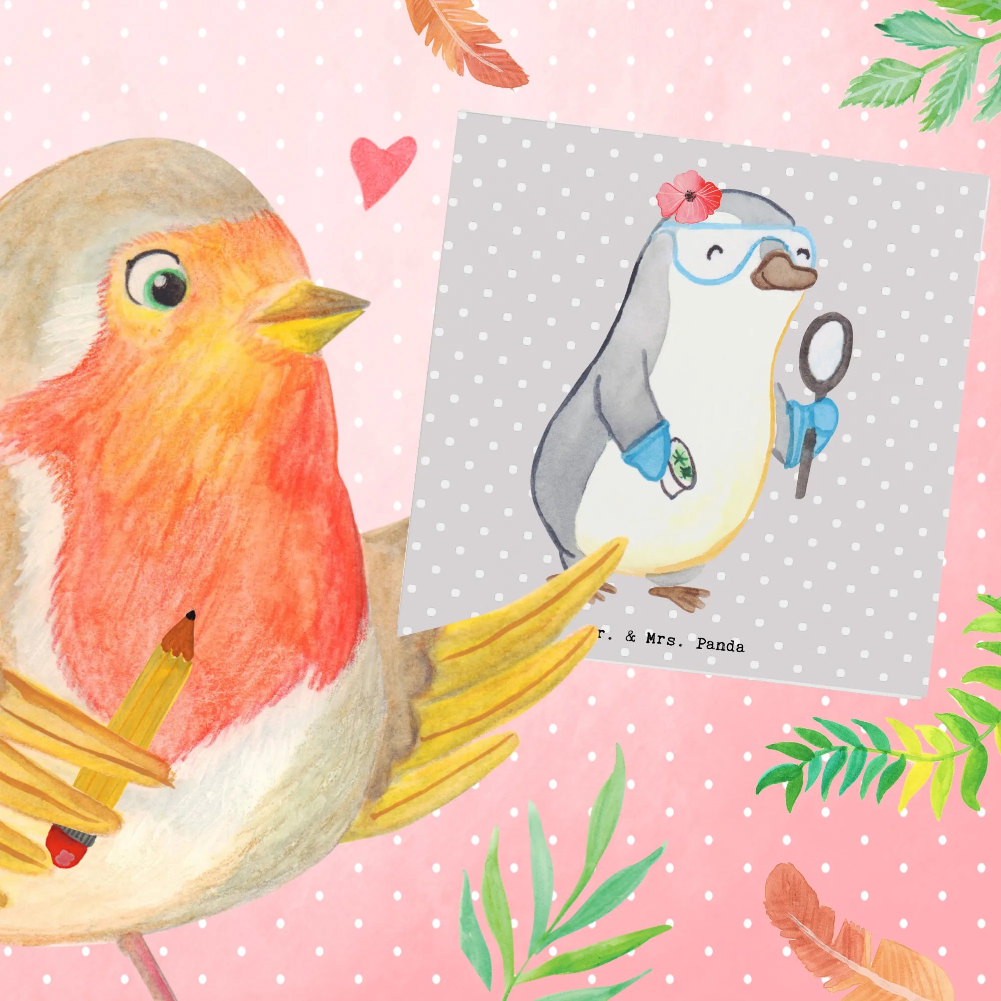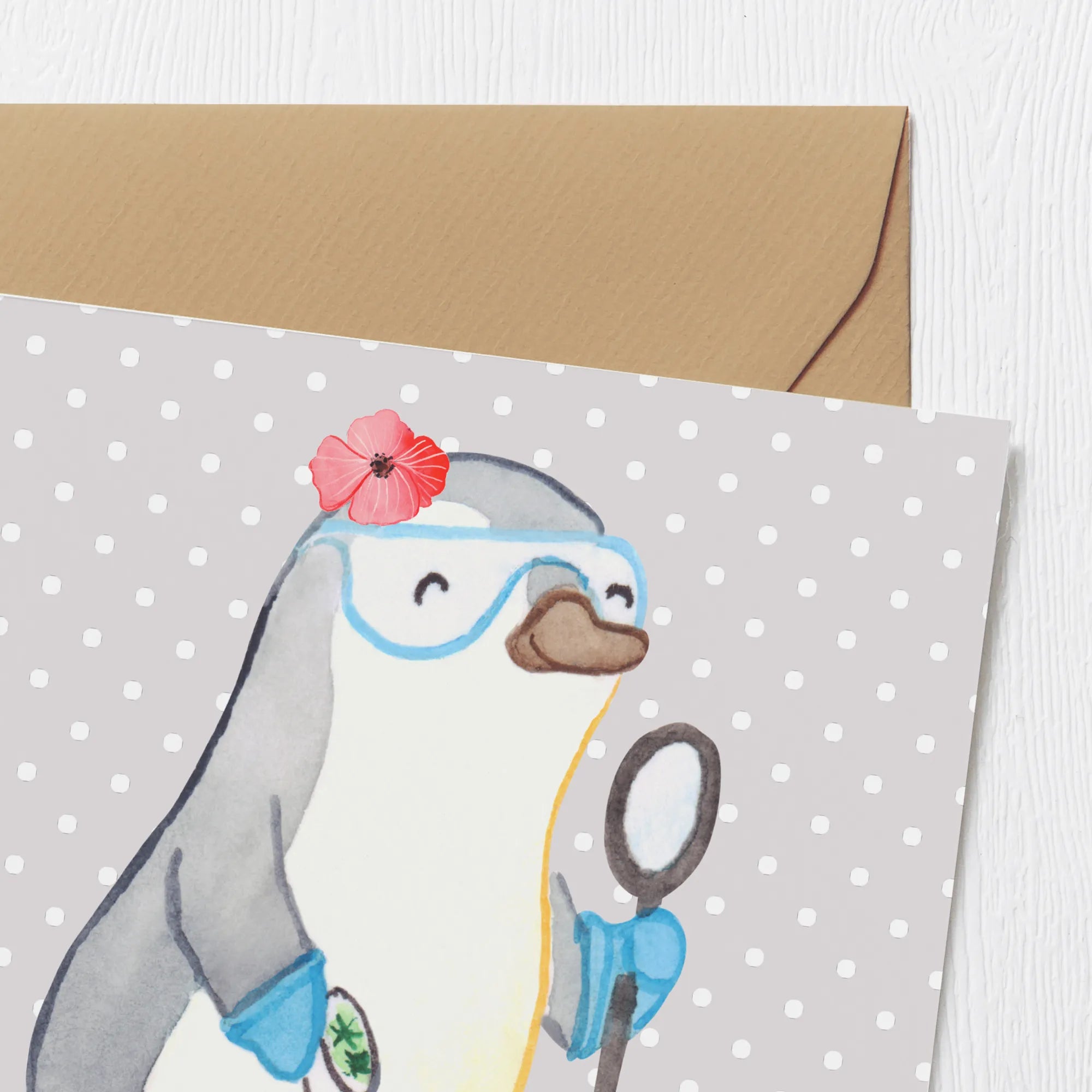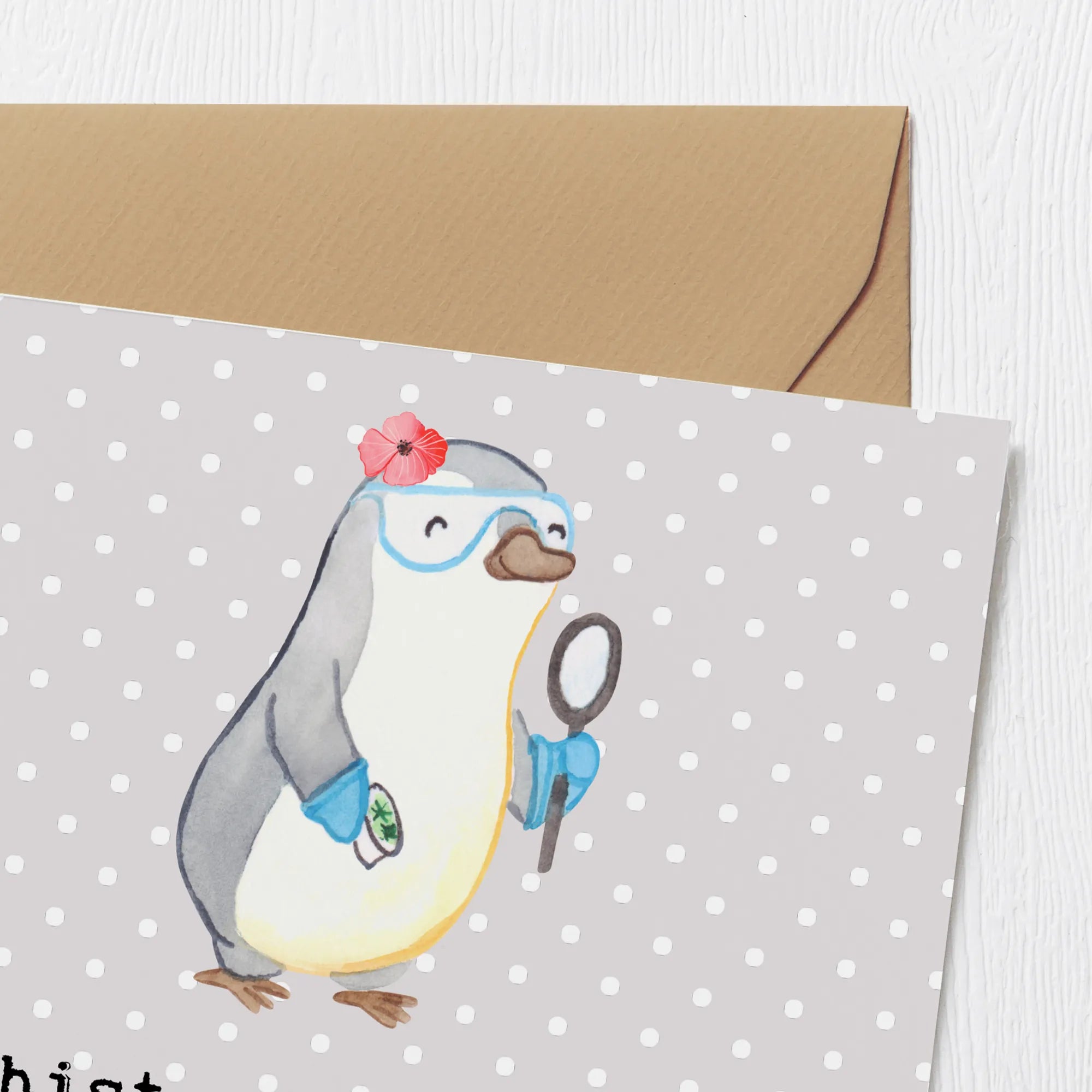 Lass dich von der niedlichen Pinguindame inspirieren, die als Mikrobiologin Mikroorganismen wie Viren und Bakterien erforscht. Diese Karte ist mit viel Liebe und Fantasie handgezeichnet und zeigt einen süßen Pinguin mit Handschuhen und Schutzbrille, der ein Reagenzglas in der Hand hält.