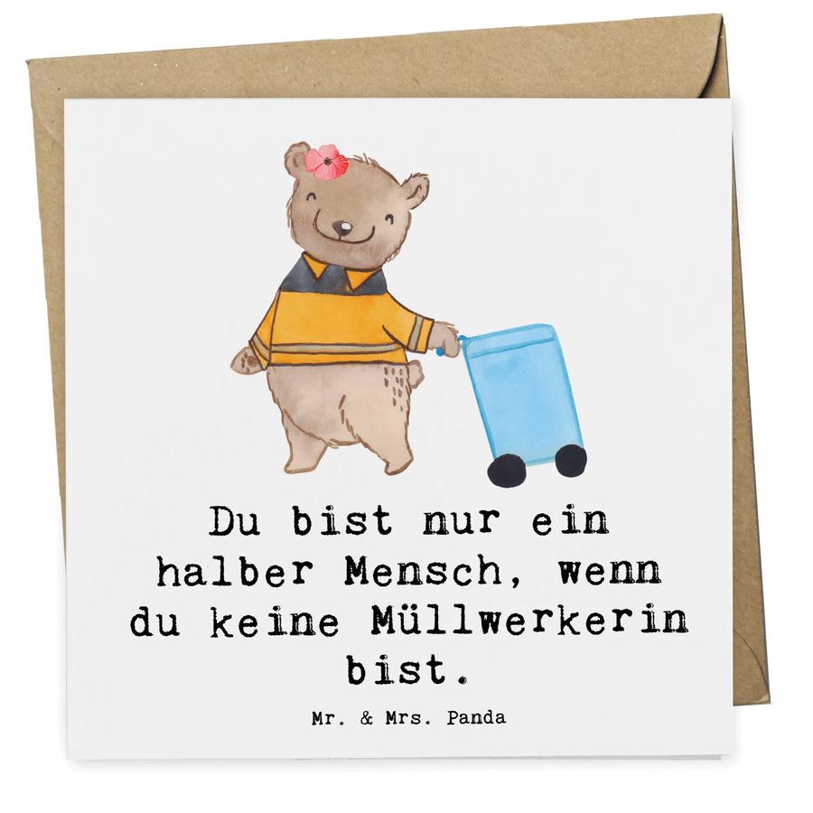 Das süße Motiv zeigt einen niedlichen Bären, der fröhlich eine Papiertonne hinter sich her zieht – ganz nach dem Motto "Du bist nur ein halber Mensch, wenn du keine Müllwerkerin bist". Dieses lustige und einfühlsame Zitat würdigt die wertvolle Arbeit von Müllwerkerinnen und Müllarbeitern, die oft im Hintergrund agieren und doch so wichtig für unsere Community sind. Die liebevollen Designs von Mr. & Mrs. Panda wurden mit viel Freude ins Leben gerufen und sind mit Aquarell-Technik handgezeichnet. Für Berufstätige oder Menschen, die in der Kreislauf- und Abfallwirtschaft arbeiten, ist diese Karte eine großartige Möglichkeit, Wertschätzung zu zeigen.