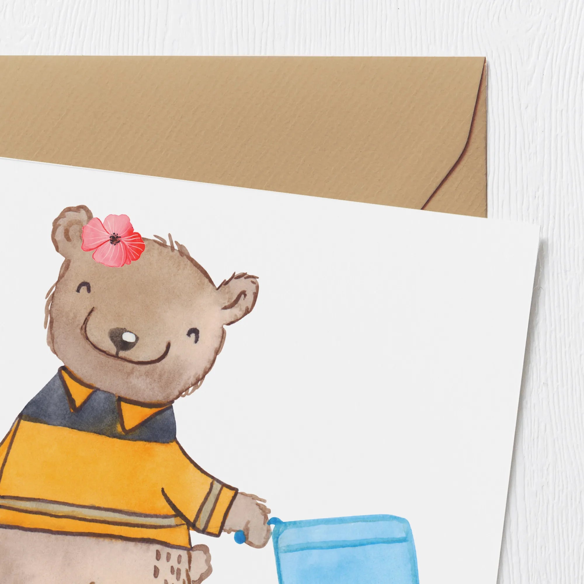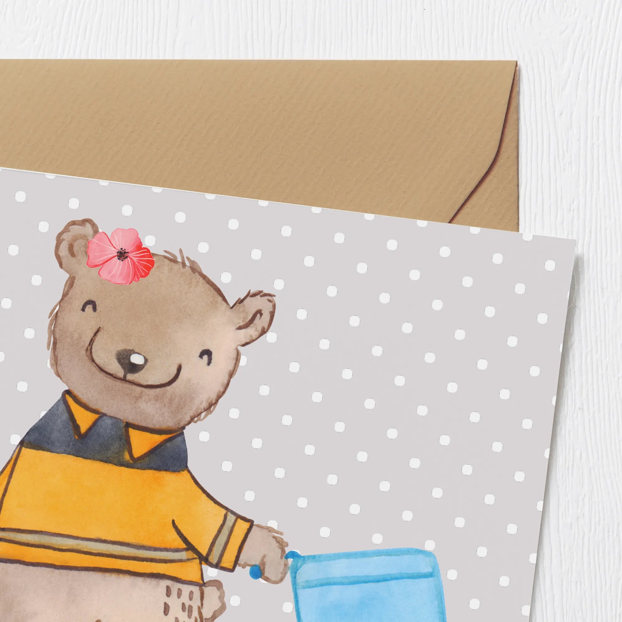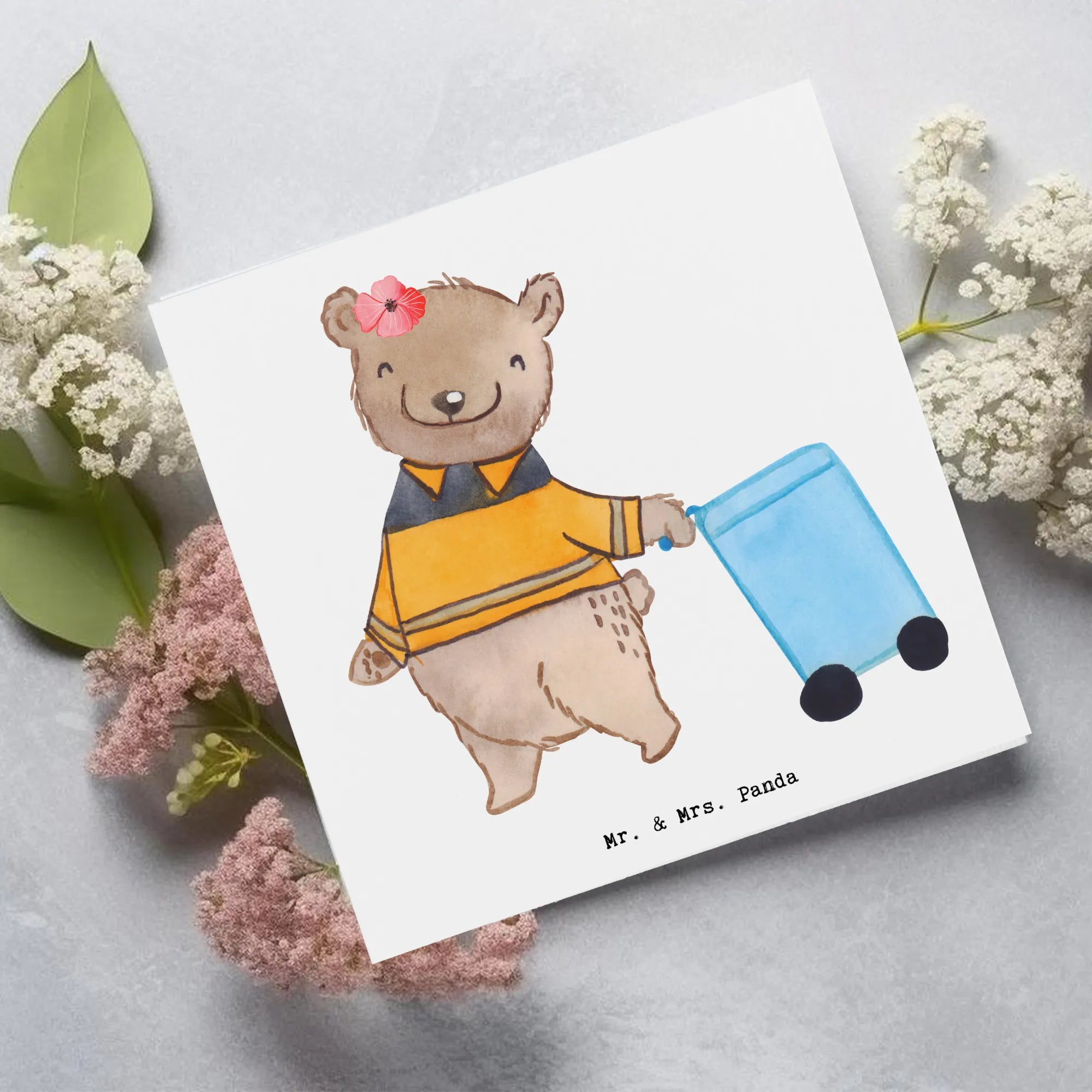 Diese kleine Bärendame zieht fröhlich eine Papiertonne hinter sich her und symbolisiert damit die wichtige Arbeit, die die Müllwerkerinnen täglich leisten. Sie kreiert Geschenke, die die Anerkennung zeigen, die diesem Beruf oft fehlt. Ob zum Geburtstag, zur Hochzeit, zum Jubiläum oder sogar zum Abschied – diese Karte ist eine liebevolle Möglichkeit, Danke zu sagen oder einfach nur gute Wünsche zu übermitteln.