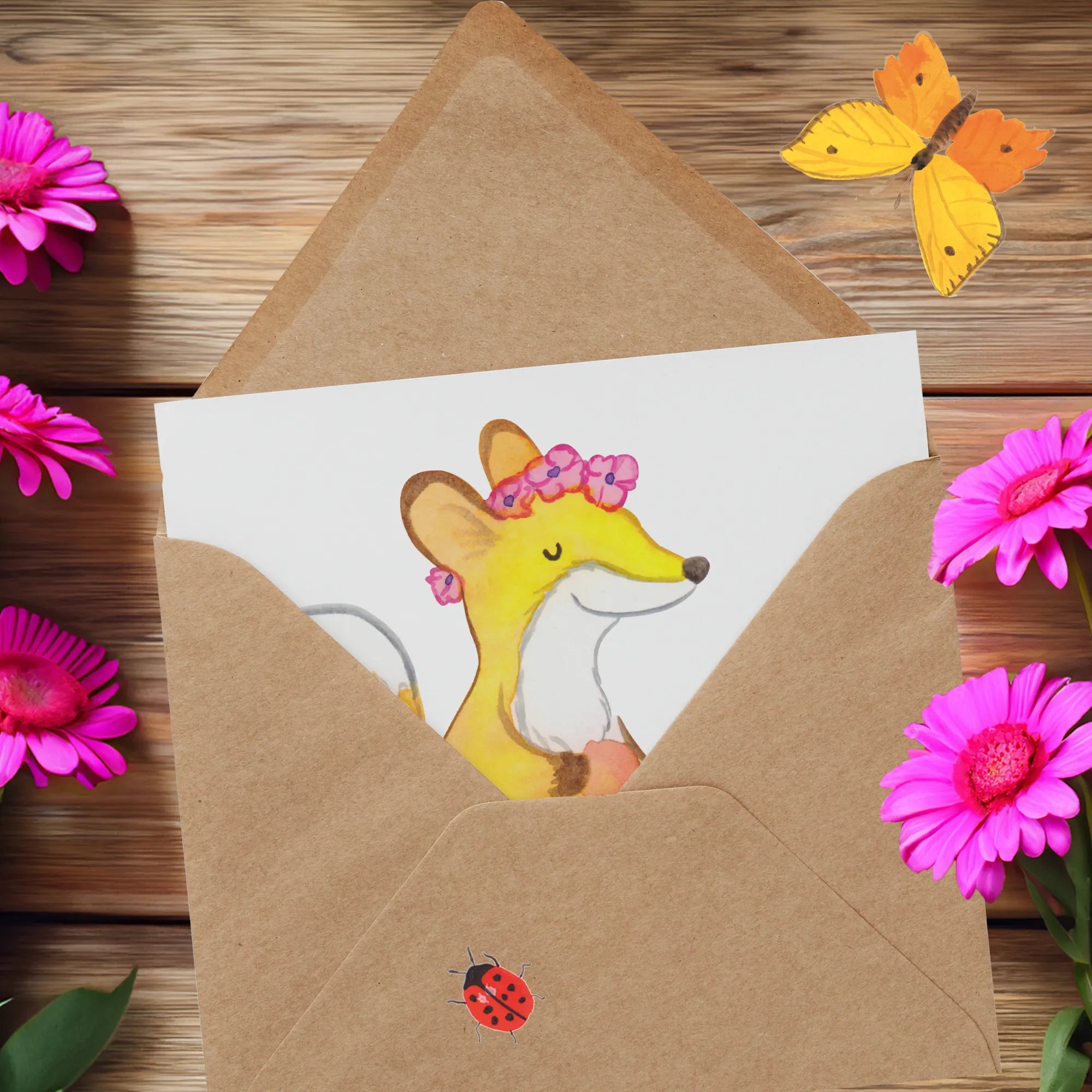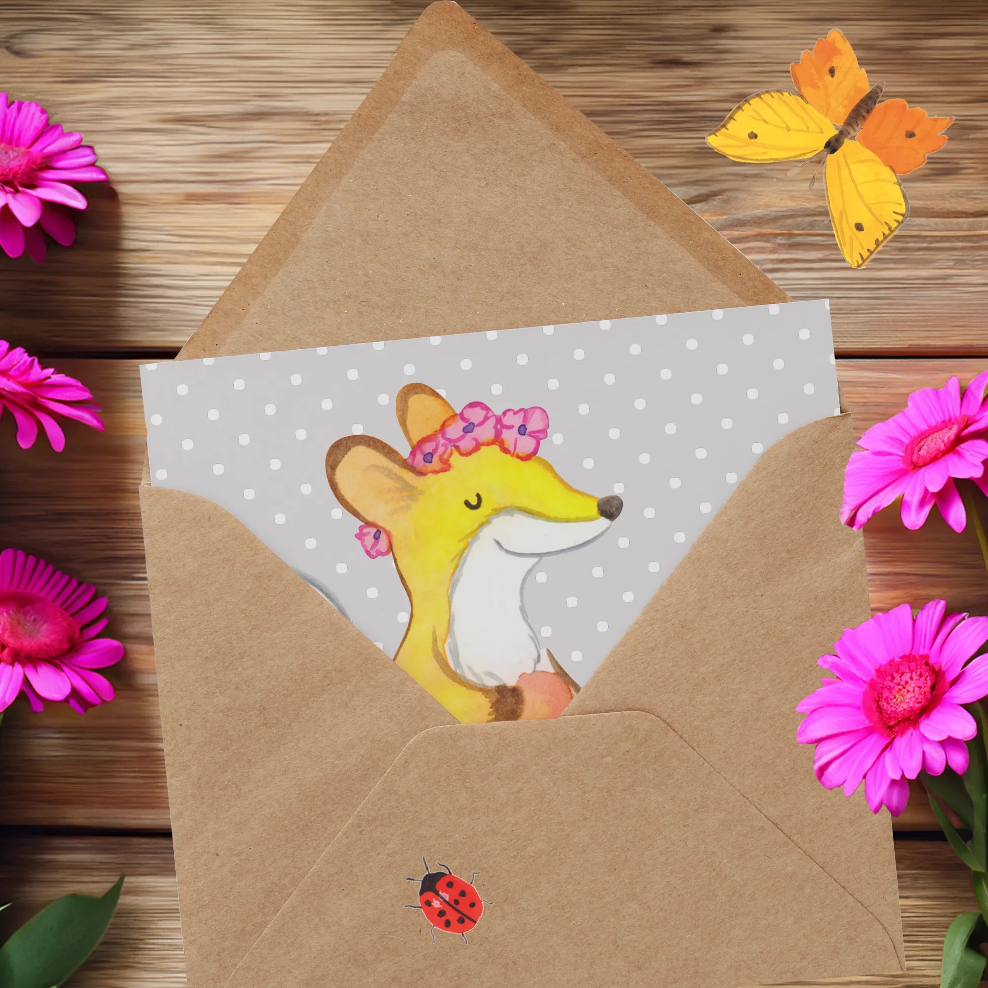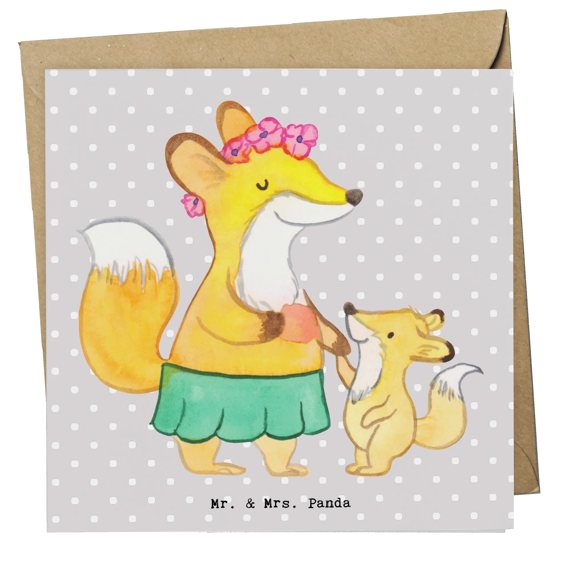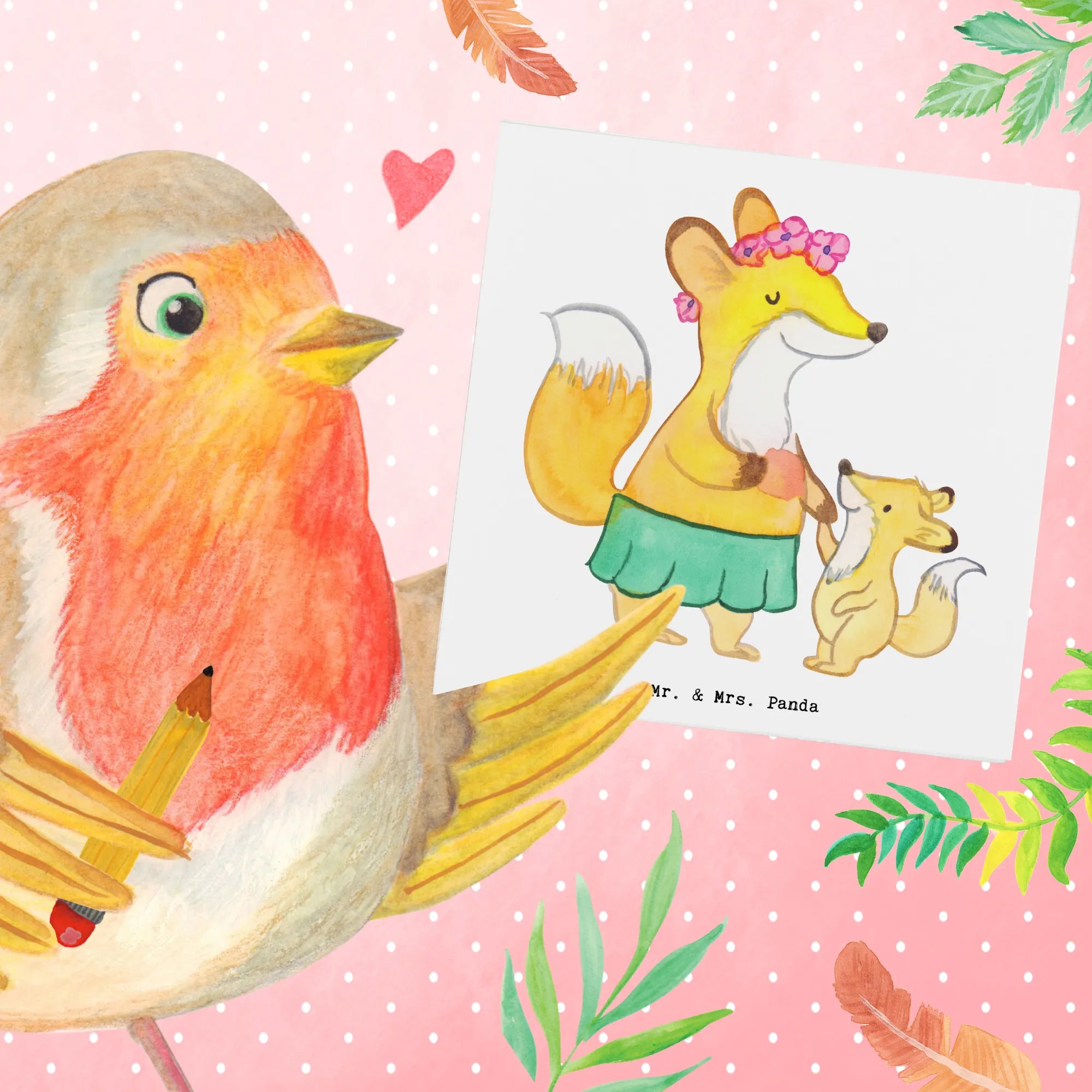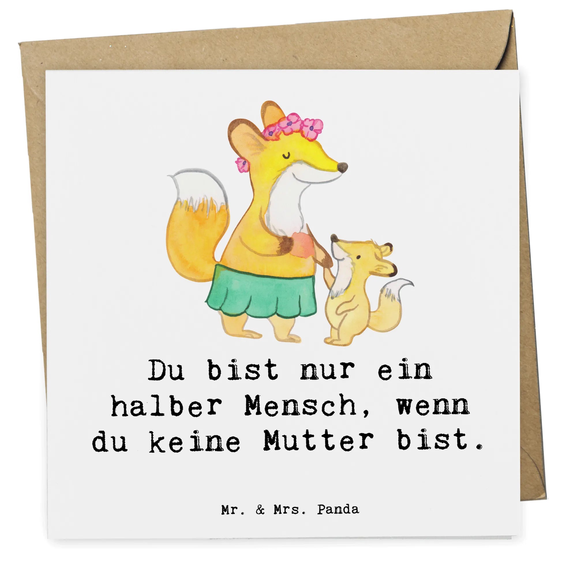Die Karte misst 140 mm x 140 mm und ist aus hochwertigem 300 Gramm Karton gefertigt, was ihr eine edle und robuste Haptik verleiht. Das wundervolle Design zeigt einen süßen Fuchs mit Blumen auf dem Kopf, der ein fröhliches Fuchs-Kind an der Hand hält. Über dem Motiv strahlt der Spruch "Du bist nur ein halber Mensch, wenn du keine Mutter bist." Dieses Motto bringt nicht nur ein Lächeln auf die Lippen, sondern trifft auch direkt ins Herz.