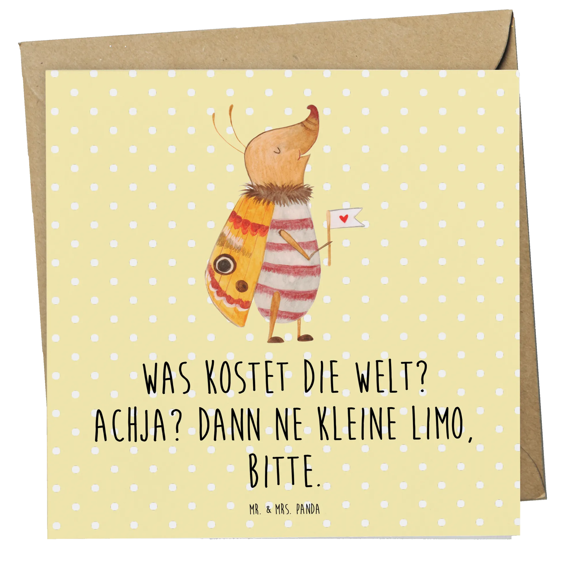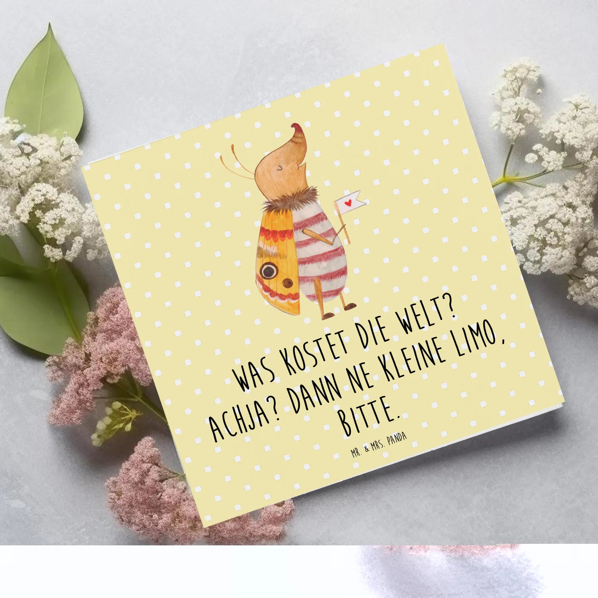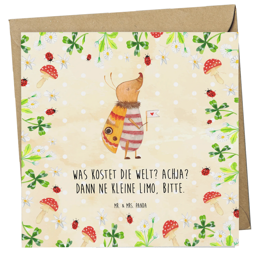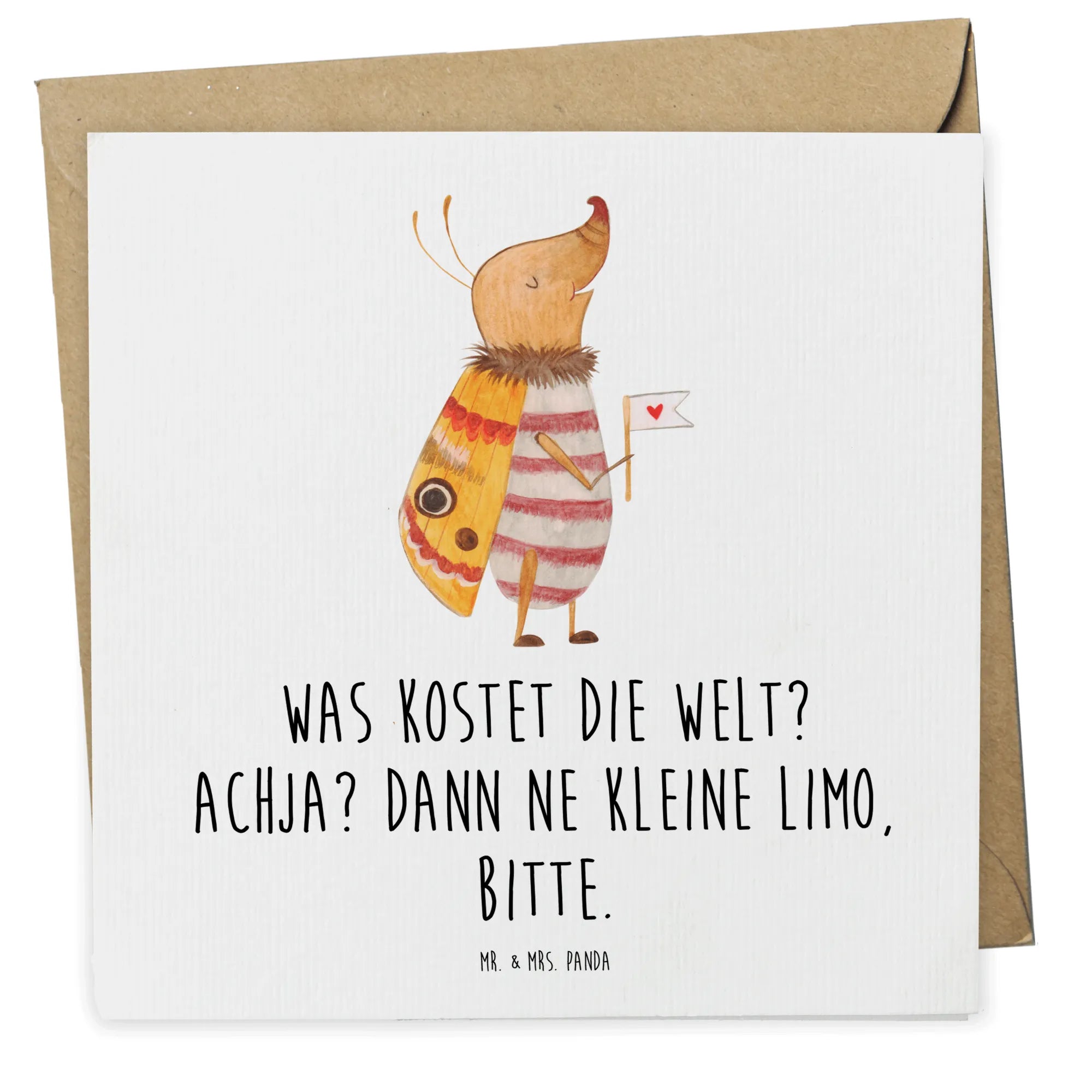 Die einzigartige Mischung aus Tiermotiven wie dem Nachtfalter und dem lustigen Spruch "Was kostet die Welt? Achja? Dann ne kleine Limo, bitte." sorgt dafür, dass jeder Empfänger beim Lesen ein Lächeln auf den Lippen hat.
