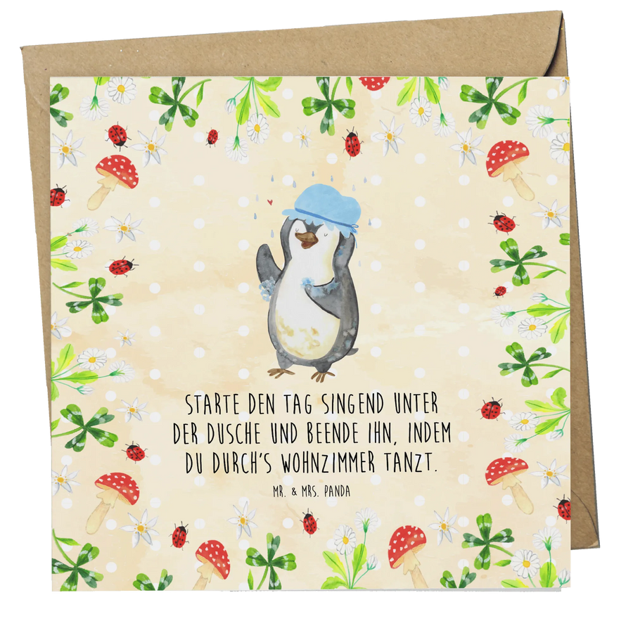 Entdecke die zauberhafte Deluxe Karte mit dem witzigen Pinguin, der fröhlich unter der Dusche steht! Diese wunderschöne, quadratische Grußkarte von Mr. & Mrs. Panda bringt Freude und Motivation in dein Leben und in das Leben der Menschen, denen du sie schenkst. Der Pinguin mit Duschhaube, der trotz Regen gute Laune versprüht, ist nicht nur ein Blickfang, sondern auch eine erheiternde Botschaft: "Starte den Tag singend unter der Dusche und beende ihn, indem du durch's Wohnzimmer tanzt!"