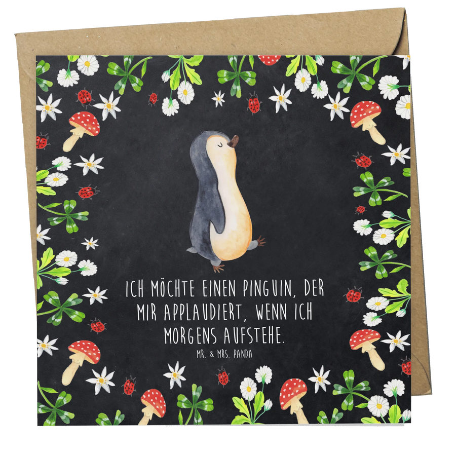 Der marschierende Pinguin auf der Vorderseite strahlt Freude und Lebenslust aus – genau der richtige Begleiter, um den Tag zu begrüßen oder um jemandem ein Lächeln ins Gesicht zu zaubern! Sein charmantes und verspielt-tollpatschiges Wesen wird nicht nur alle Blicke auf sich ziehen, sondern auch die Herzen Deiner Freunde und Familie erobern. Der Slogan 'Ich möchte einen Pinguin, der mir applaudiert, wenn ich morgens aufstehe.' bringt die unkomplizierte und witzige Art von Mr. & Mrs. Panda perfekt zur Geltung und macht die Karte zu etwas Besonderem.