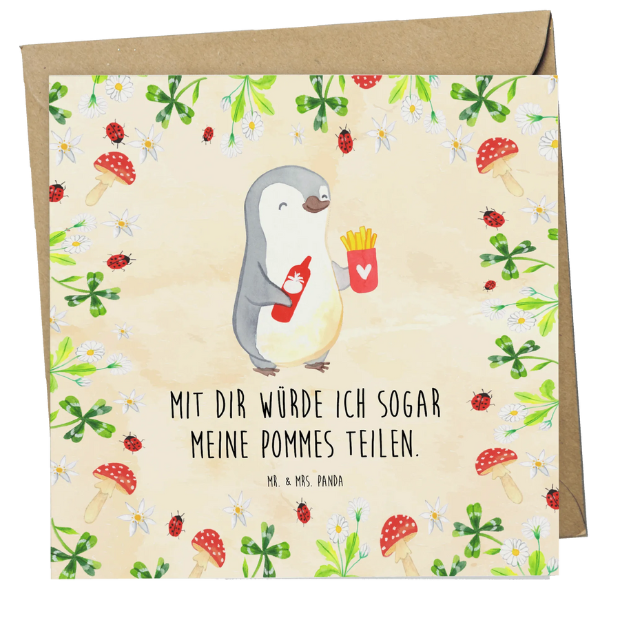 Die Karte hat eine edle Karton-Optik und misst 140 mm x 140 mm. Mit ihrem liebevoll gestalteten Pinguin-Motiv, der mit Pommes Frites und einer roten Ketchup-Flasche posiert, strahlt sie pure Freude aus. Der Slogan "Mit dir würde ich sogar meine Pommes teilen" bringt nicht nur ein Lächeln auf die Lippen, sondern sorgt auch für Schmetterlinge im Bauch.